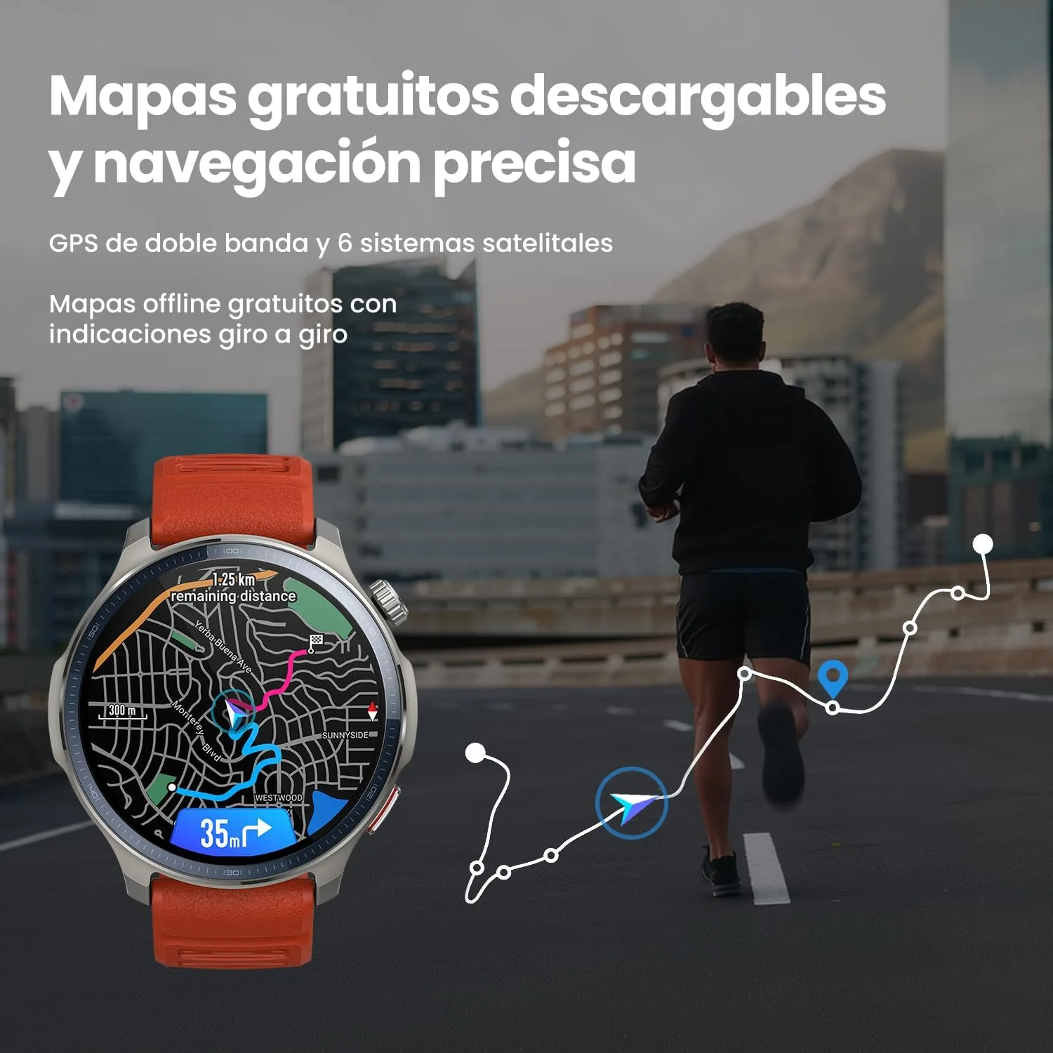 GPS líder y mapas offline: El reloj inteligente smartwatch Balance 2 rastrea tus movimientos con precisión gracias al soporte de doble banda y seis sistemas satelitales. Descarga mapas gratis y recibe indicaciones giro a giro.