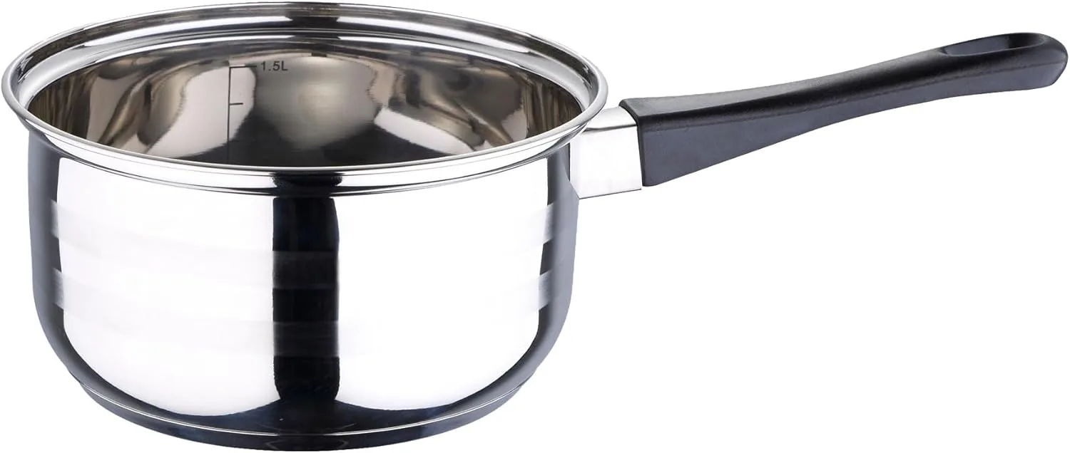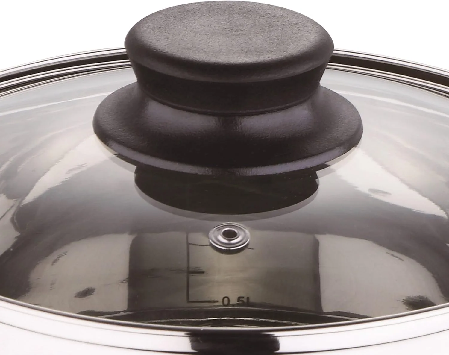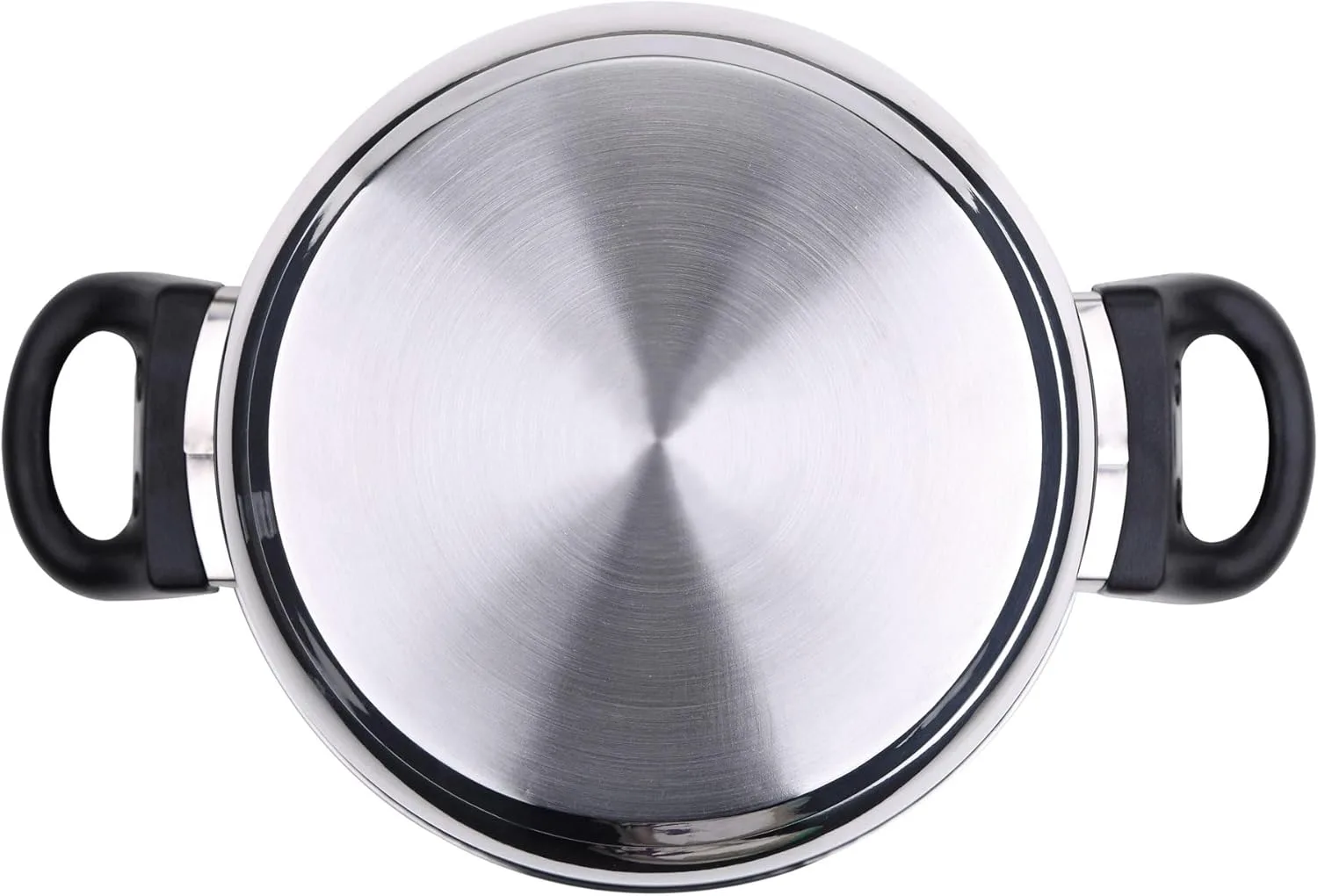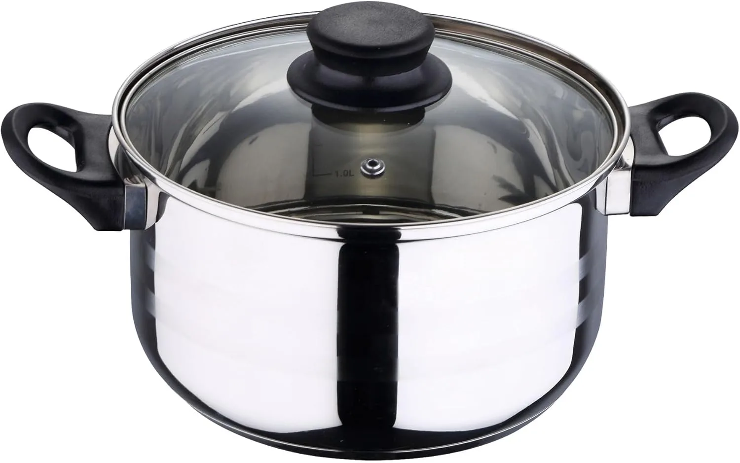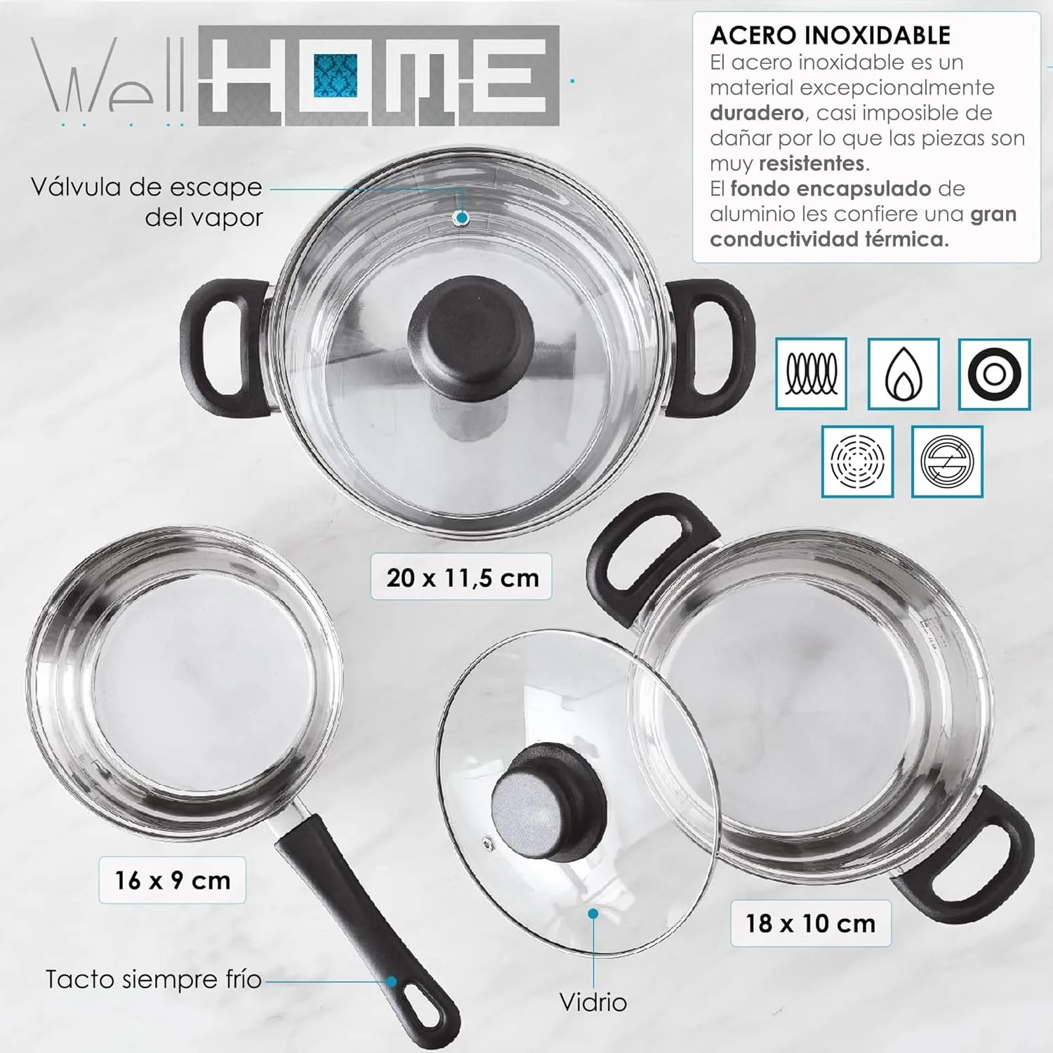 El set de baterías ha sido elaborado en acero inoxidable de alta calidad para ofrecer una pieza de gran durabilidad y con una larga vida util. Ofrece un conjunto de piezas para equipar nuestra coicna de la mejor manera y con la mejor calidad con un acabado recto. la base incorpora un fondo de inducción que permite una rápida y óptima distribución del calor por toda la pieza. Este fondo es compatibe con todas las cocinas del mercado, incluidas las de inducción. Sus piezas son de fácil manejo gracias a su mango ergonómico y resistente al calor que ofrece un agarre más cómodo y seguro de la pieza. Las tapas de este moderlo permiten la visibilidad de los alimentos gracias a estár fabricadas en cristal. Apta su limpieza en el lavavajillas. Se compone de: Cazo sin tapa 16 x 9 (+/-0.5)cm, olla 18 x 10cm, con tapa de vidrio con válvula de escape para el vapor, olla 20 x 11,5cm con tapa de vidrio con válvula de escape para el vapor