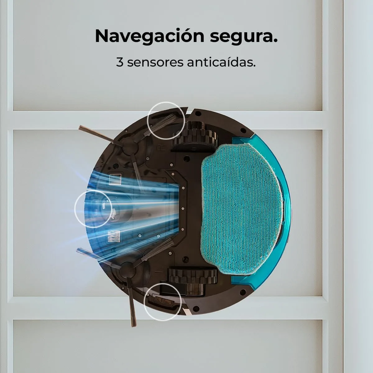 Máxima eficacia en los bordes: Sus dos cepillos laterales recogen la suciedad de forma precisa, alcanzando esquinas y bordes con mayor eficiencia.