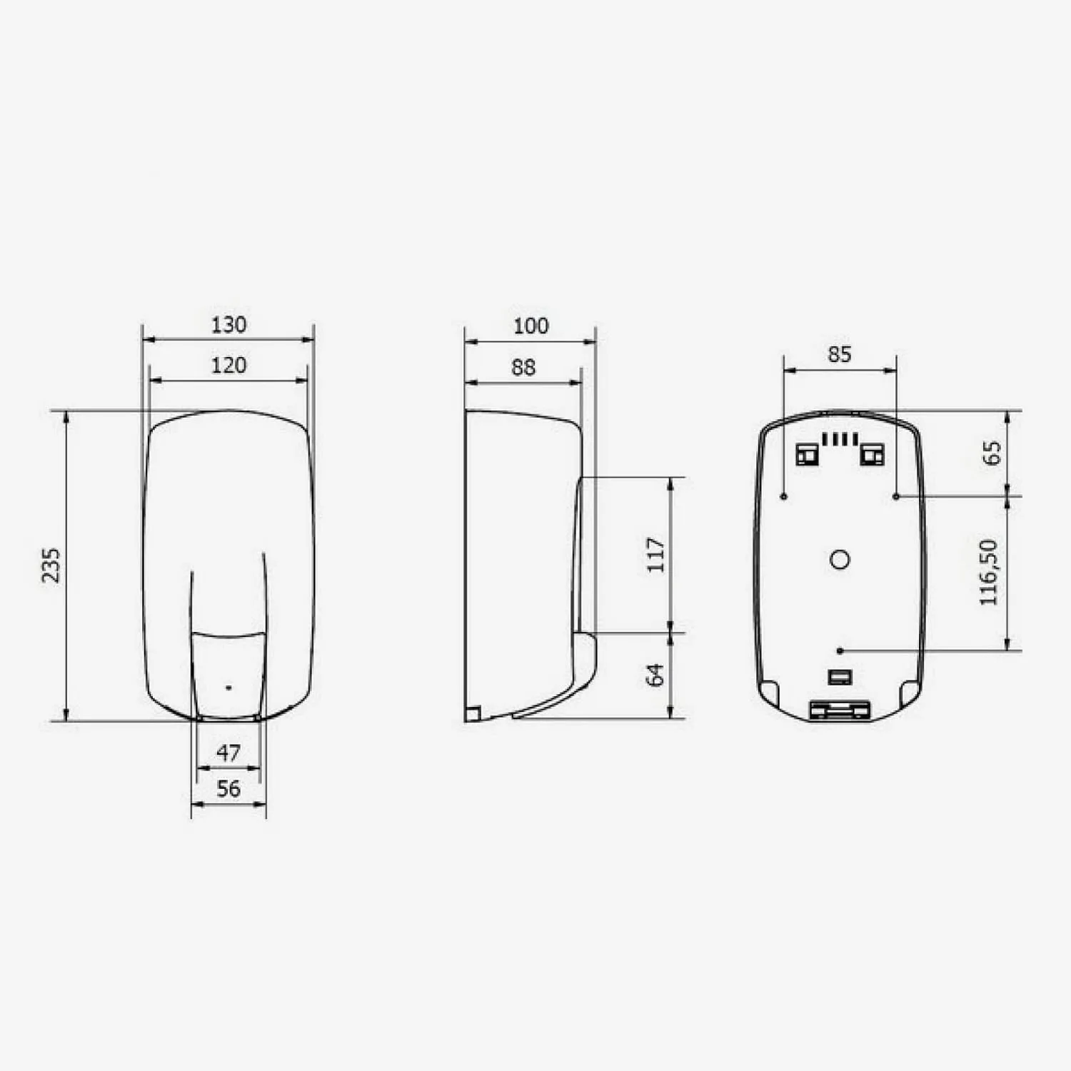 📏 -Cerradura con llave. -Pulsador con válvula anticorrosión y antigoteo. -Permite la total visión de la carga de jabón disponible. -Medidas: 235x130x100mm