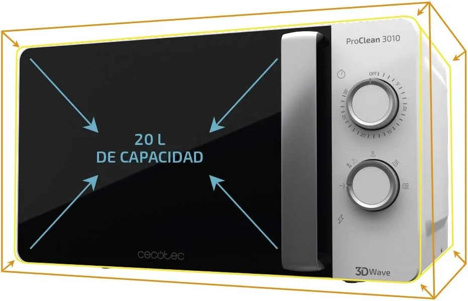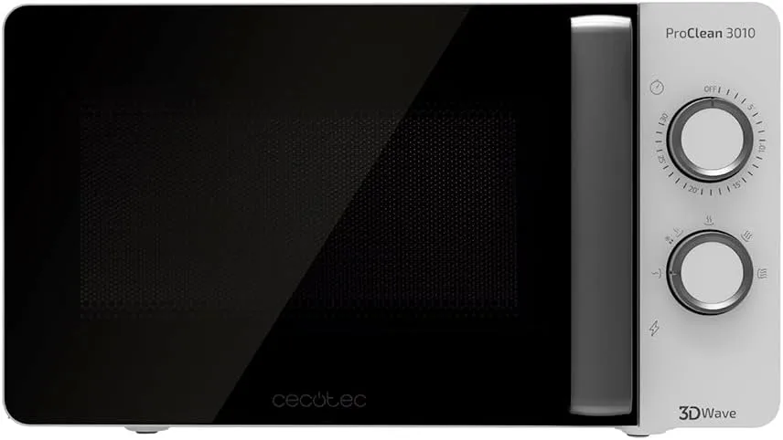 Resumen del producto: Cecotec Microondas ProClean 3010. 700 W, 20 L de capacidad, Revestimiento Ready2Clean, Tecnología 3DWave, Modo Descongelación, 6 Niveles de Potencia, Temporizador 30 mins