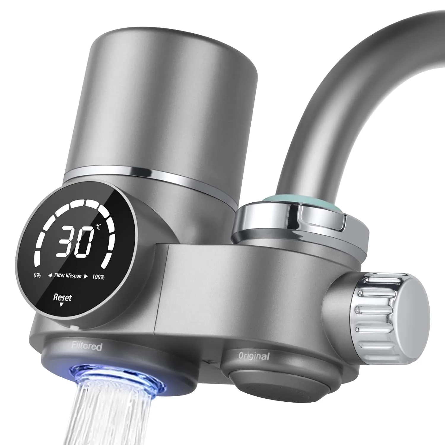 Es muy fácil de usar, hay una palanca que cambia la salida de agua entre filtrada y sin filtrar. Cuando sale agua filtrada, se enciende la pantalla, que muestra la temperatura del agua y el estado del filtro, con una luz UV azul. El filtro parece durar bastante tiempo, lo estoy usando desde hace casi un mes y sigue al 100 %.