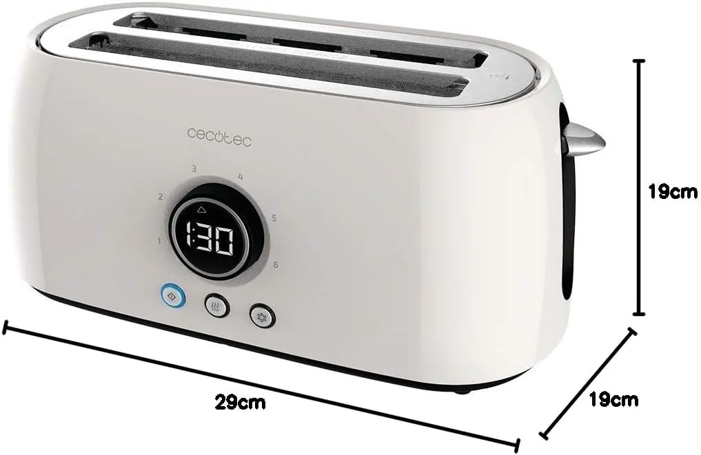 Tostadora con pantalla digital en la que se muestra el nivel o modo de tostado y la cuenta atrás del tiempo restante para que estén listas las tostadas. Cuenta con dos ranuras largas con capacidad para 4 tostadas y 1500 W de potencia máxima.