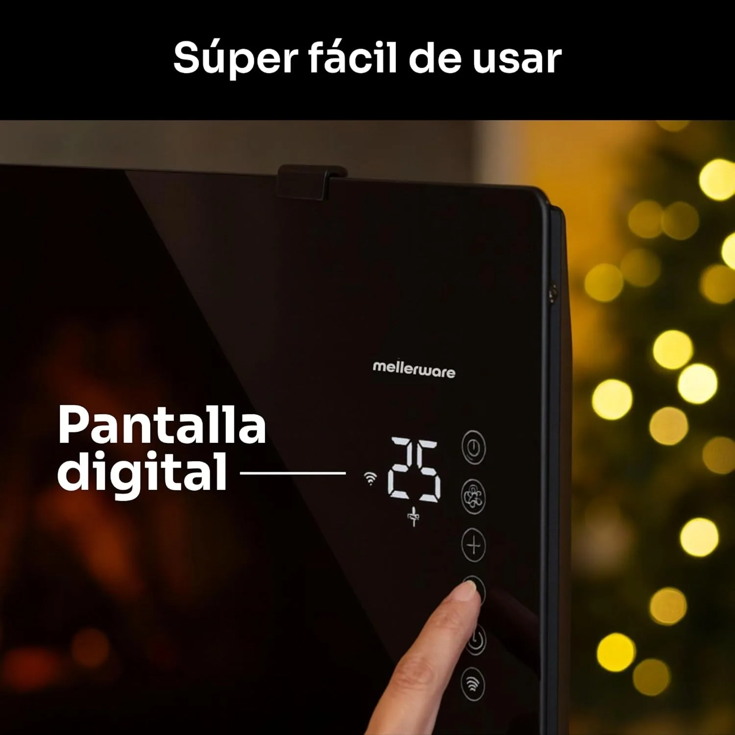 Resumen del producto: Mellerware – Radiador Eléctrico WIFI Bajo Consumo Cristal Warmy 2000W | 4 Modos Funcionamiento | 0-45ºC | Soporte Suelo/Pared | Programable Temporizador 24h | 81x48x21 Convector Autoapagado| APP