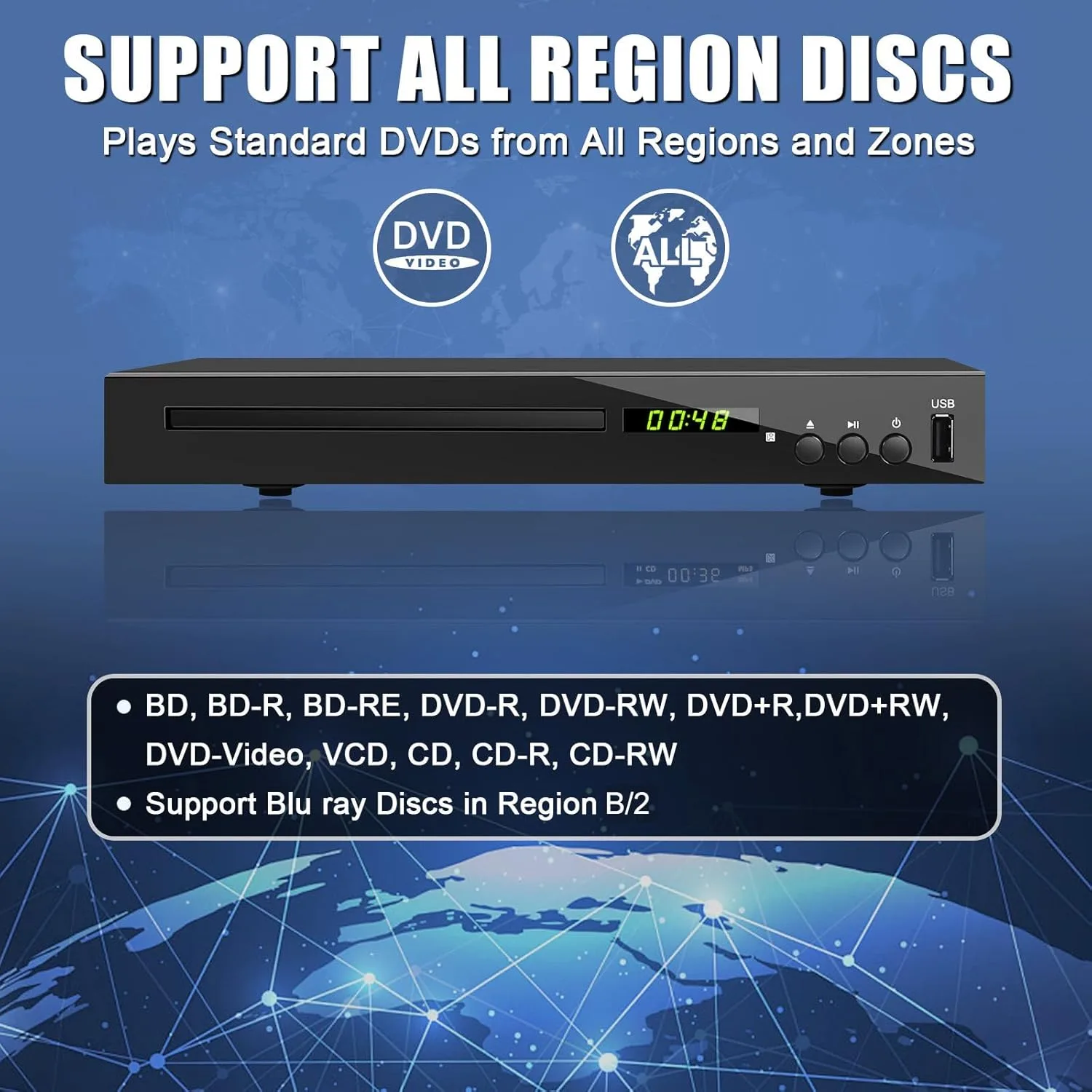 【Reproductor de Discos Blu-ray Región 2】Nota: El reproductor de Blu-ray admite discos Blu-ray de la región B/2, pero no admite discos Blu-ray de las regiones A/1 y C/3. Todos los discos que no son Blu-ray no tienen regiones. Este reproductor de Blu-ray también es compatible con DVD, lo que elimina la necesidad de reemplazar su antigua colección de DVD. Este reproductor de discos Blu-ray proporciona una calidad de imagen excepcional con una resolución de 1080p a través de una salida HDMI. [¡Los discos 4K no son compatibles!]