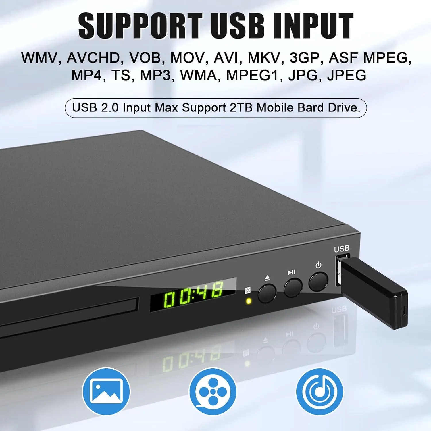 【HDMI/AV/Salida Coaxial y Unidad Flash USB】Puede reproducir archivos digitales directamente a través de una unidad flash USB o un disco duro para crear un ambiente relajante. Admite archivos en formato MP3/WMA/WAV, JPEG, MPEG2/AVI. Mejore su experiencia de entretenimiento en el hogar con este reproductor de DVD de alta calidad y sin región. Disfruta de tu vídeo favorito sin ningún problema. También puede conectar este reproductor a su televisor mediante un cable HDMI o AV.