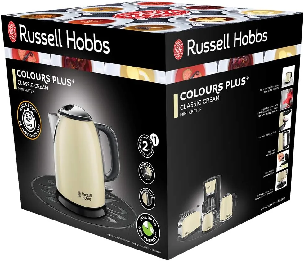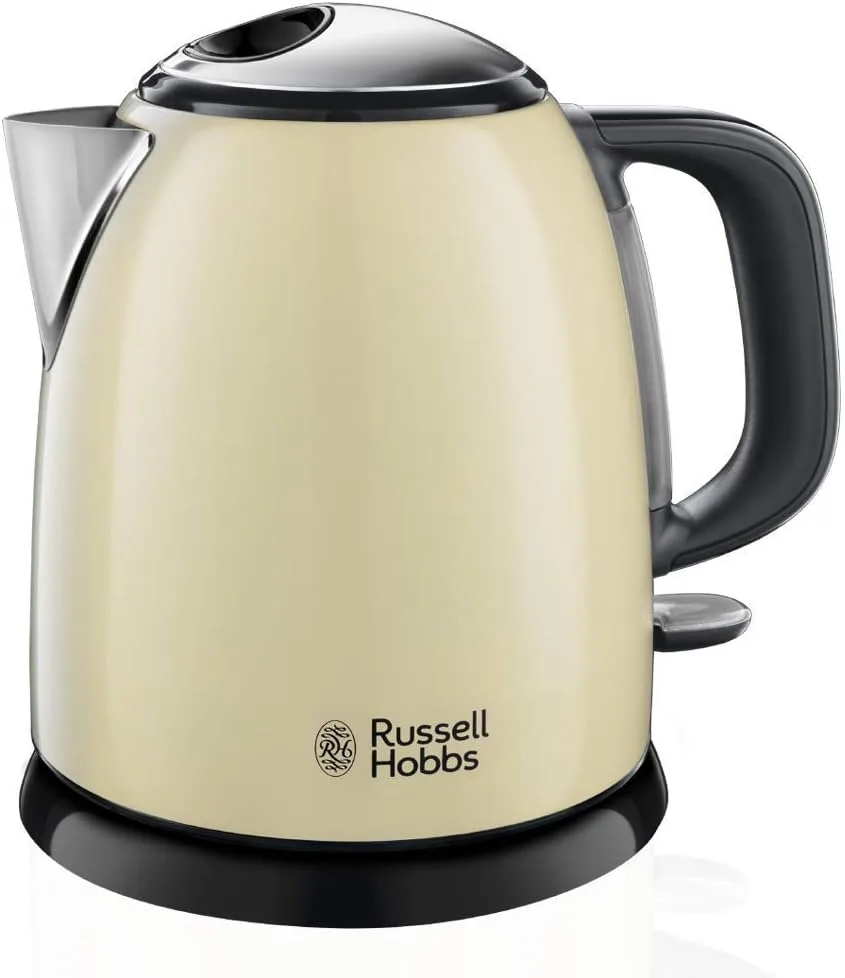 De Russell Hobbs Diseño mini de 1 L en acero inoxidable, color crema Interruptor luminoso de encendido y apagado y filtro antical extraíble y lavable Hierve 1 taza en poco más de 50 segundos Ahorra hasta un 66% de electricidad Potencia de 2400 W