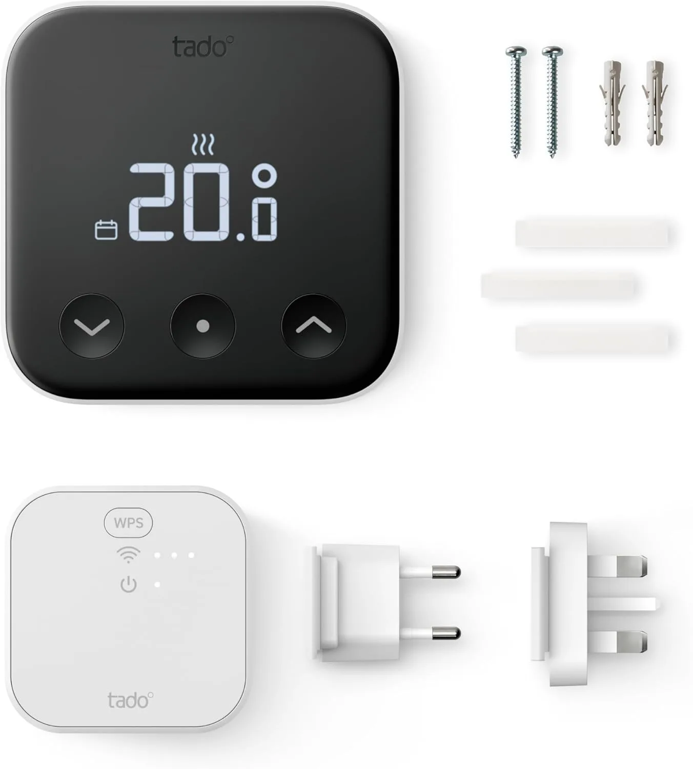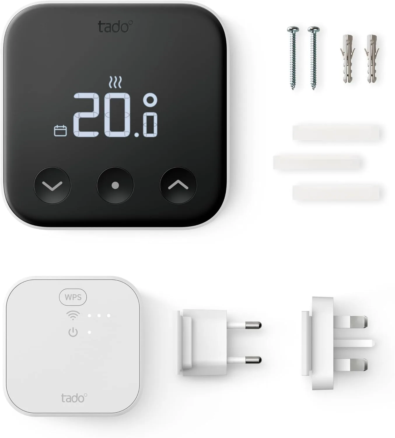De tado AHORRA ENERGÍA Y COSTES: El Starter Kit del Termostato X de tado°, los expertos en calefacción inteligente, incluye el Bridge X y, de forma exclusiva para clientes de Amazon, un juego de pilas adicional: cuantas más habitaciones, más se ahorra INSTALACIÓN SENCILLA, INCLUSO SIN CONEXIÓN: El termostato de calefacción inteligente es adecuado para calderas de gas compatibles con OpenTherm y control por relé, bombas de calor y sistemas de suelo radiante por agua con termostato cableado CONTROL MEDIANTE LA APLICACIÓN: El termostato incorpora numerosas funciones para la calefacción, como la Programación Inteligente o el control de temperatura a través de la aplicación, con la garantía de devolución del dinero PARA SU HOGAR INTELIGENTE: Además del ajuste directo en el termostato, también puede controlar fácilmente la temperatura de cada habitación mediante una aplicación o un altavoz inteligente con Amazon Alexa, Google Assistant o Apple Siri MANEJO SENCILLO: La pantalla permite controlar el termostato de forma intuitiva; si no queda satisfecho en el primer año, le devolvemos el dinero TECNOLOGÍAS PREPARADAS PARA EL FUTURO: Gracias a Matter, los diferentes dispositivos domésticos inteligentes pueden comunicarse entre sí y Thread asegura una red estable; para esto se necesita el Bridge X (incluido) u otro Thread Border Router AHORRA AL MÁXIMO CON IA: Con AI Assist ahorras hasta un 55 % más de energía gracias a automatizaciones, como Geolocalización, Detección de Ventanas Abiertas o Modo Vacaciones Información importante: los productos tado° X no son compatibles con tado° V3+ o anteriores