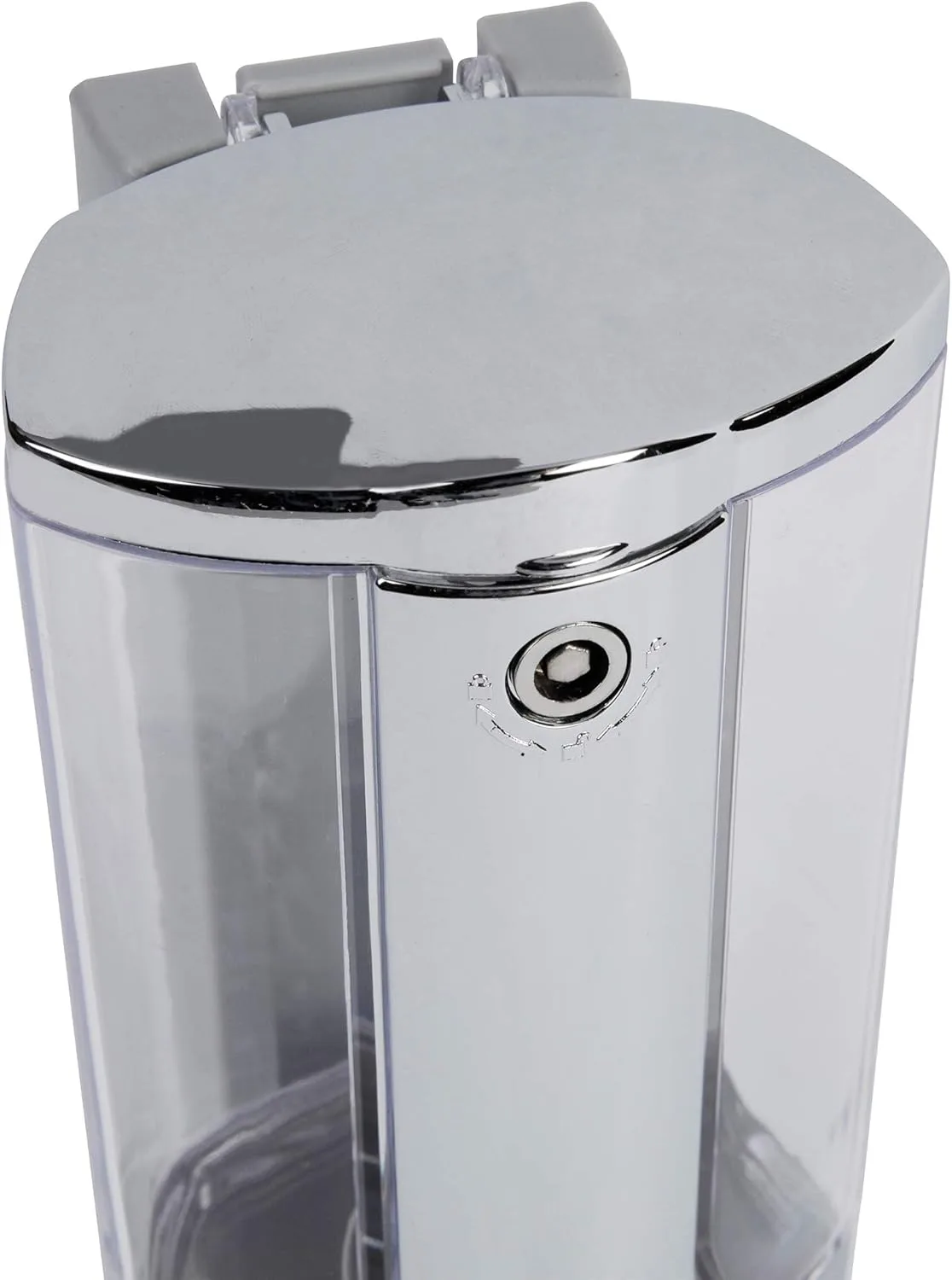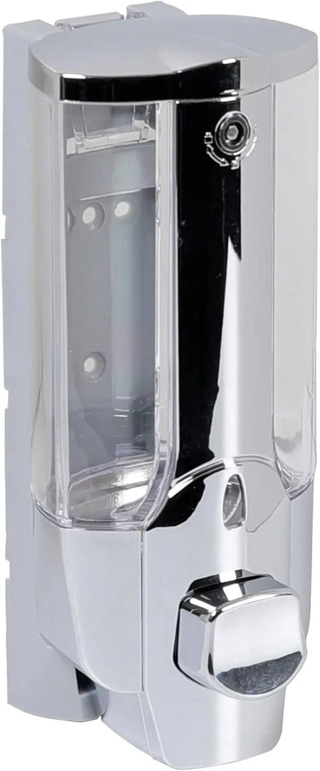 Dispensador de jabón hecho de plástico (ABS y PS) cromado con una ventana transparente en ambos lados para ver el contenido – la tapa se puede abrir con una llave para rellenar el dosificador