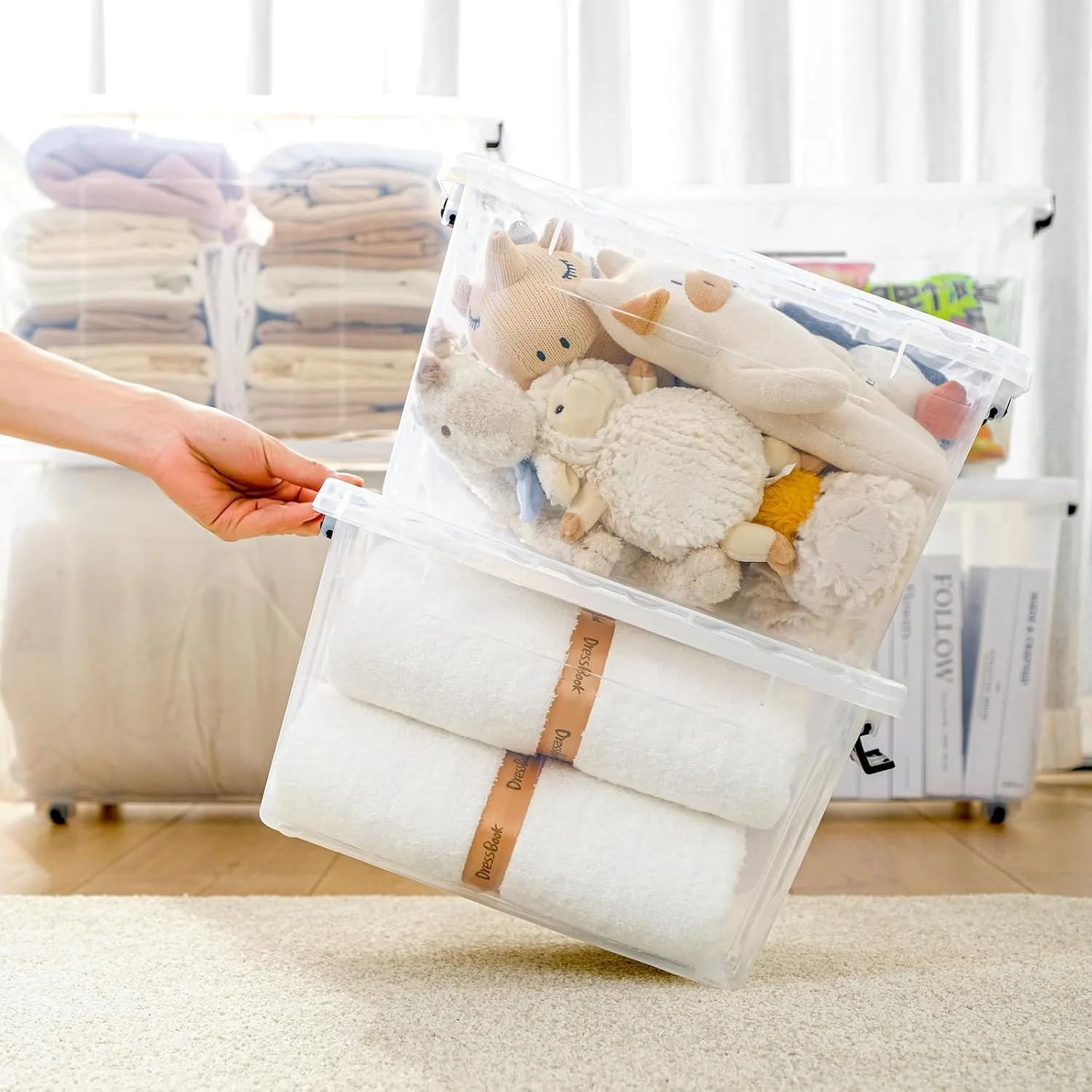 Su diseño transparente facilita encontrar exactamente lo que buscas, mientras que las ranuras en la tapa y el cuerpo aseguran una experiencia de apilamiento estable y segura.