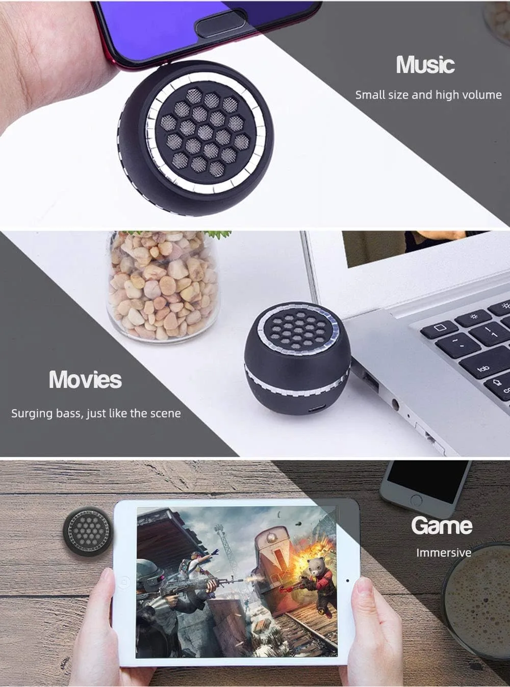 Mini compacto y portátil Procesador de audio digital 3D, gran energía. Duración eficiente de la batería, puede jugar durante 12 horas Interfaz auxiliar de 3,5 mm Sonido muy alto y equilibrado Sonido envolvente HD estéreo de 360°