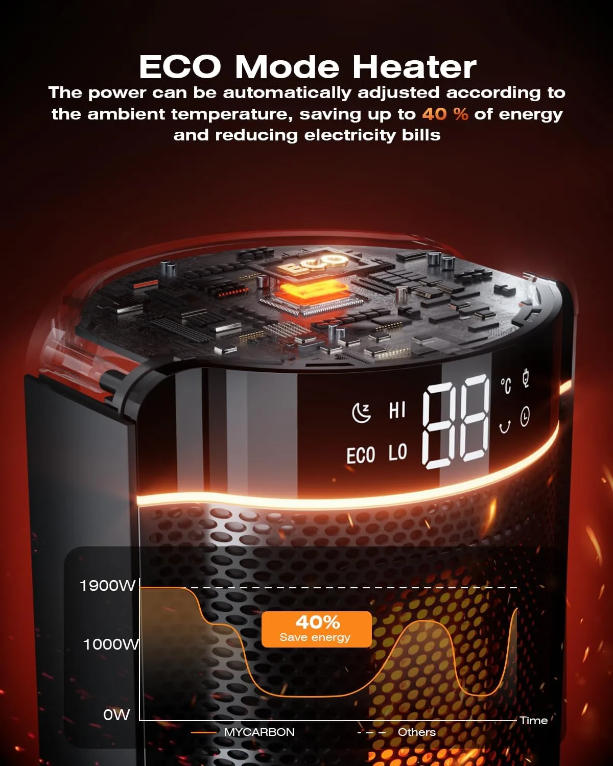 Resumen del producto: MYCARBON Calefactor Bajo Consumo 1000W/1900W con Pantalla LED TEMP Ajustable 5℃-35℃ 32dB Modo ECO Timer 12h Oscilación 70° Estufa Eléctrica con Apagado Automático y Control Remoto (Negro)