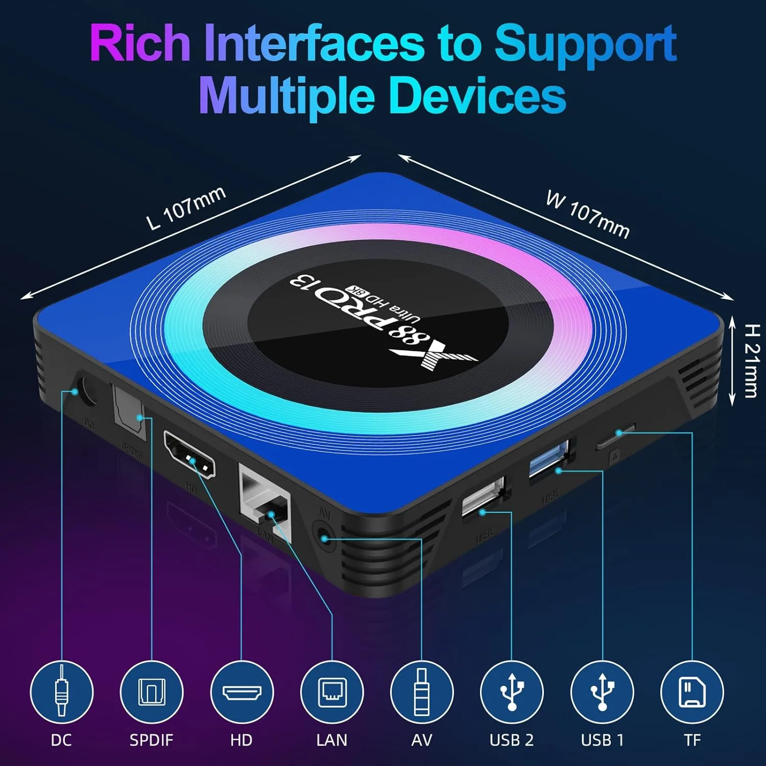 【4 GB de RAM + 32 GB de ROM】 Android 13.0 TV Box está equipado con 4G RAM para un rendimiento excelente y estable. La memoria ROM de 32 GB satisface sus necesidades diarias de entretenimiento, jugar juegos, ver películas y así sucesivamente sin ninguna molestia. También puede expandir la memoria a través de la ranura para tarjetas TF, por lo que no tiene que preocuparse por el problema de la memoria.