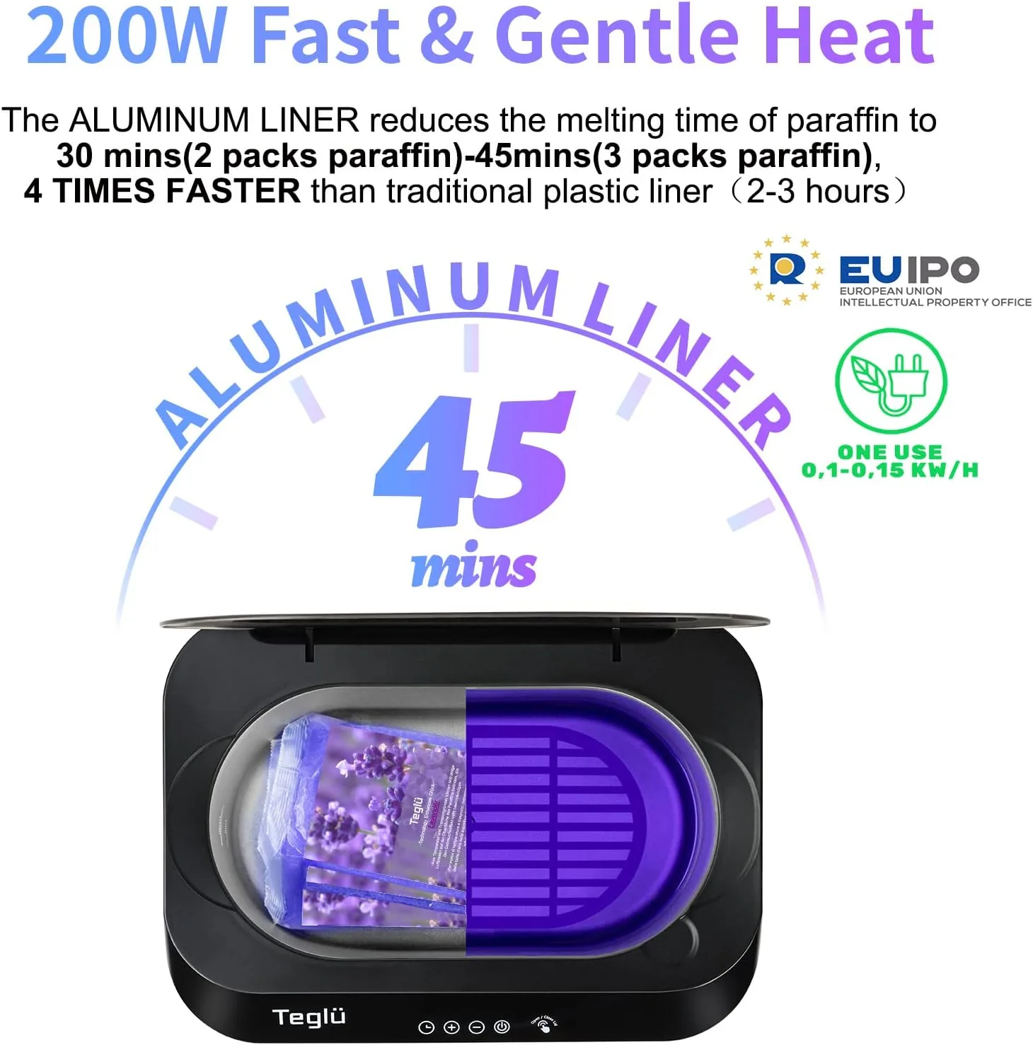 Calentamiento Rápido 200W & Fusión en 45 Minutos & Baja Potencia: El revestimiento de aluminio de alta potencia de 200W permite derretir 1350g de parafina en aproximadamente 45 minutos, 4 veces más rápido que los calentador parafina para manos y pies tradicionales.Baja potencia, sólo alrededor de 0,1 kW / h para un solo uso