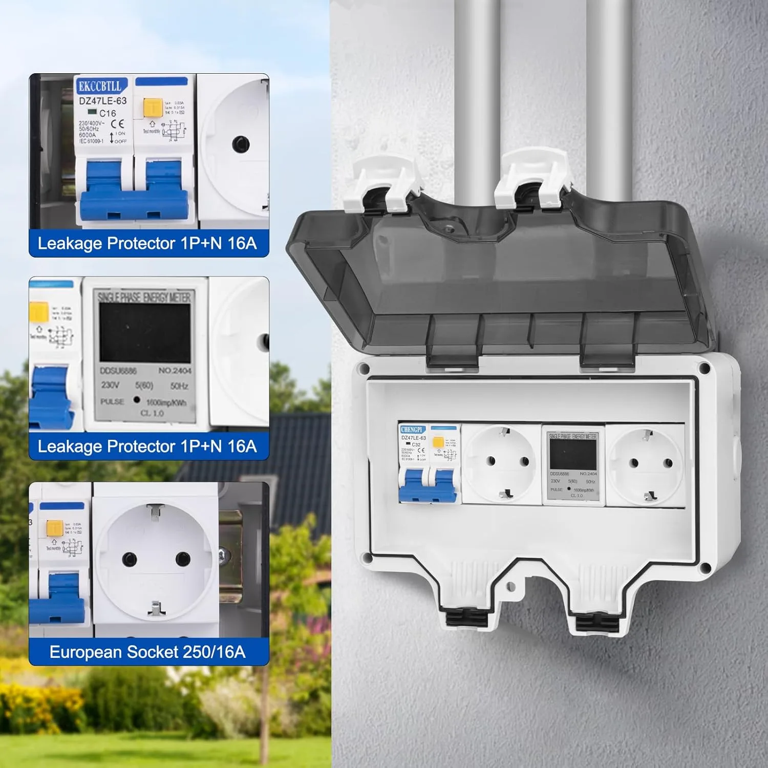 【INTERNAL DETAILS】- Equipado con protector de fugas 32A; Enchufe 250/16A; Anillos de goma impermeables; Medidor de electricidad 220V 5(60)A tornillos de sujeción y tornillos largos; Tornillos cortos; Tapa impermeable negra; Tapa impermeable blanca.