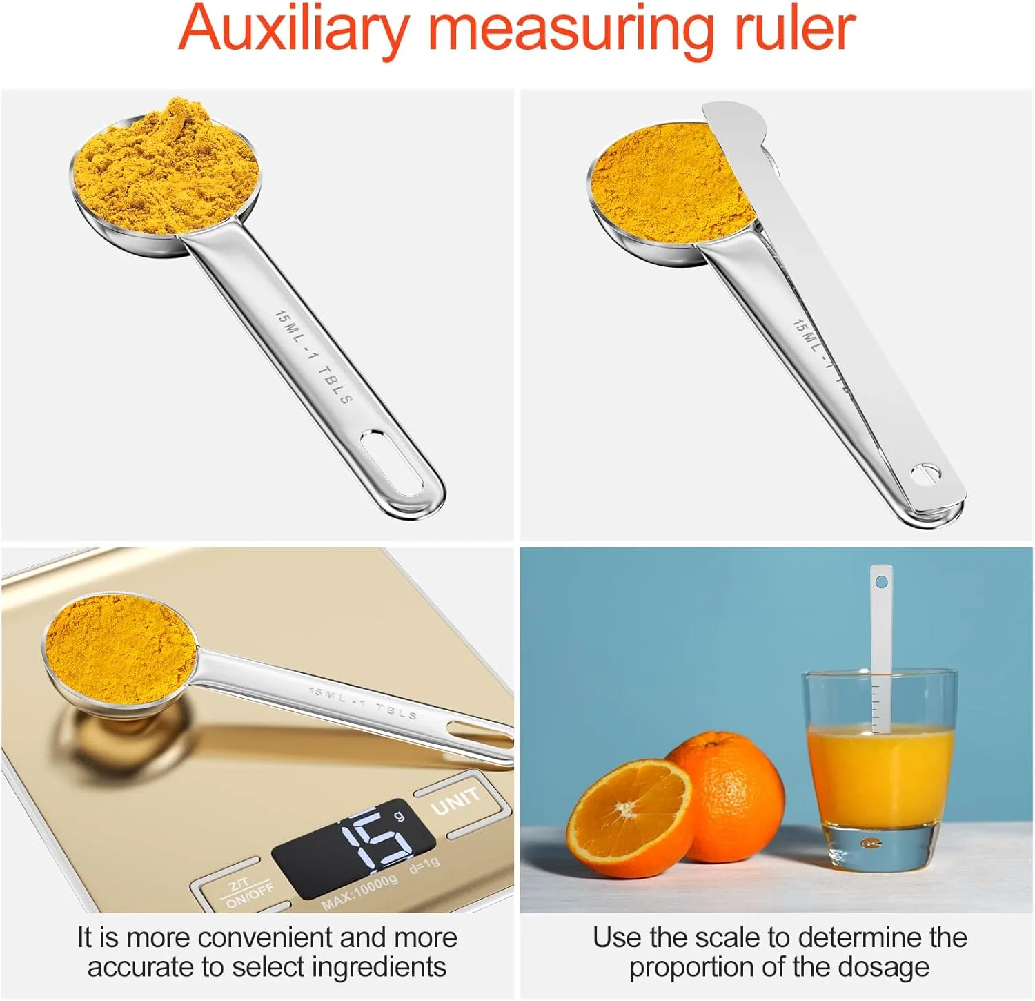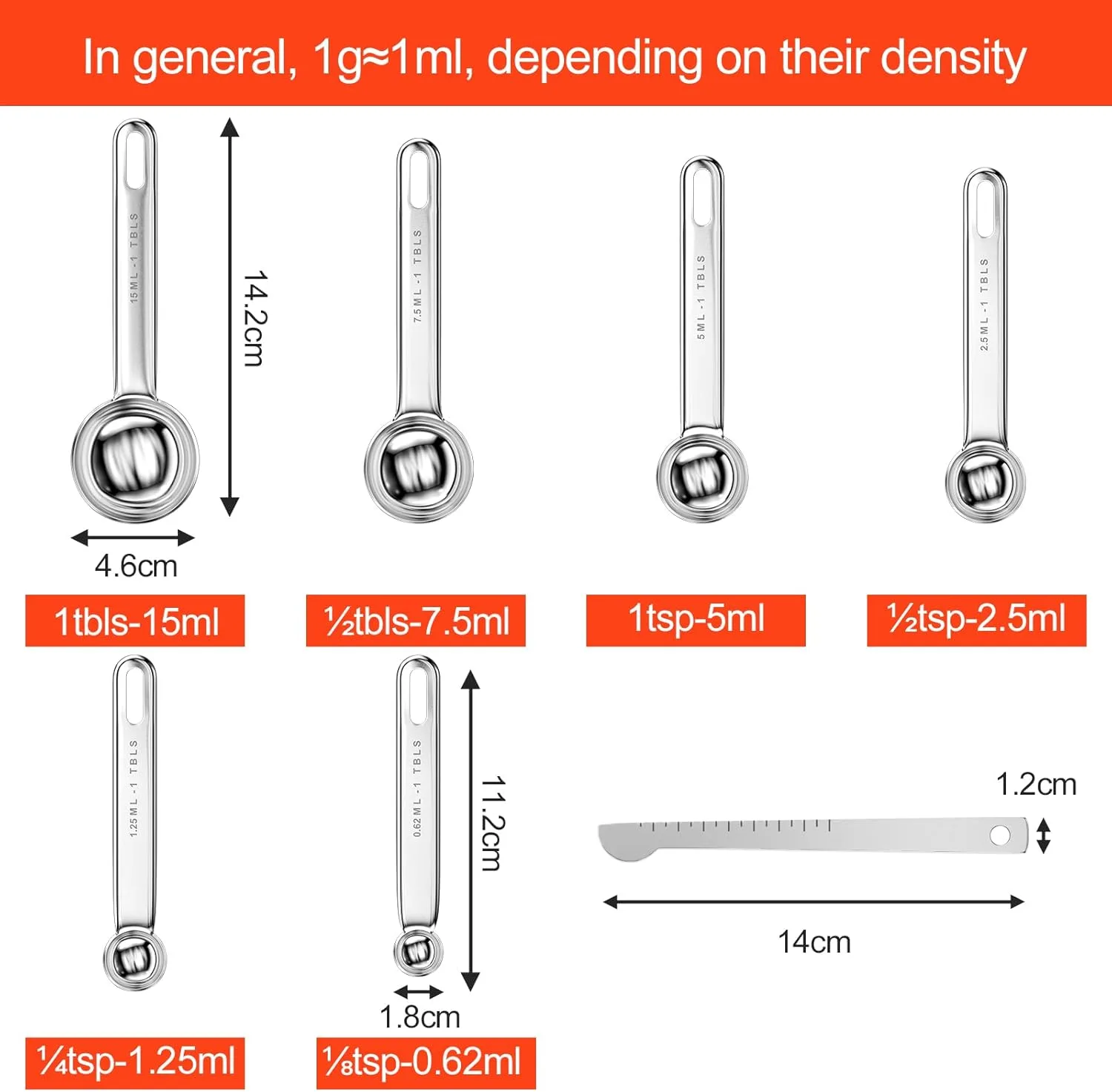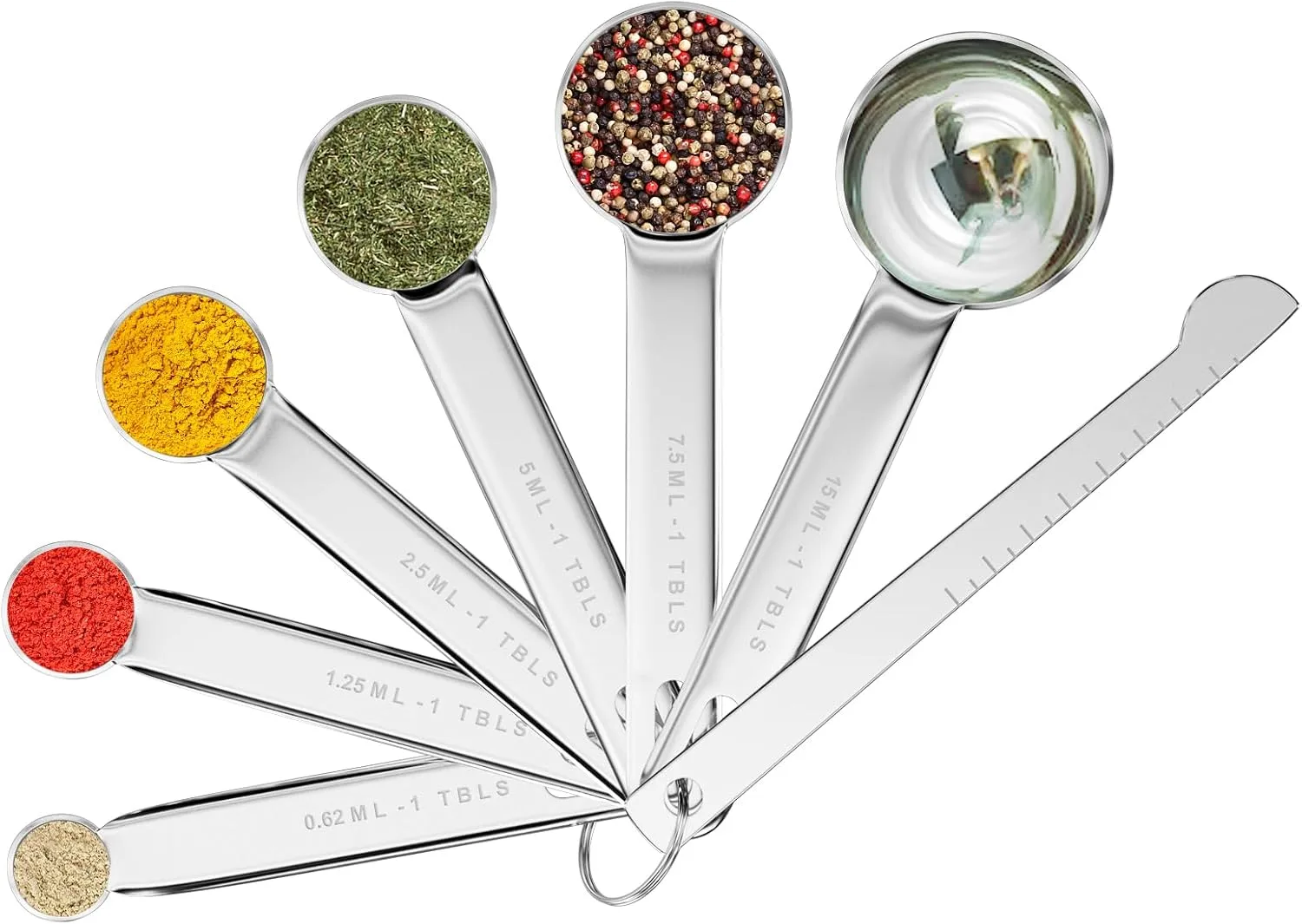 【Especificaciones del producto】El juego de cucharas medidoras incluye 6 especificaciones de cucharas medidoras y 1 regla medidora, con capacidades de 15 ml, 7,5 ml, 5 ml, 2,5 ml, 1,25 ml y 0,62 ml. Varias especificaciones lo ayudan a comprender fácilmente la cantidad de ingredientes
