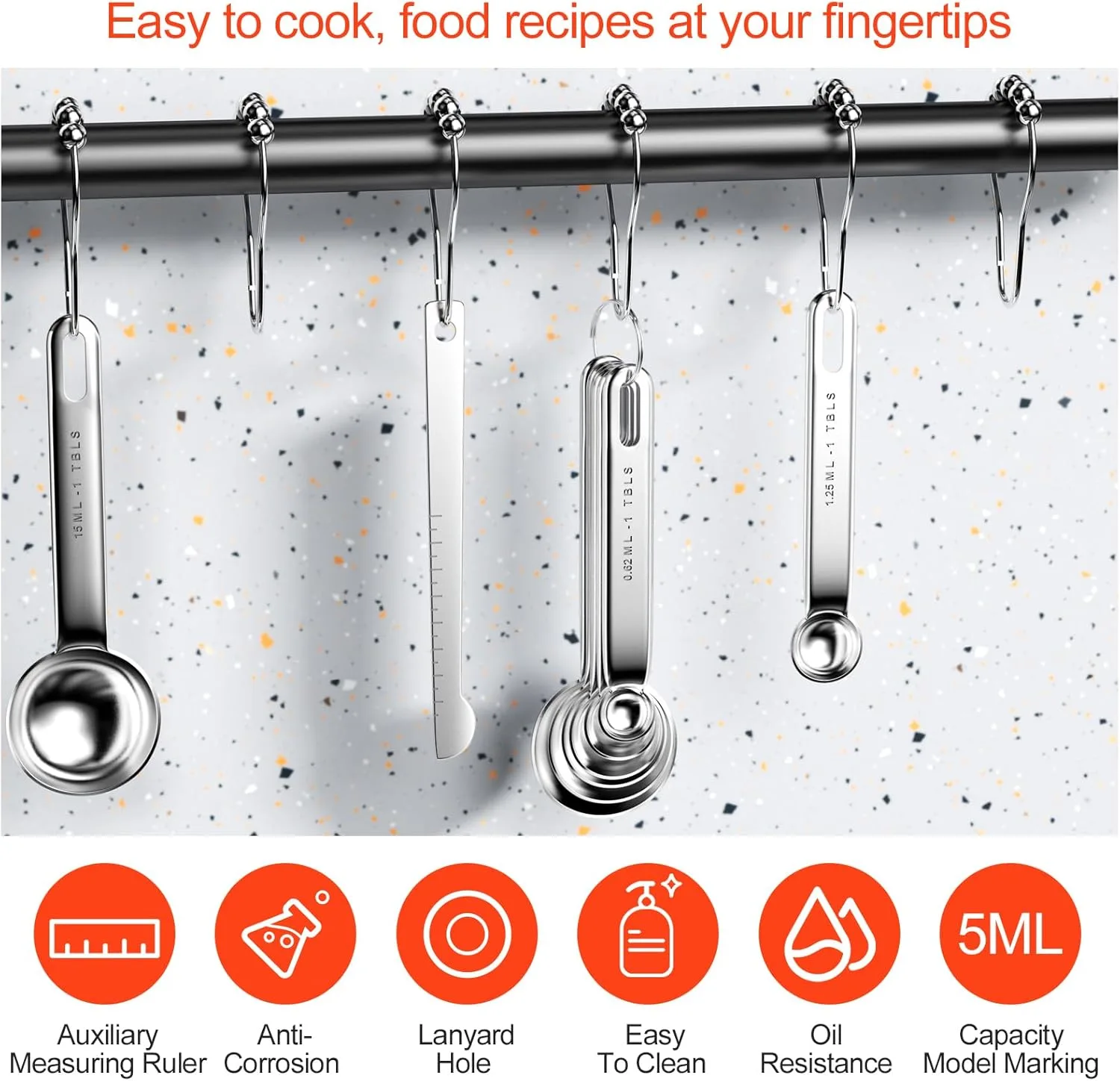 【Fácil de almacenar】 El juego de cucharas medidoras está equipado con un llavero, que es muy fácil de guardar y sacar, puede sacar fácilmente todas las cucharas medidoras que necesita del llavero y usarlas, simplemente cuélguelas en cualquier lugar con un gancho después de su uso Can