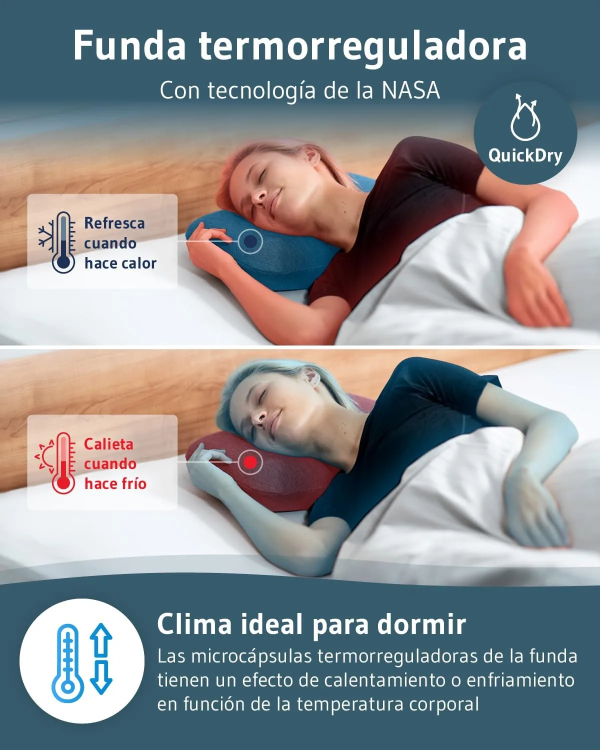 ➤ CONTROL DE TEMPERATURA Y SECADO RÁPIDO – Los canales de ventilación en el cojín y las microcápsulas termorreguladoras de la funda con tecnología patentada THERMIC QuickDry, garantizan un aire limpio y fresco y menos sudoración durante el sueño. Además la funda se seca en la mitad de tiempo que una convencional