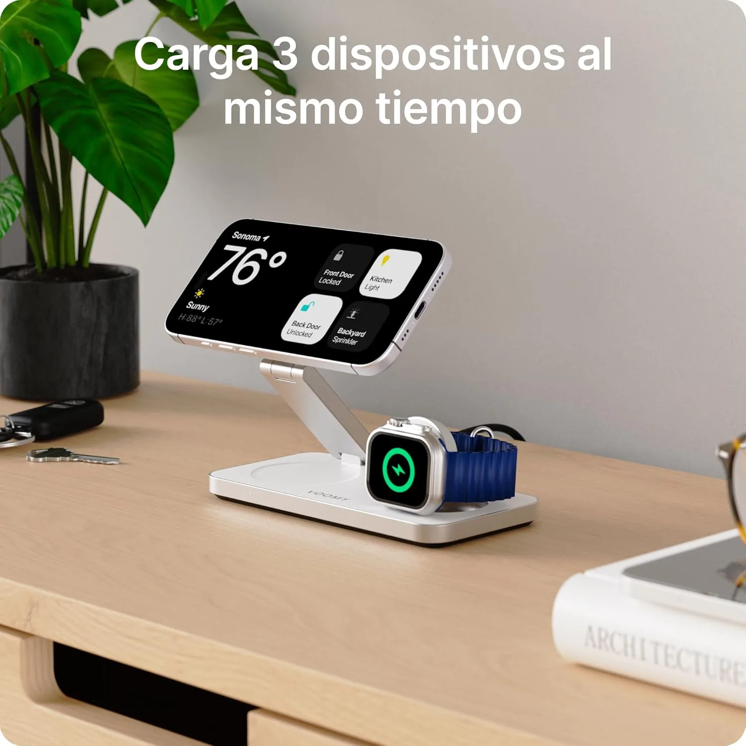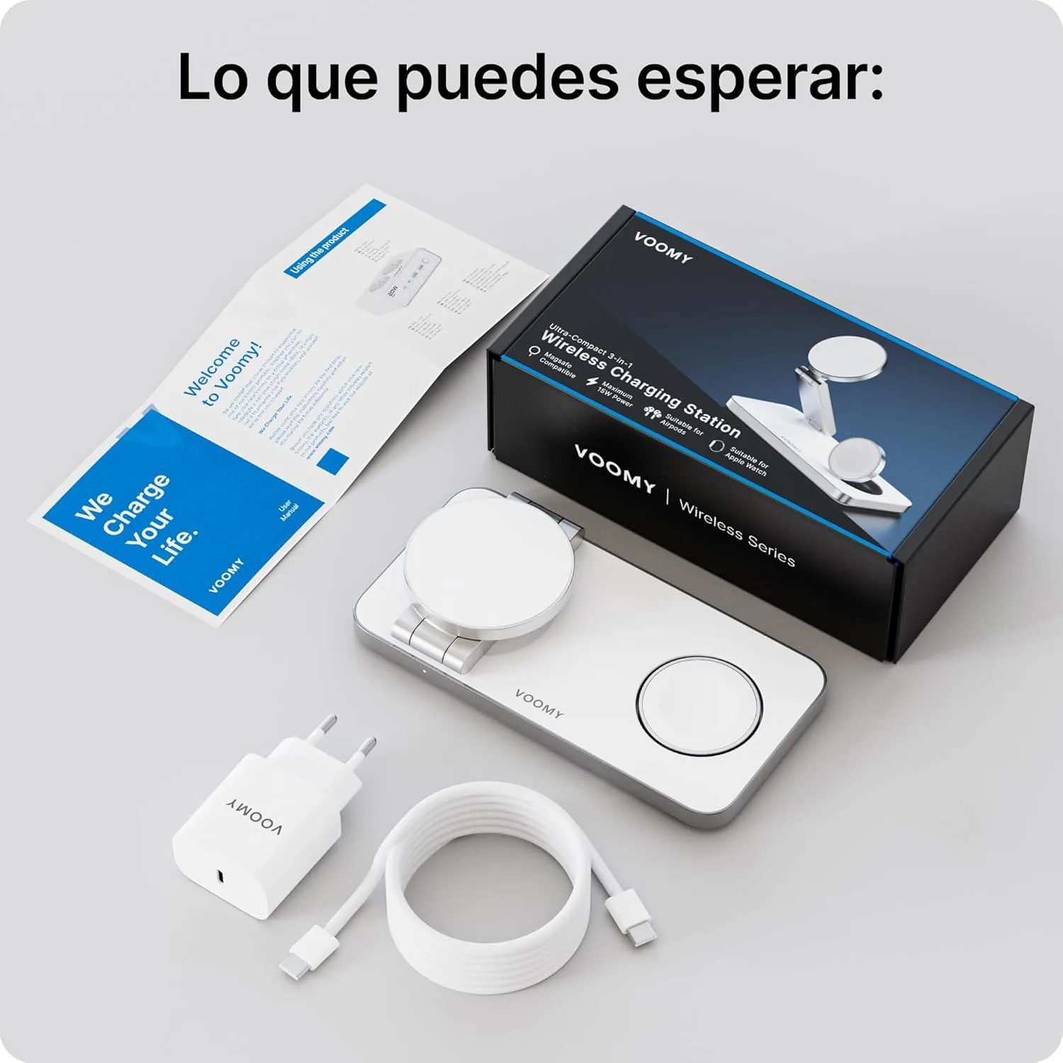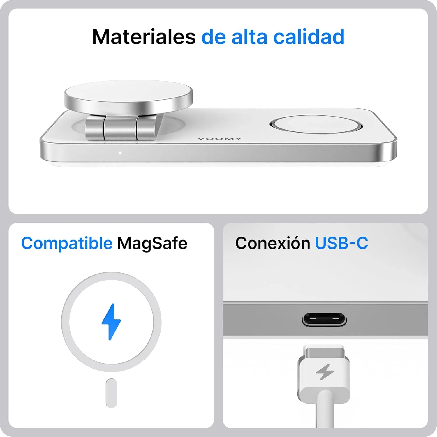 Resumen del producto: Voomy Carga inalámbrica 3 en 1 MagSafe – Estación de Carga para iPhone, Apple Watch y AirPods – 15W, diseño Plegable, con USB-C y Adaptador – Compatible con MagSafe y Qi