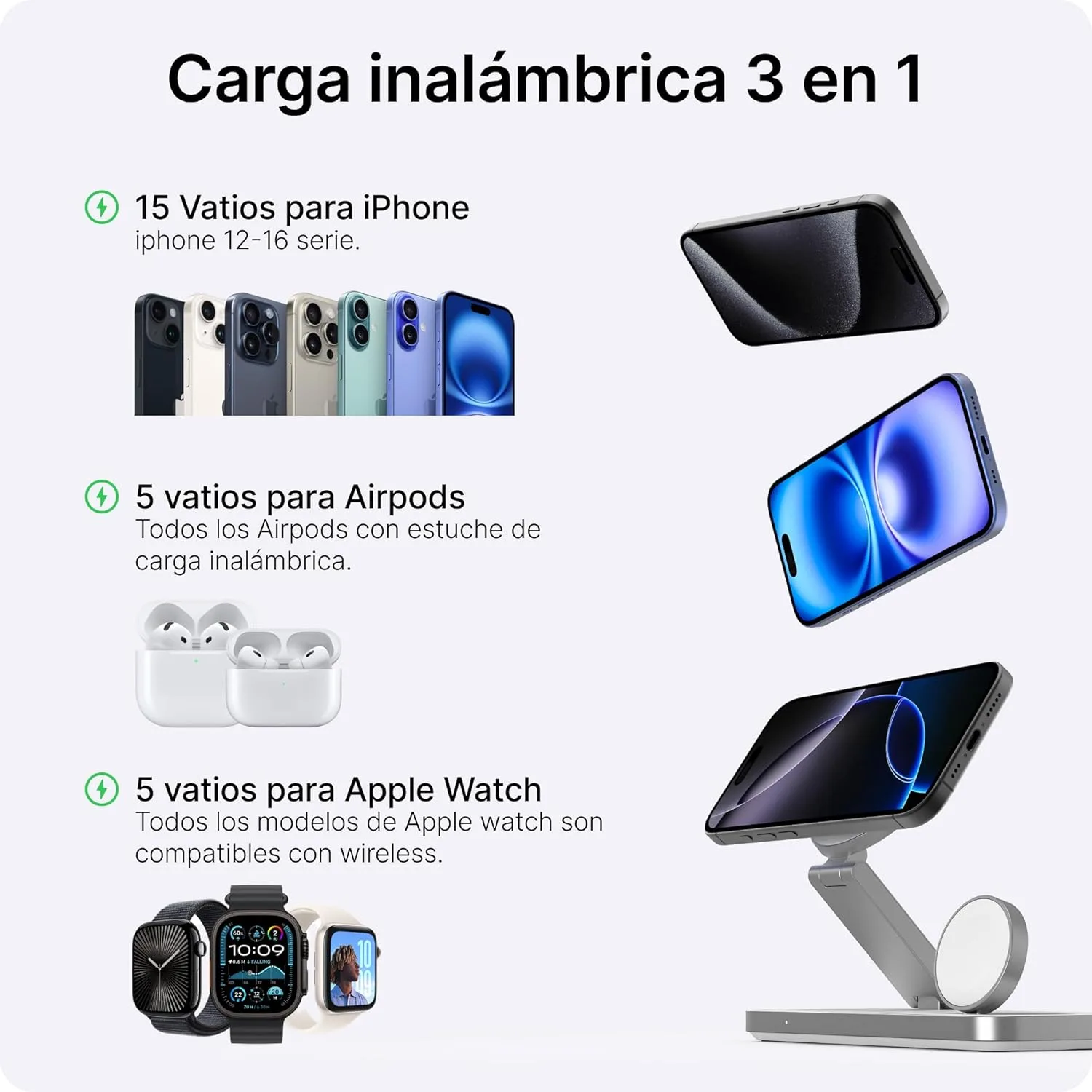 Listo para usar: La base viene con cable USB-C y adaptador de corriente, sin necesidad de compras extra. Con esta carga inalámbrica 3 en 1, tienes una solución completa para tu día a día.