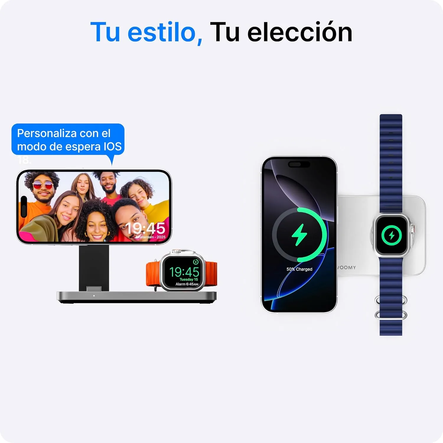 Carga inalámbrica 3 en 1: Esta estación de carga te permite cargar simultáneamente tu iPhone, Apple Watch y AirPods con una sola base. Ideal para mantener tu espacio limpio y organizado, sin enredos de cables.