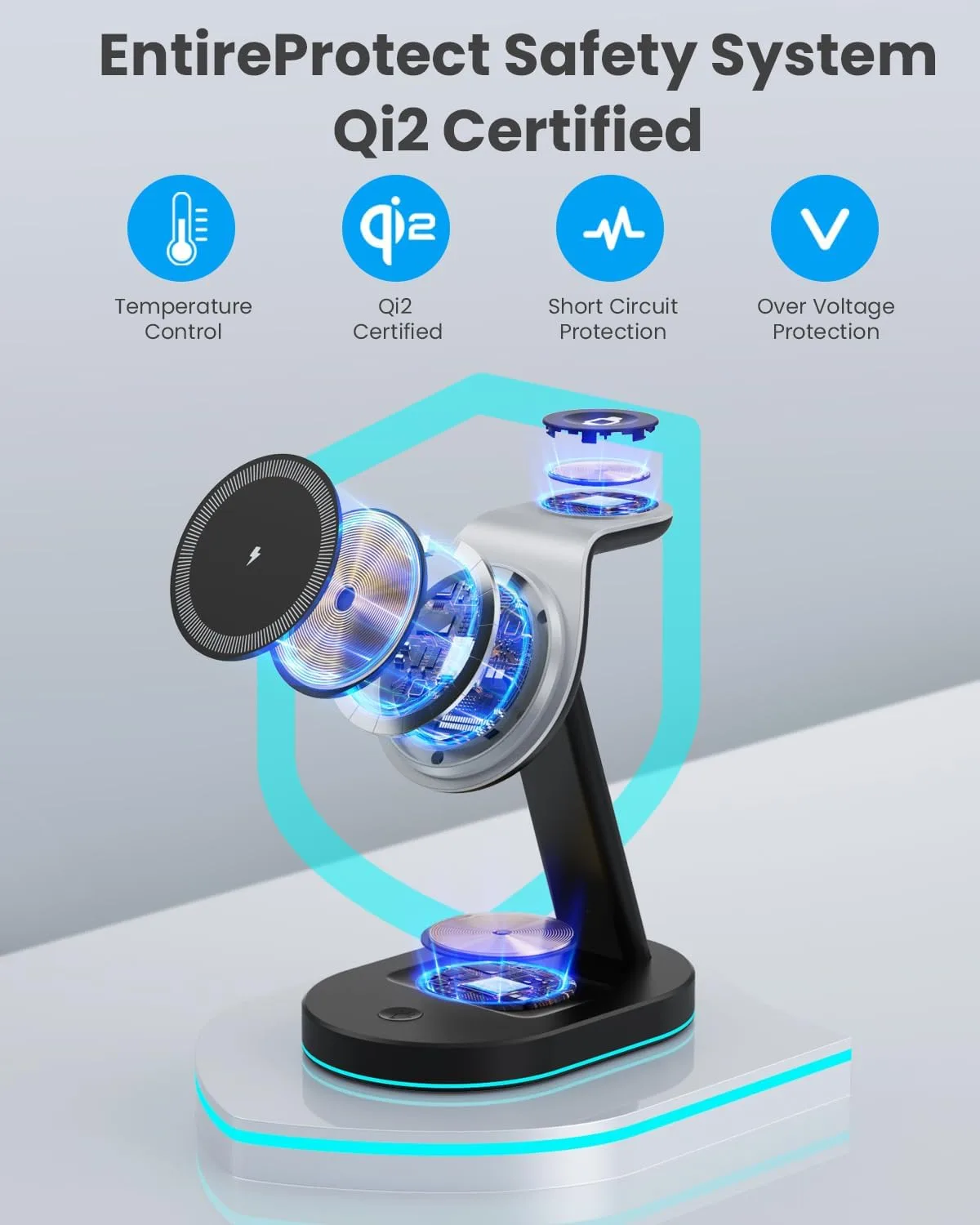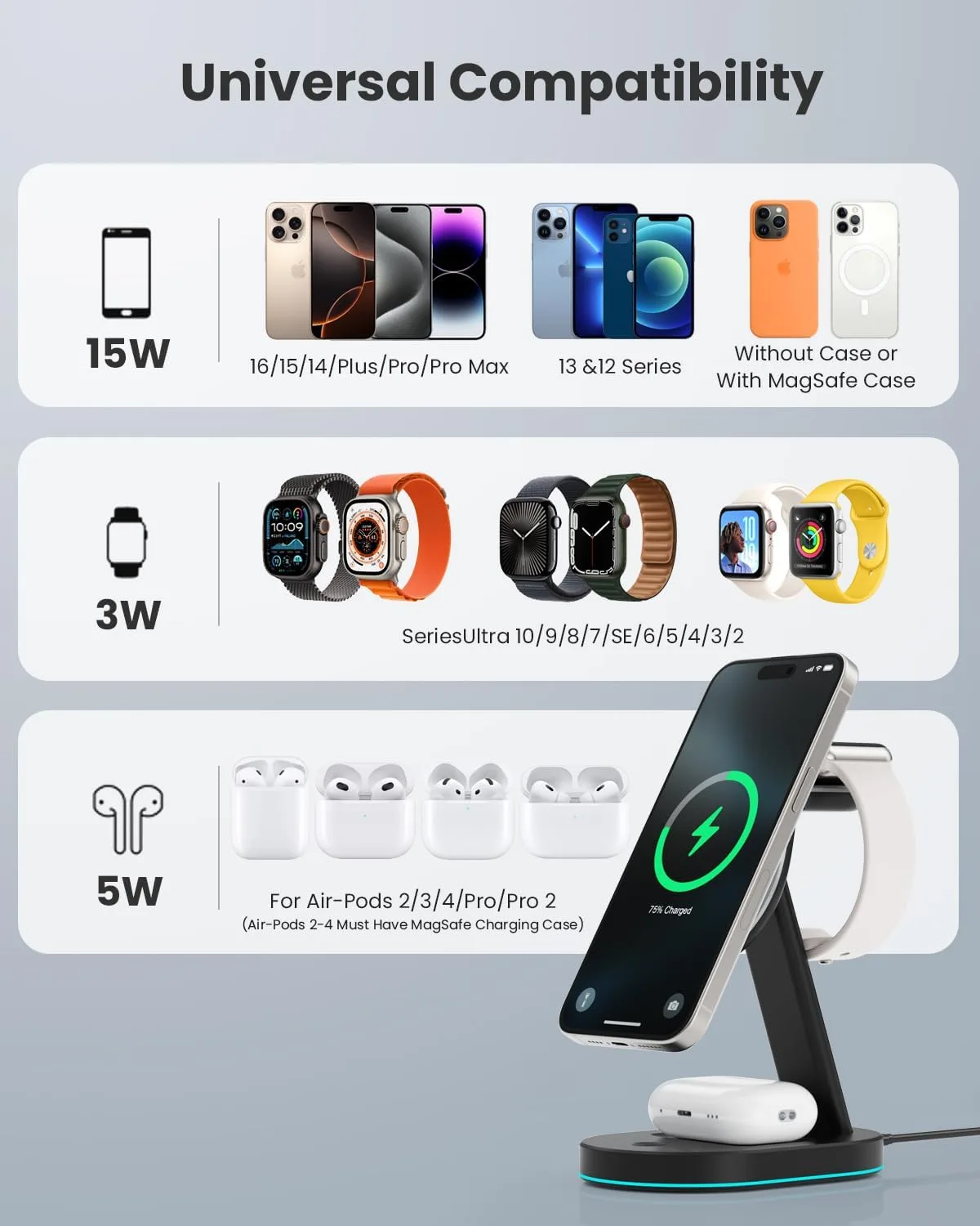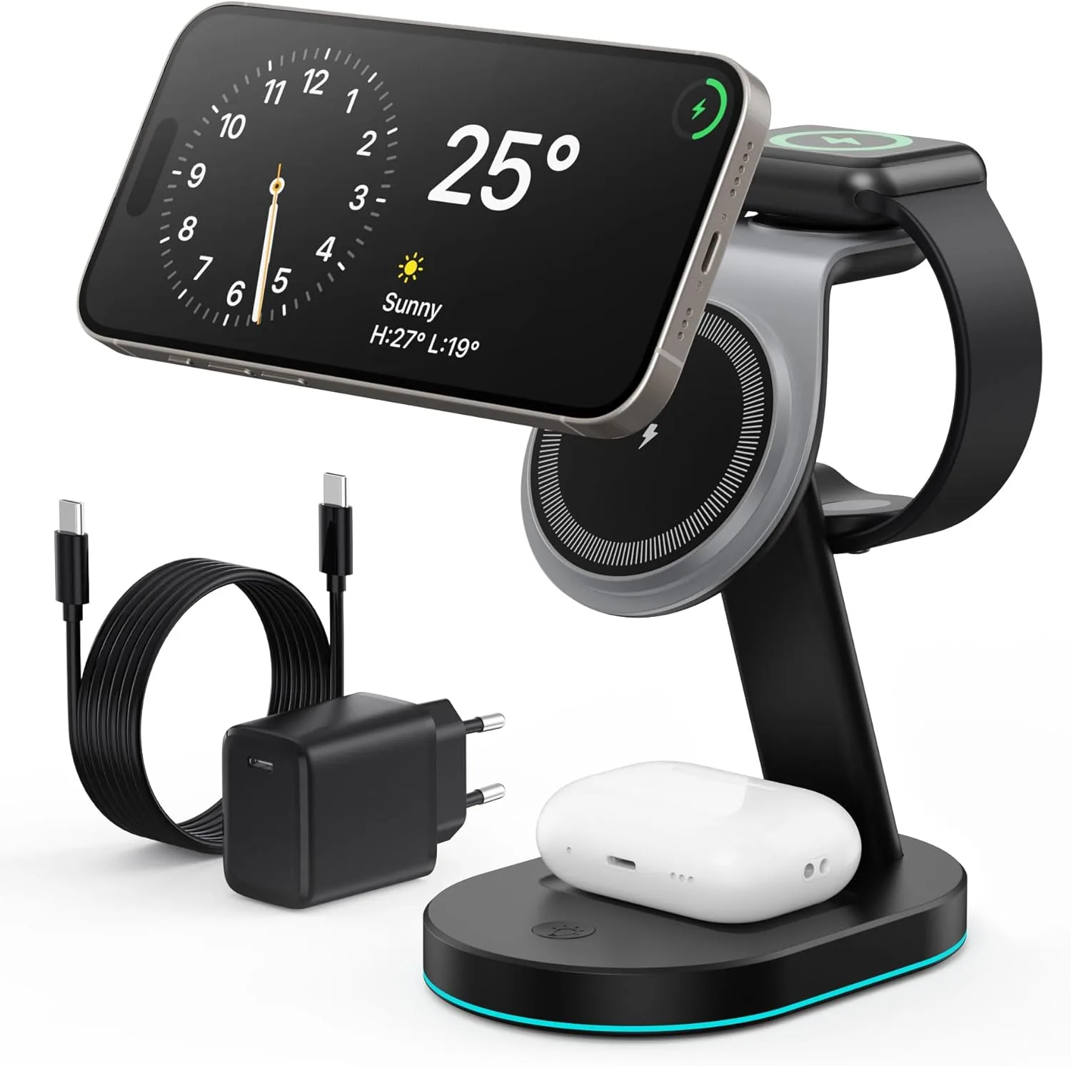 Ich hab echt lange nach einer praktischen Ladestation für meine Apple-Geräte gesucht – und diese hier ist einfach der Hammer! iPhone, Apple Watch und AirPods laden jetzt alle gleichzeitig und das ganz ohne Kabelchaos. Einfach ablegen, andocken (MagSafe hält bombenfest) und los geht’s.