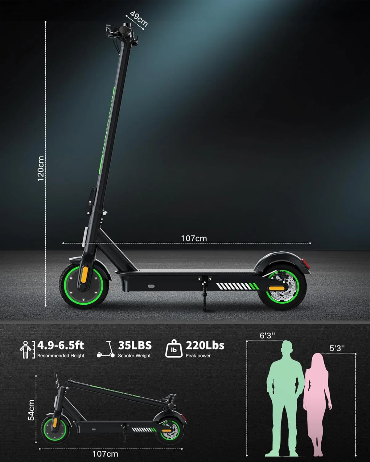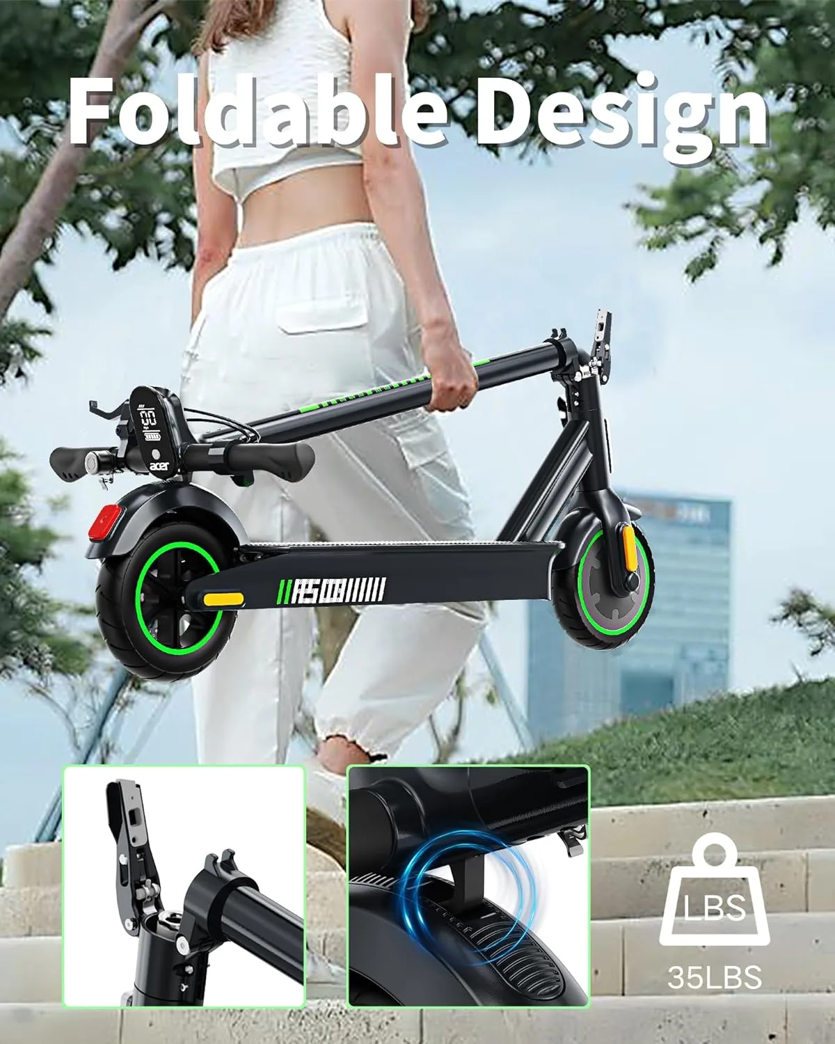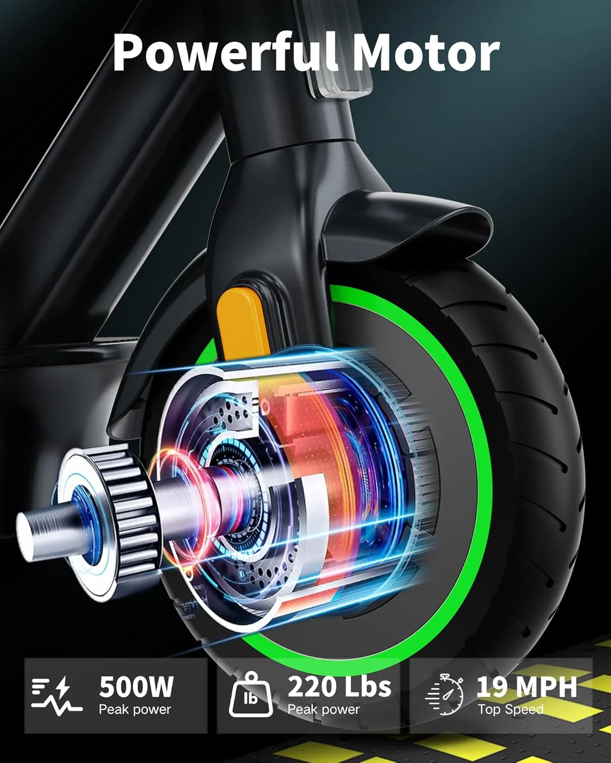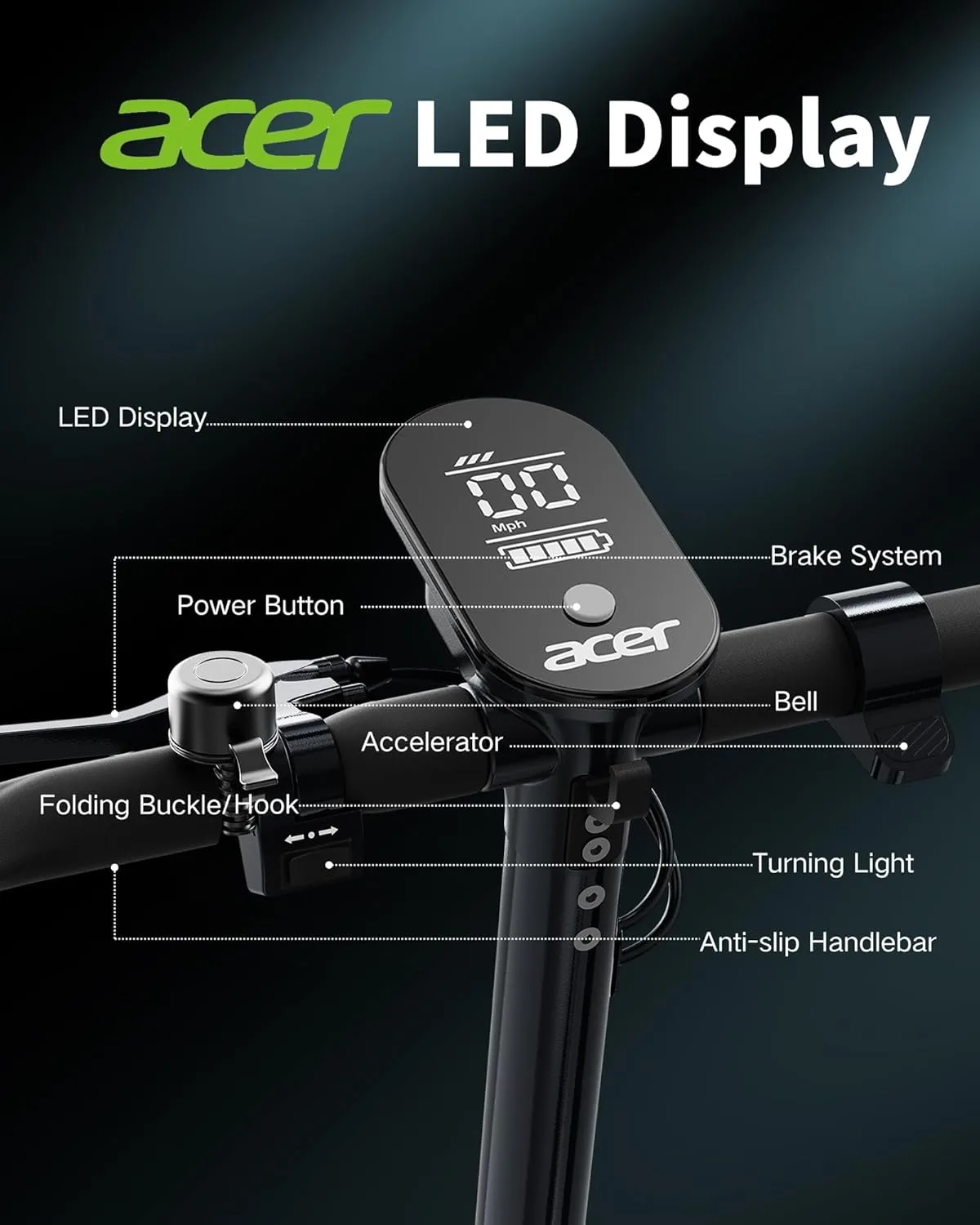 Motor maravilloso y batería fuerte: el scooter eléctrico Acer tiene un motor de pico de 500 W y batería de alta capacidad que se recupera alrededor de 4-5 horas hasta 20 millas de viaje y velocidad máxima de 15.5 MPH, y soporta hasta 220 libras. Potente sistema de freno: el motor sin escobillas de 350 W más fuerte proporciona un sistema de frenado doble con un frenado de disco y frenado antibloqueo regenerativo EABS. Material de aleación de aluminio resistente para montar con seguridad. Certificado de seguridad: el patinete eléctrico para adultos ha pasado la prueba de certificación UL2272, de alto rendimiento, herramientas de viaje ideales para satisfacer las diferentes necesidades de adolescentes y adultos. conviértete en tu mejor compañero de viaje o al aire libre. Neumáticos sólidos de 8.5 pulgadas: con neumáticos sólidos de panal de abeja de 8.5 pulgadas, este patinete eléctrico garantiza una durabilidad superior y absorción de impactos sin riesgo de pinchazos. El marco ligero pero resistente soporta ciclistas de hasta 220 libras, por lo que es ideal para adultos y adolescentes por igual. Plegable en un solo paso: el mecanismo de plegado rápido te permite plegar el patinete en solo 3 segundos, por lo que es fácil de transportar o almacenar. Con un peso de solo 35 libras, cabe cómodamente en el maletero del coche, debajo de escritorios o en espacios compactos, perfecto para viajes por la ciudad, paseos en el campus y viajes de oficina Garantía de calidad: disfruta de una cobertura de garantía de 180 días para diferentes piezas. Nuestro dedicado equipo de atención al cliente siempre está listo para ayudar con cualquier consulta o preocupación. Consejos: carga completamente antes de usar, luego desconecta el cargador para encenderlo. Comprueba regularmente la batería y el cargador, utiliza la batería y el método de carga correctos, y evita la carga en zonas no ventiladas o inflamables.