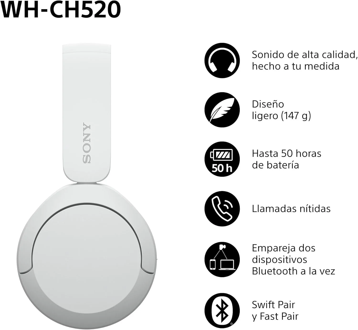 De Sony RESENTAMOS LOS SONY WH-CH520: Disfruta de un sonido excelente para cada canción, con un estilo que se adapta a ti. Con nuestra tecnología Digital Sound Enhancement Engine (DSEE) y mucho más SONIDO DE ALTA CALIDAD, ADAPTADO A TI: Estos auriculares Sony cuentan con tecnología DSEE, 360 Reality Audio y un ecualizador de 5 bandas personalizable en la app Sony | Sound Connect ESCUCHA CON COMODIDAD Y ESTILO: Con almohadillas suaves y un peso de solo 147g, estos auriculares inalámbricos son cómodos. Elige entre Negro, Blanco, Azul, Beige, Rosa o Amarillo para combinar con tu estilo BATERÍA DE LARGA DURACIÓN: Con hasta 50 h de batería, estos auriculares Bluetooth ofrecen energía para días. Una carga rápida de 3 minutos proporciona hasta 90 minutos de reproducción. LLAMADAS NÍTIDAS, CONEXIÓN AUTOMÁTICA: Los auriculares Sony WH-CH520 capturan tu voz con claridad. Conexión Multipunto empareja dos dispositivos Bluetooth y cambia entre ellos fácilmente CONTROL RÁPIDO Y FÁCIL: Usa los botones de los auriculares o la app Sony | Sound Connect para controlar los WH-CH520. Swift Pair y Fast Pair facilitan la conexión a tus dispositivos