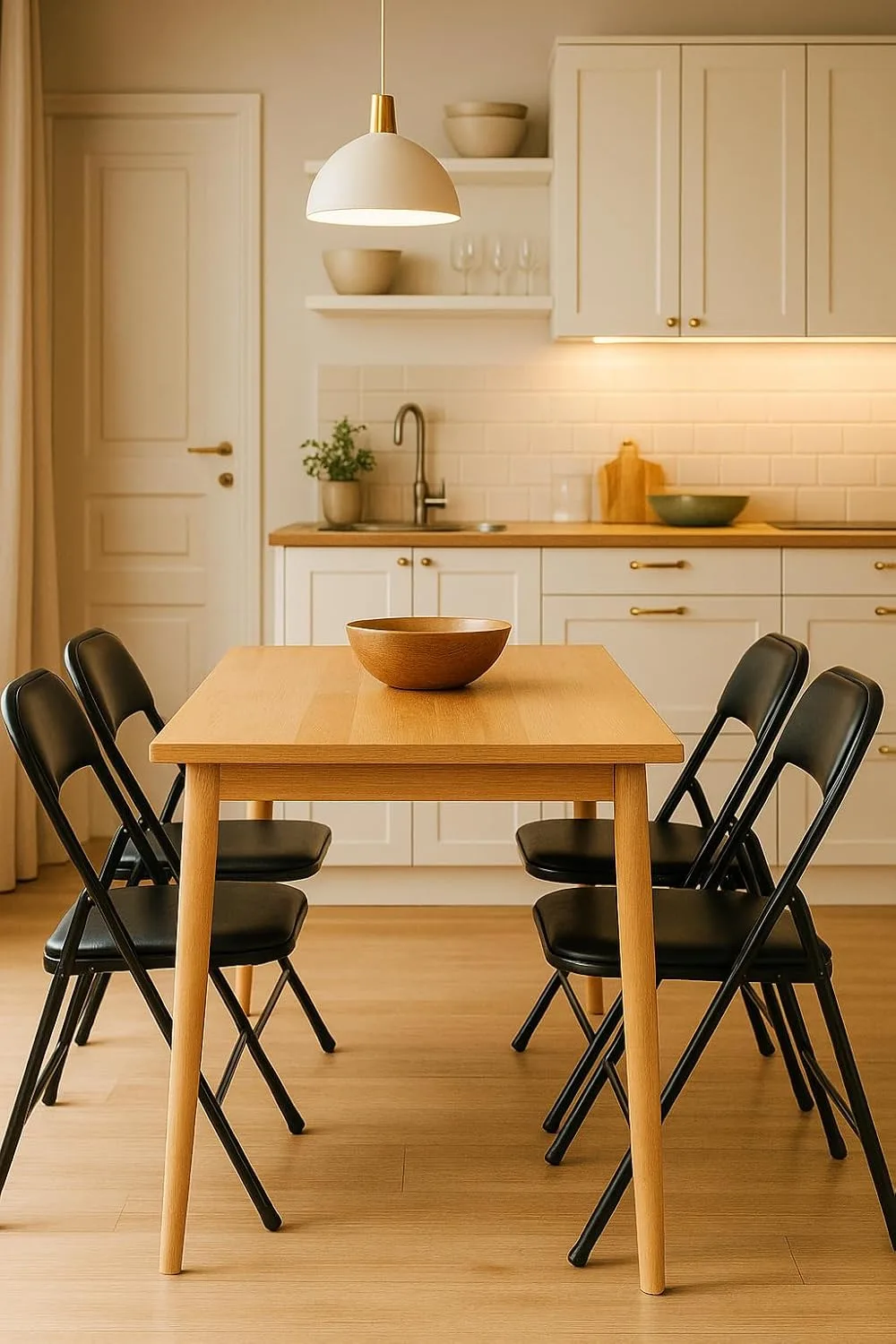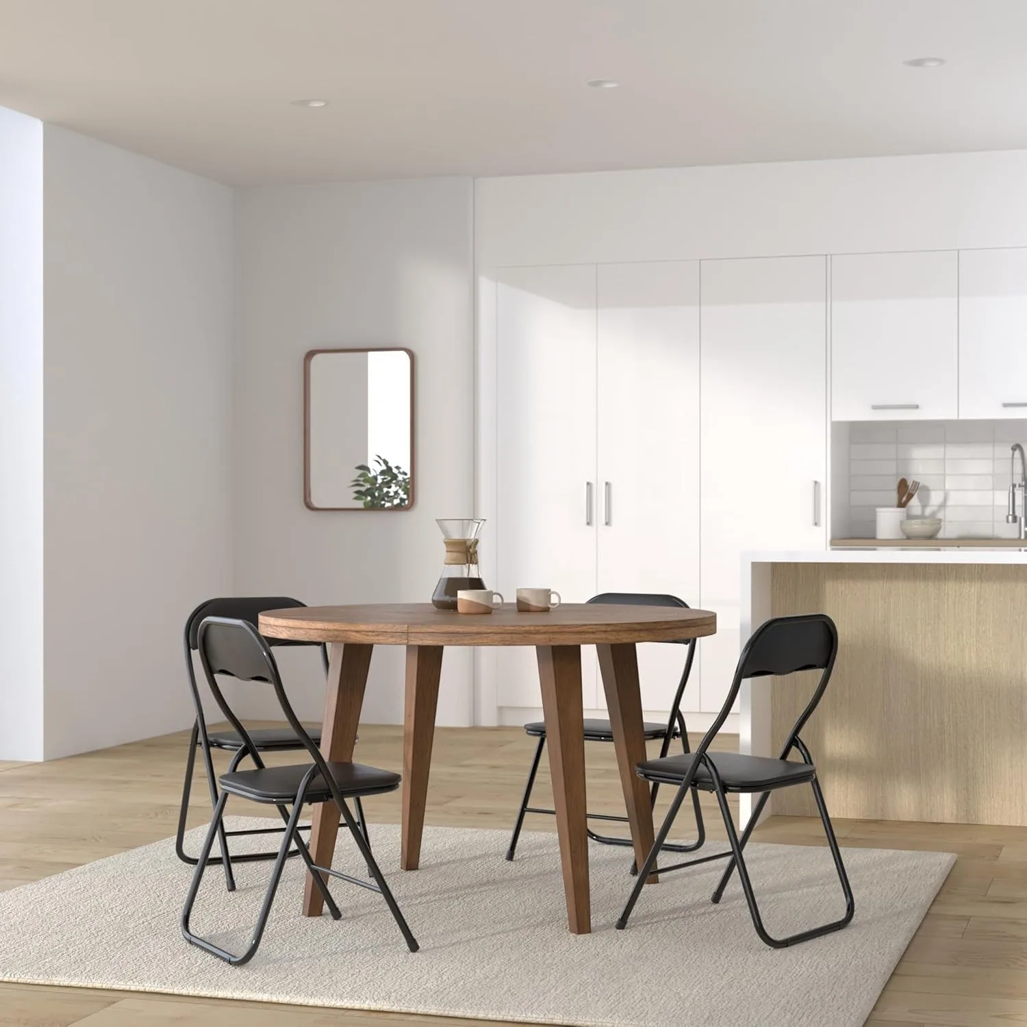 Su estructura de metal y asiento y respaldo en piel sintetica tienen un acabado bonito, de fácil limpieza, es resistente y su plegado es mínimo, las podrás guardar en el armario o el altillo de casa, comprueba sus medidas plegada! Esta silla plegable esta acolchada tanto en el respaldo y asiento para aportar una buena comodidad. No requiere montaje, solo tendrá que desplegar la silla y estará lista para su uso, nunca sabemos cuando pueden llegar nuestros invitado, ni tampoco cuantos vendrán! Estas sillas son ideales para utilizar como asientos axilares en cualquier estancia, para celebraciones, congresos, asociaciones, o simplemente como silla de escritorio o de oficina, asiento auxiliar en la cocina o incluso como silla para camping, tu decides!! Gracias a su diseño es muy ligera y resistente, es uno de sus puntos fuertes, la podrá transportar con total facilidad, su tornilleria también es de metal, tiene tacos de coma en las patas con el fin de no rayar suelos delicados Juego de 6 sillas Plegables – Medidas 43,9 x 44,5 x 78 cm – Color Taupe Tubo de Ø 22 mm – Dimensiones: 43,9 *44,5*78 cm
