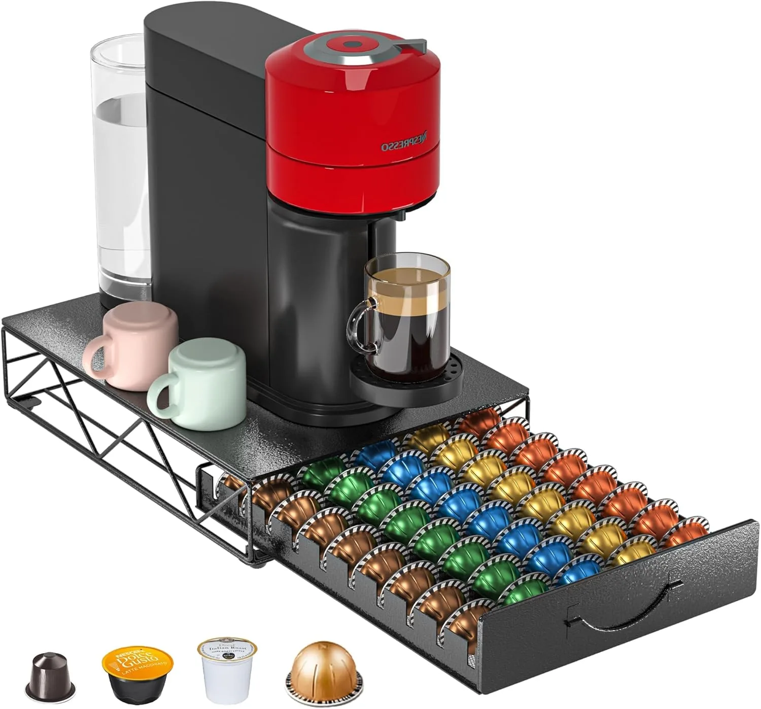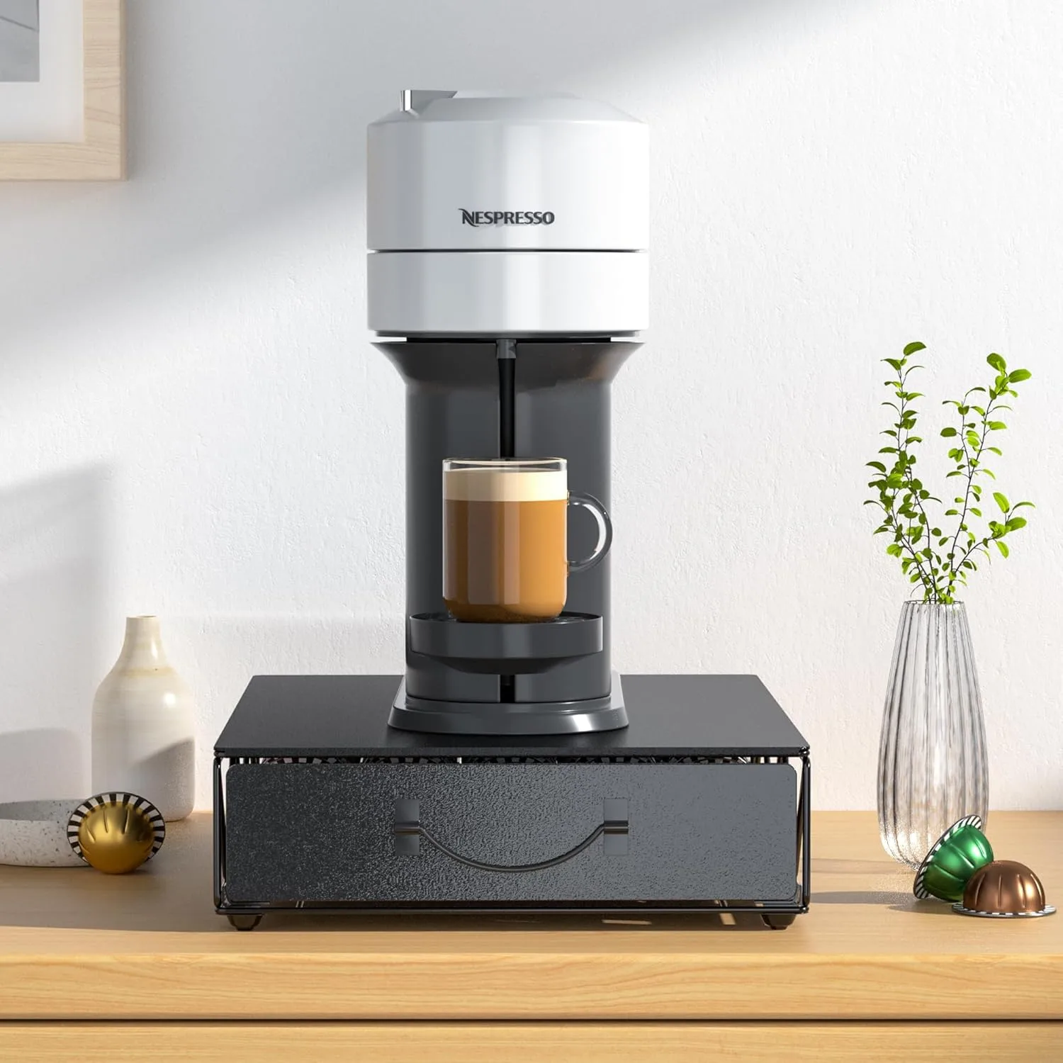 Organizador de 50 Cápsulas Nespresso Vertuo y Dolce Gusto – Soporte Antideslizante y Silencioso para Cápsulas Vertuo, Cajón Metálico para Almacenamiento de Café