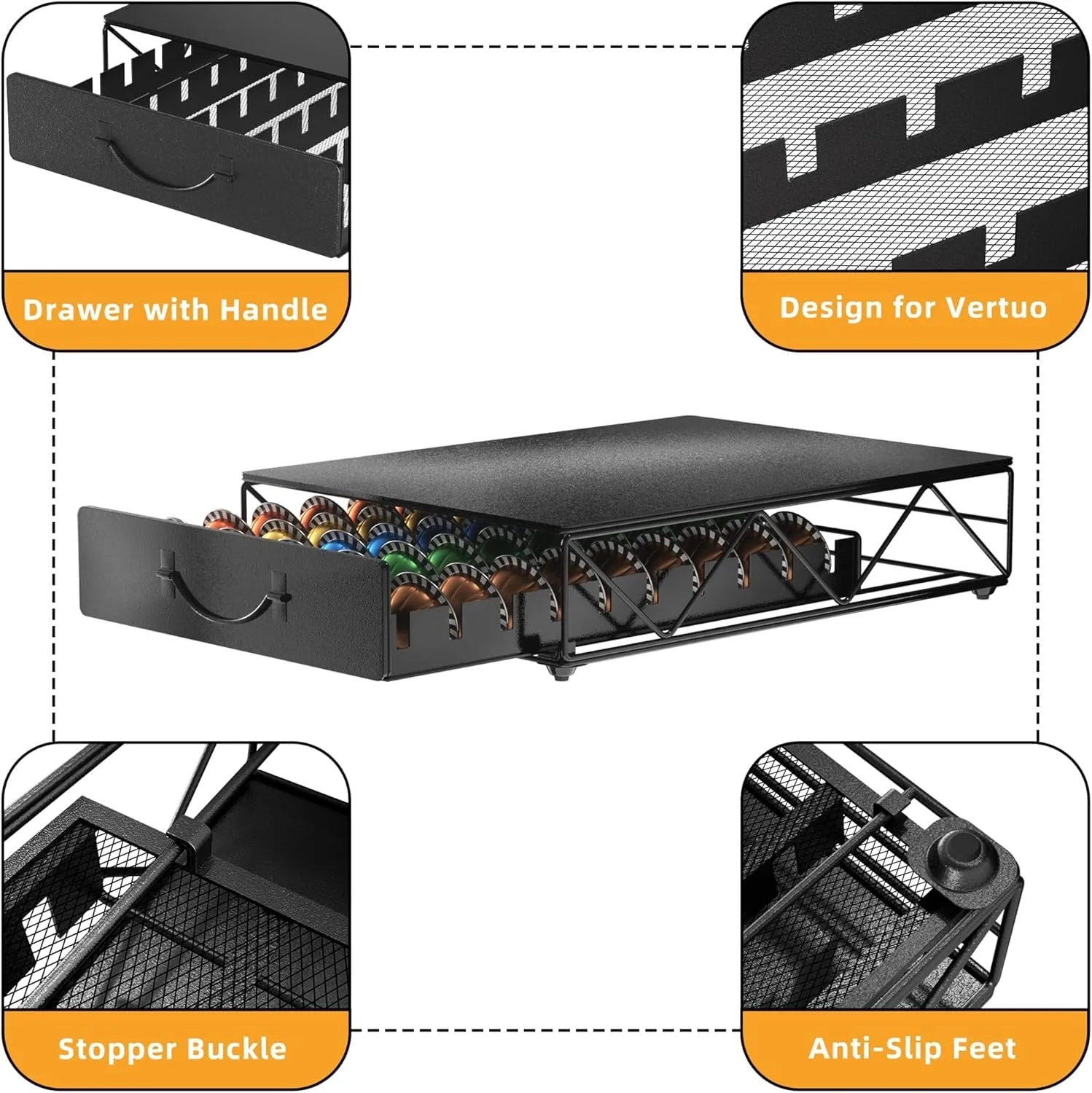 Resumen del producto: Organizador de 50 Cápsulas Nespresso Vertuo y Dolce Gusto – Soporte Antideslizante y Silencioso para Cápsulas Vertuo, Cajón Metálico para Almacenamiento de Café