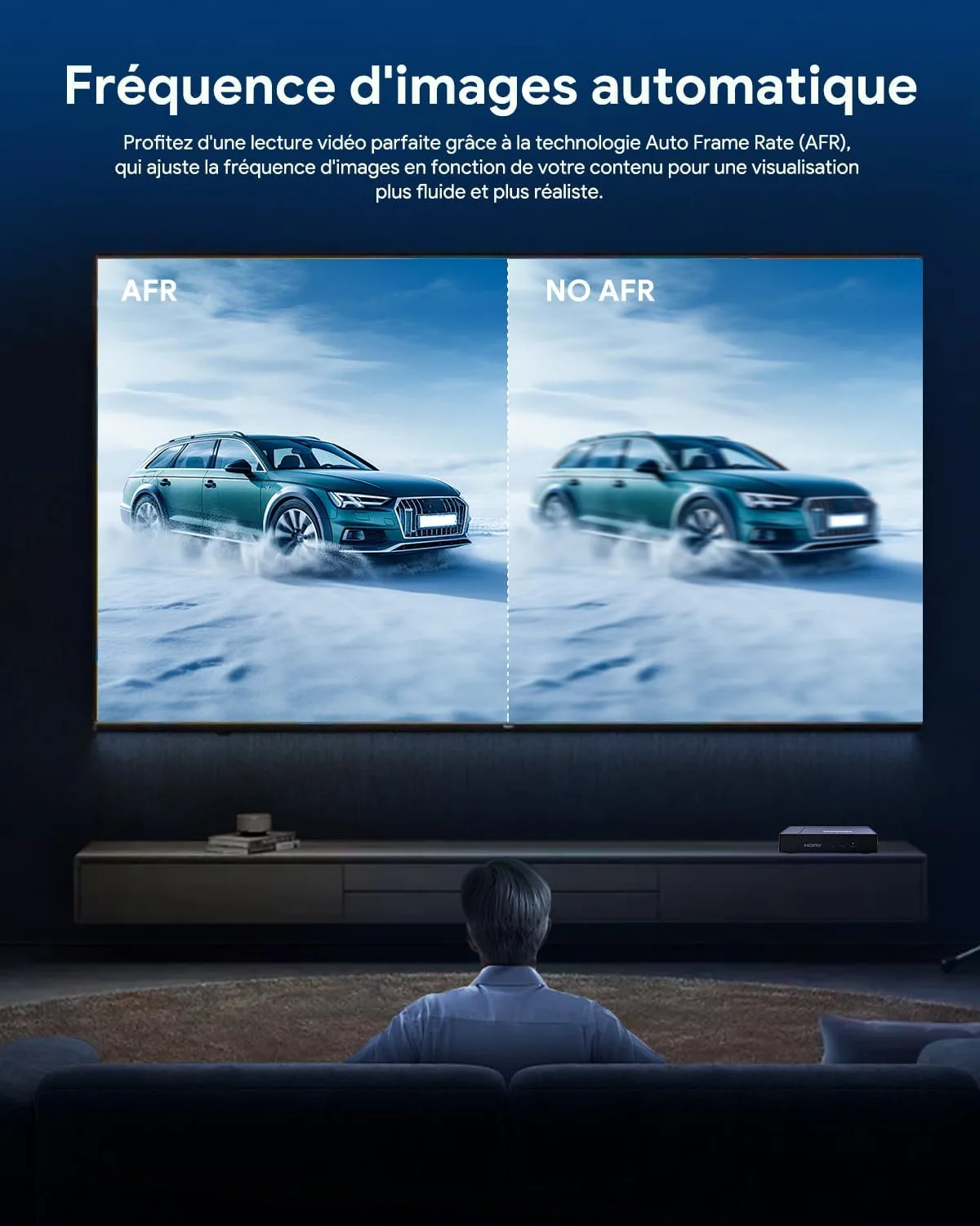 【Velocidad de Cuadros Automática】Smart tv box disfruta de una reproducción de video impecable con la tecnología de velocidad de cuadros automática (AFR), que ajusta la velocidad de cuadros para que coincida con tu contenido y te permite disfrutar de una visualización más fluida y realista.