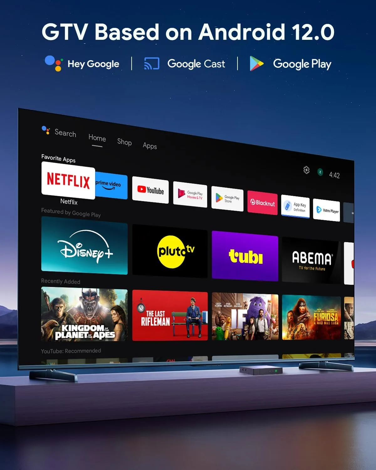 【Certificado Google y Netflix】La caja de TV transmite más de 800.000 películas y episodios de televisión. Ve tus favoritos de Netflix, Prime Video, Disney+, Youtube y más, y escucha millones de canciones. Chromecast integrado facilita la proyección de contenidos de dispositivos inteligentes en el televisor, lo que permite un ángulo de visión más amplio.
