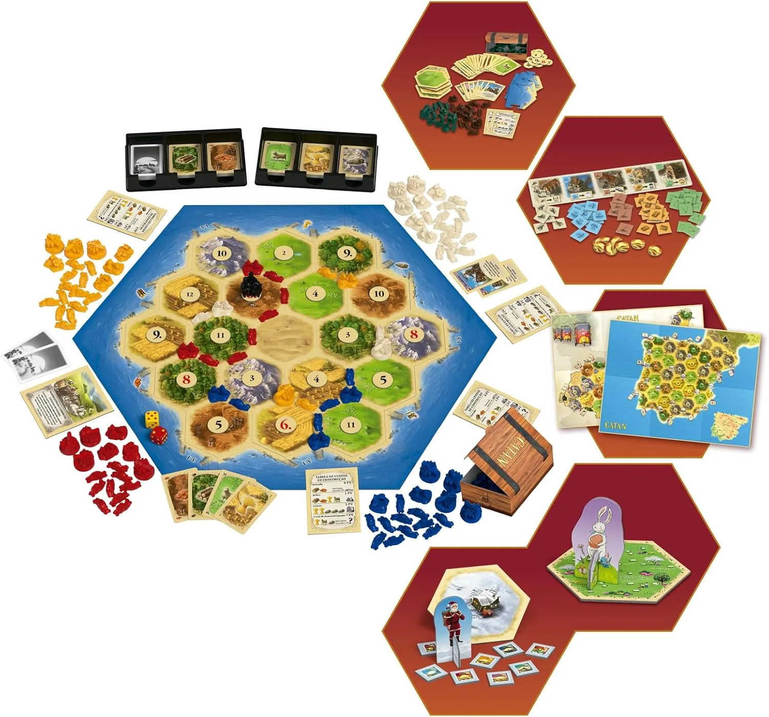 Entra por la puerta grande en el mundo de Catan. Esta edición incluye el juego básico, la ampliación para 5-6 jugadores, la miniexpansión ‘Entre amigos’, dos escenarios alternativos de preparación de partida (en la que en vez de jugar en la isla con forma de hexágono lo haremos o bien en la India o bien en la Península Ibérica) y las miniexpansiones Santa Claus y El conejo de Pascua. ESTÁS PREPARADO, el clásico de Klaus Teuber nunca pasa de moda y ahora tienes la oportunidad de descubrir el juego de mesa que revolucionó el sector con la edición más completa existente.