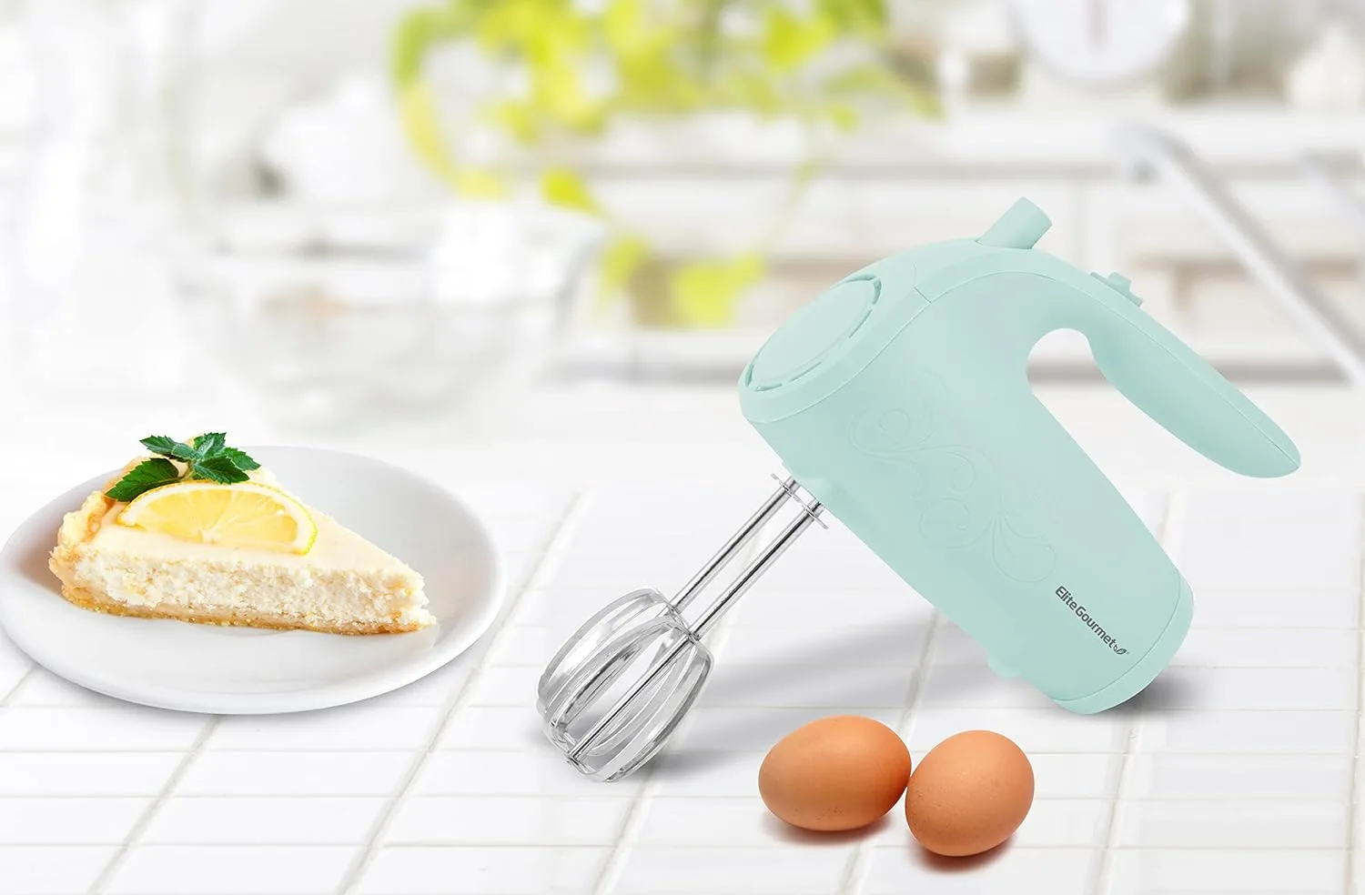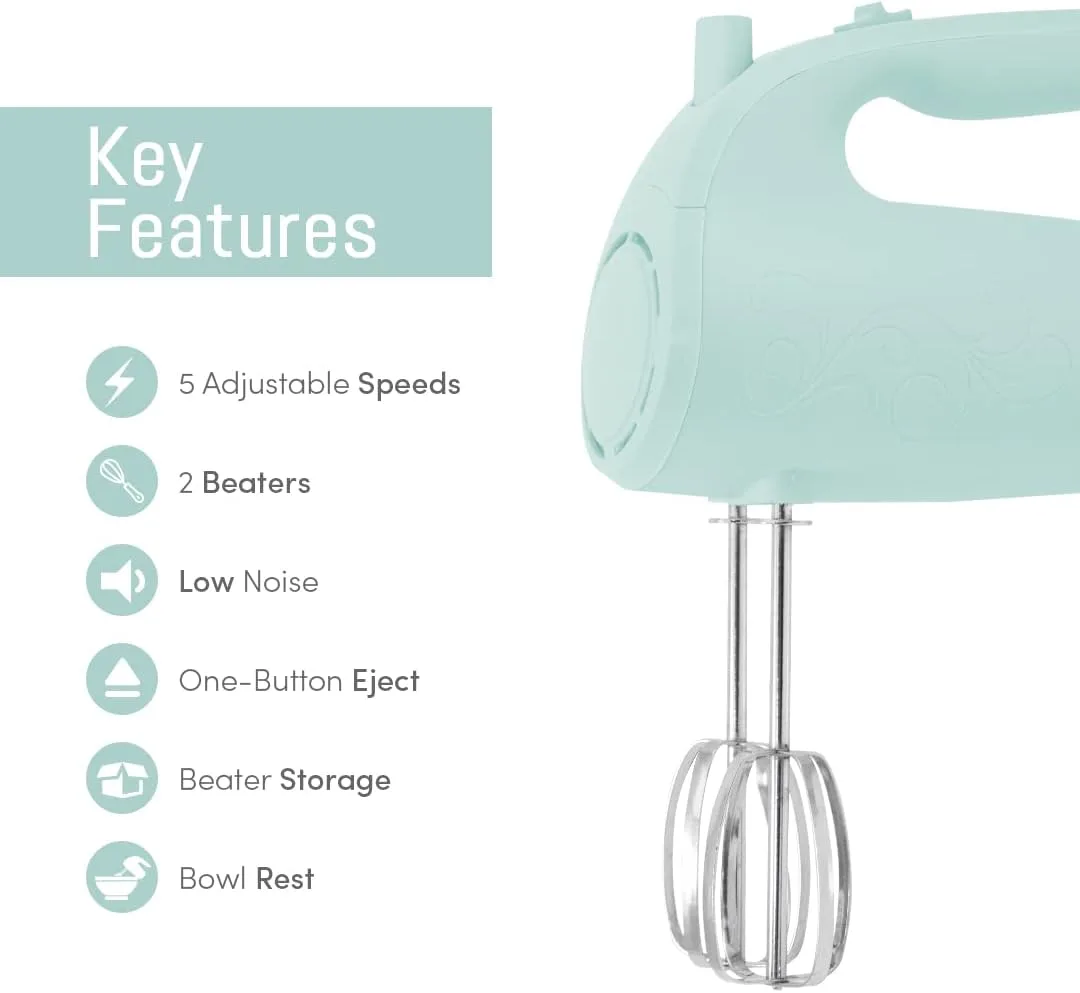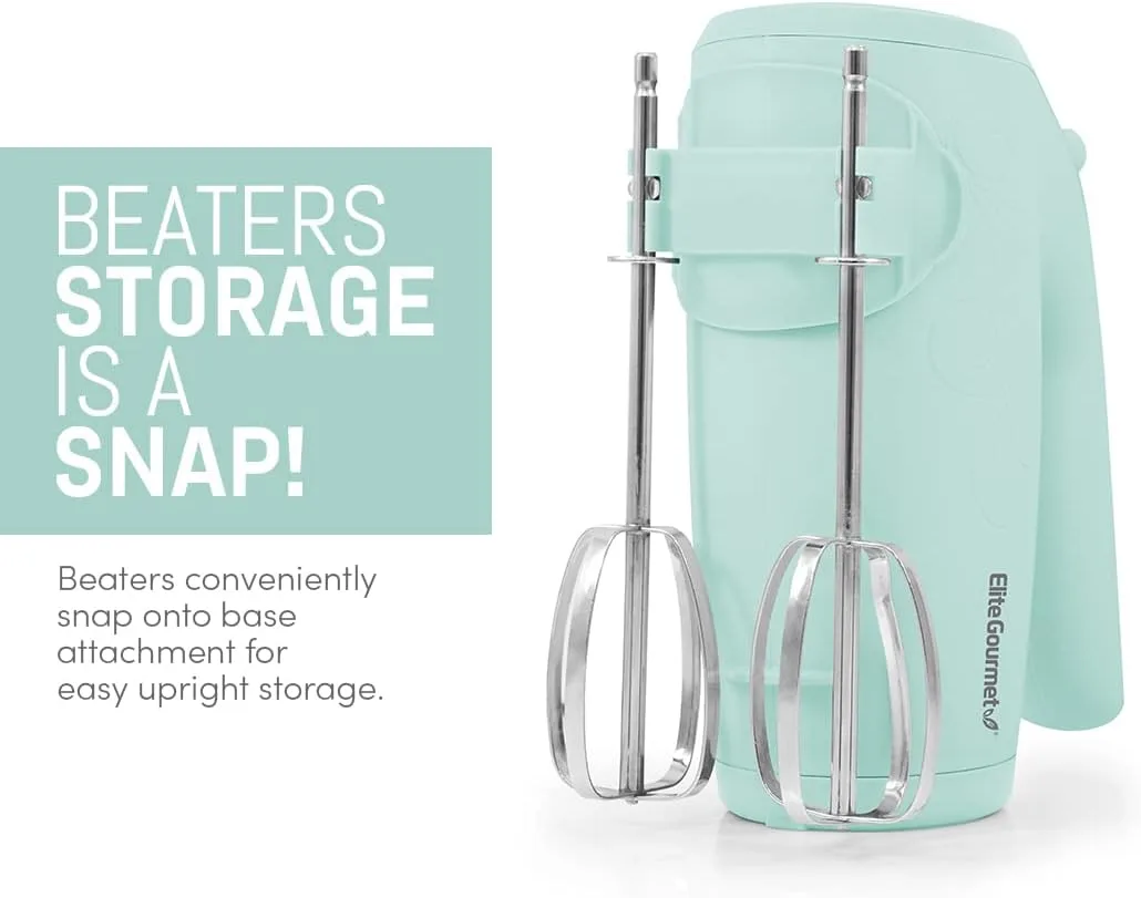 Elite Gourmet EHM003M Batidora de mano eléctrica Ultra Power, 5 velocidades, 2 varillas extraanchas de acero inoxidable, mezclas cremosas y suaves, práctico almacenamiento del batidor, azul menta