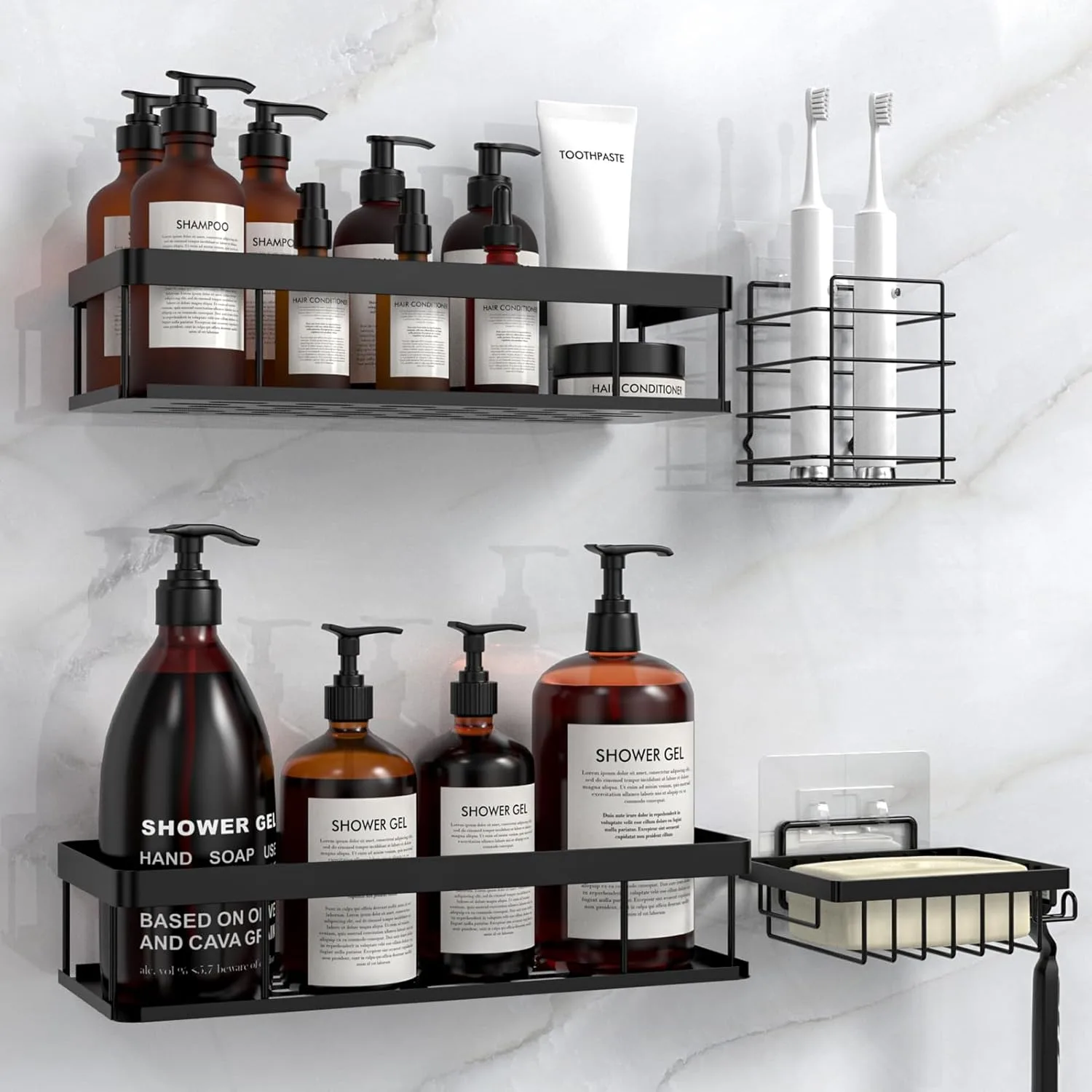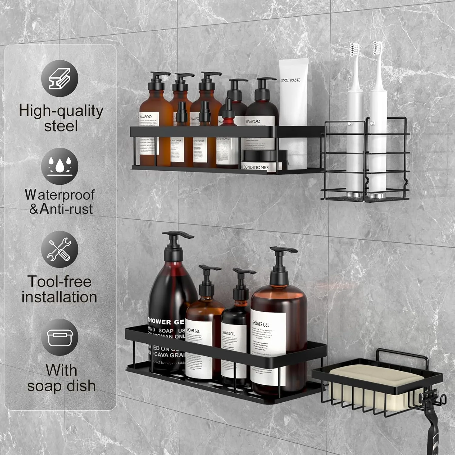 【Paquete de 4 organizador baño】Este organizador ducha incluye 2 estanterías para baño, 1 soporte para jabón y 1 soporte para cepillo de dientes. Puedes usarlo en el baño, la cocina o en cualquier lugar donde necesites almacenamiento adicional.