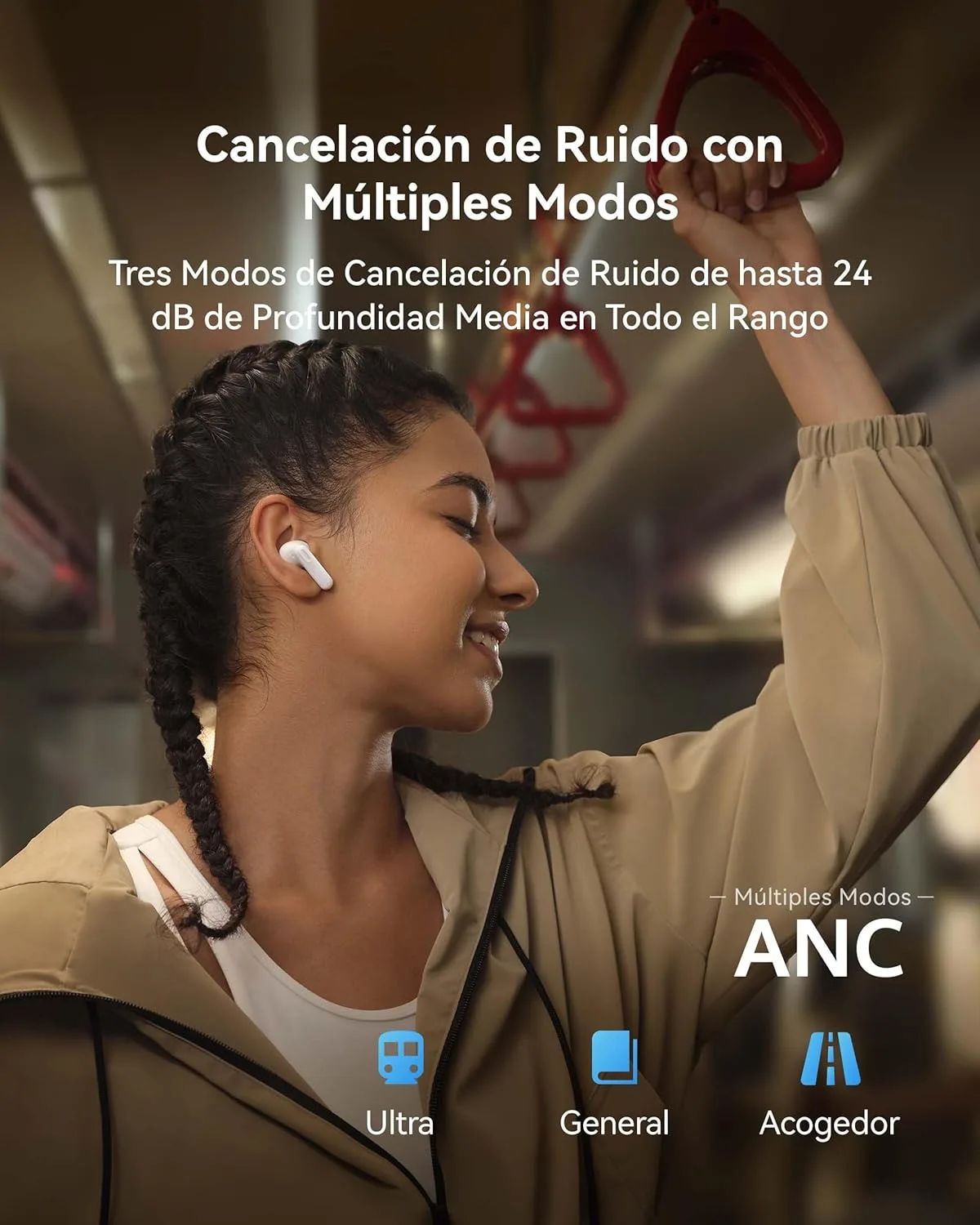 Estos auriculares carecen de ANC, diría que es una de las cosas más criticables de este producto. Son auriculares abiertos, así que si tuviese ANC no creo que se desempeñe al igual de bien que unos con "gomitas". Al carecer de ANC y ser abiertos, debes subir el volumen entre un 50-80% para que el ruido de fondo pase a un segundo plano.