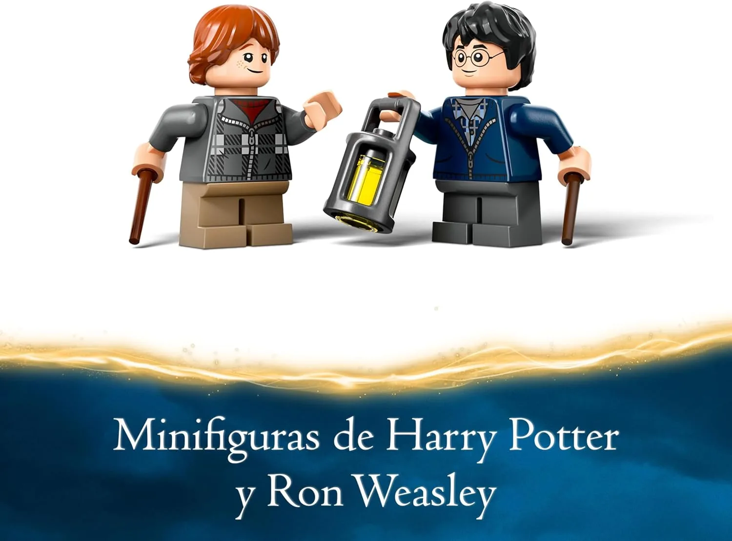 2 personajes LEGO Harry Potter de juguete: el set incluye minifiguras de Harry Potter y Ron Weasley con una cara feliz y otra asustada para elegir, así como 2 varitas mágicas y un elemento que representa un farol