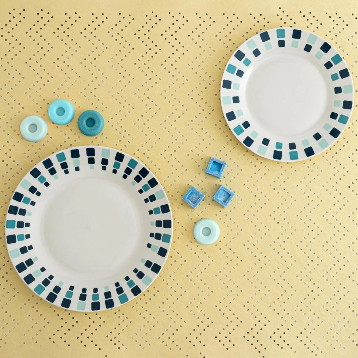 Fabricada en porcelana blanca Decorados en tonos azules, turquesa y gris