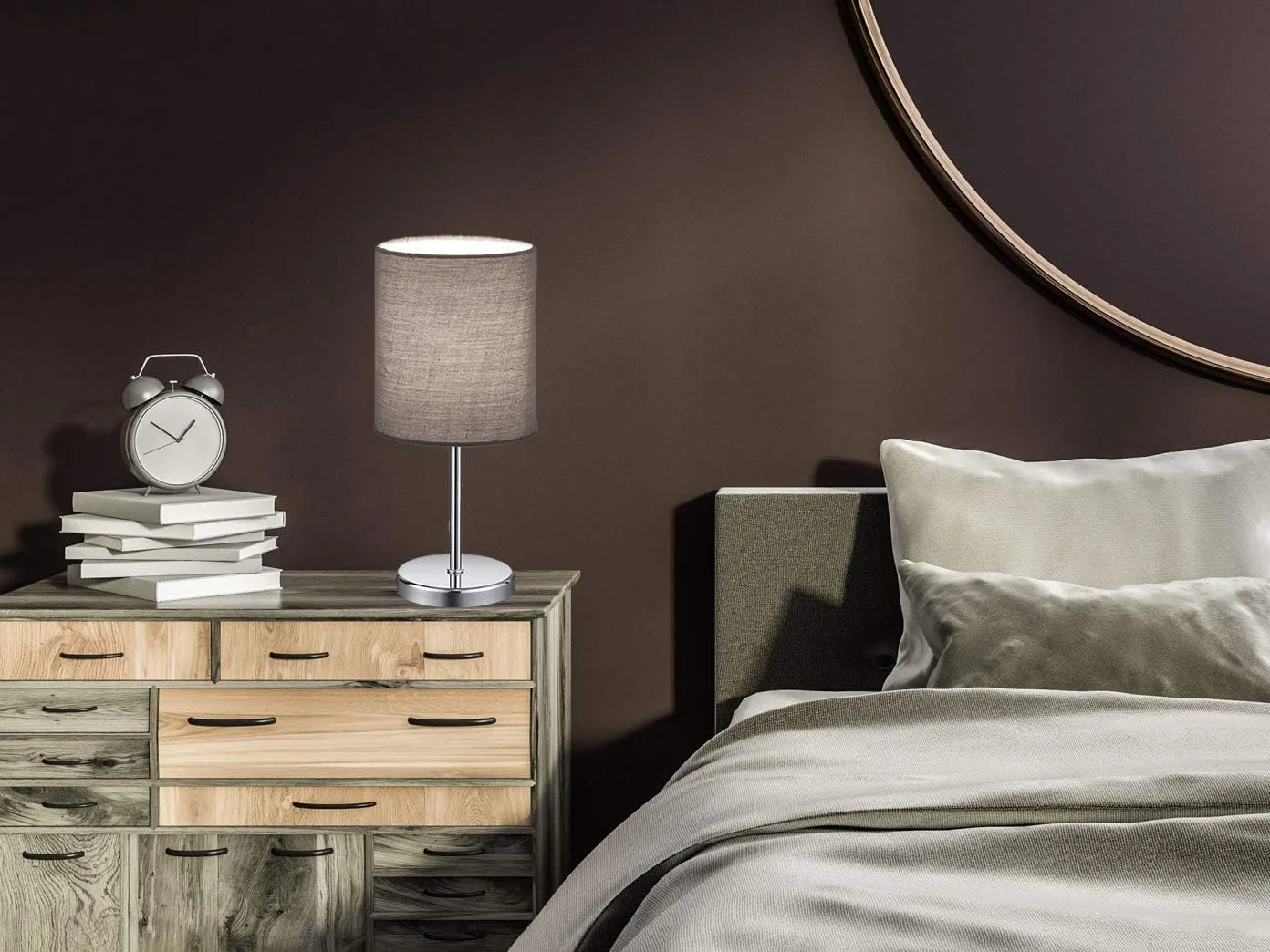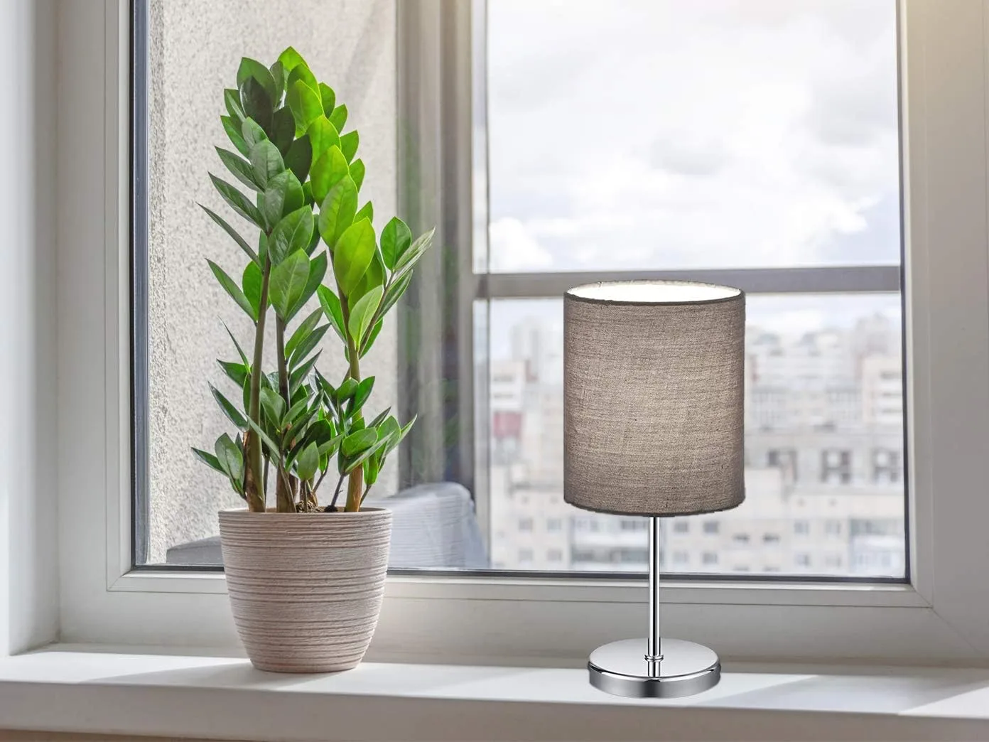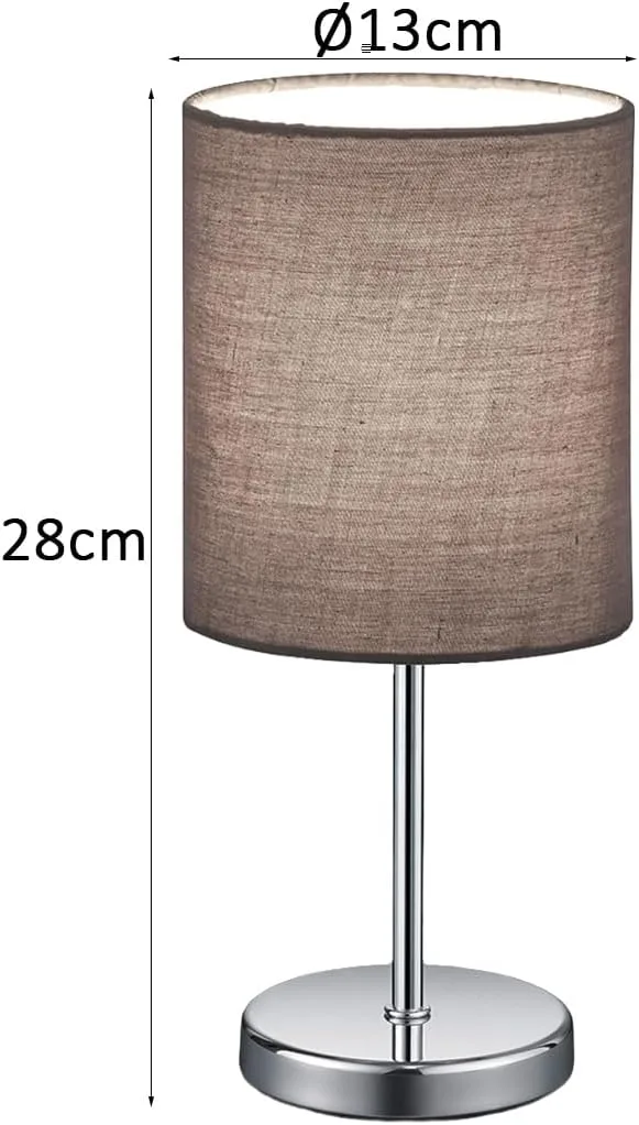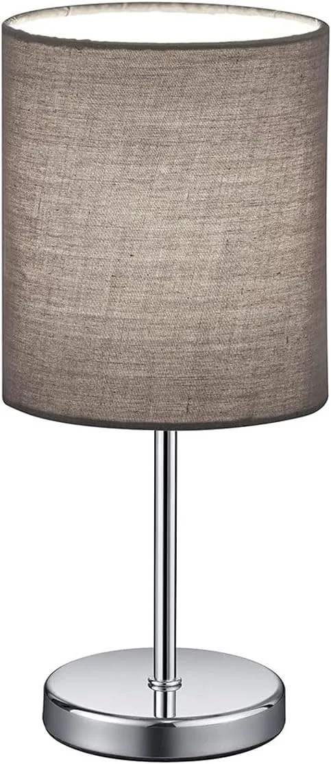 Lámpara de mesa Jerry en cromo con una pantalla de tela en el color gris