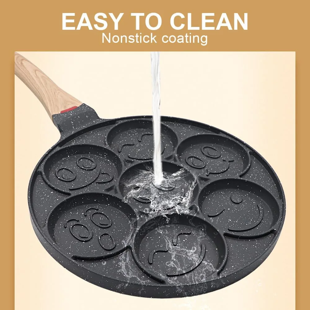 AHORRE SU DESAYUNO: Este molde para panqueques es perfecto para hacer panqueques, como pastel de maíz, panqueque de verduras, panqueque de huevo, etc. El agujero súper lindo de 7 caras sonrientes puede hacer fácilmente 7 panqueques o 7 tipos de comida al mismo tiempo, lo que puede ahorrarle mucho la hora del desayuno.