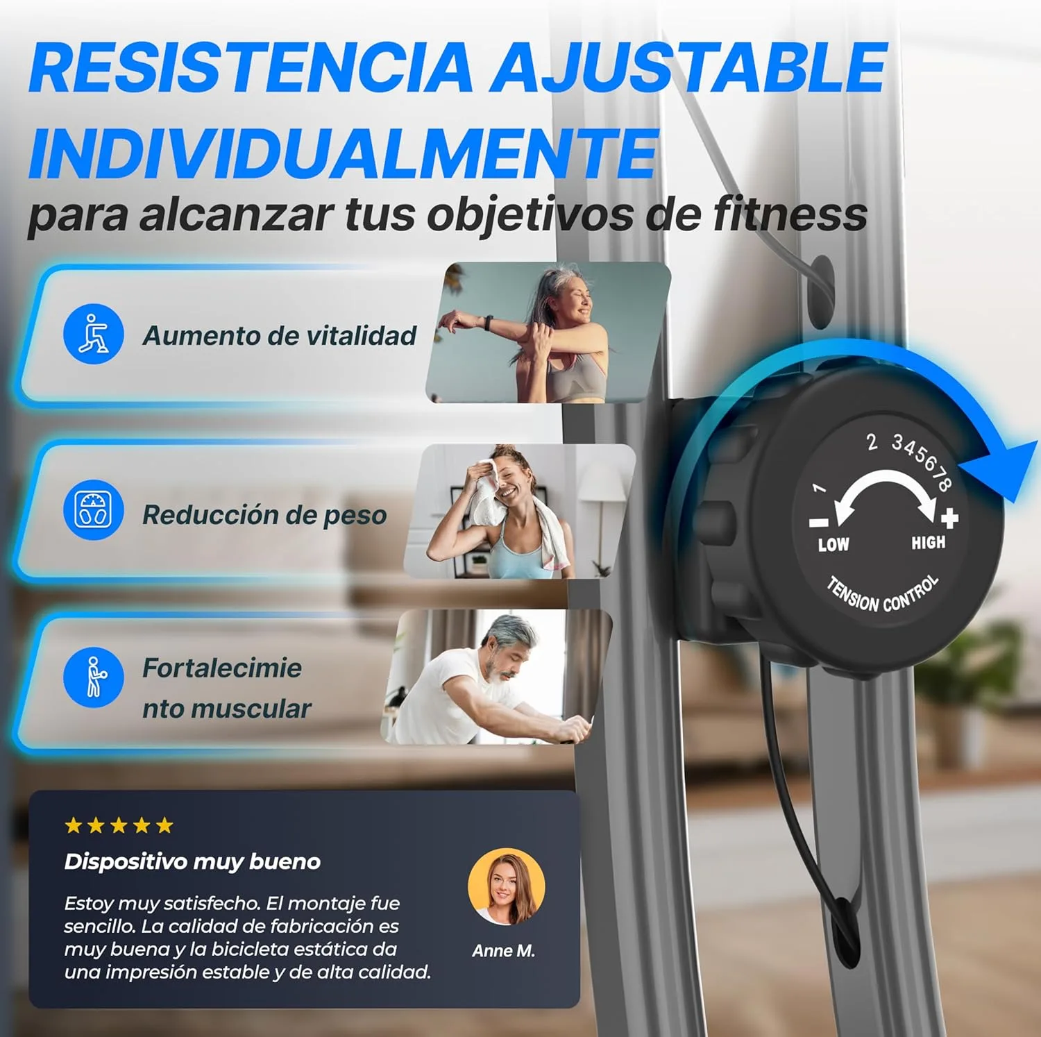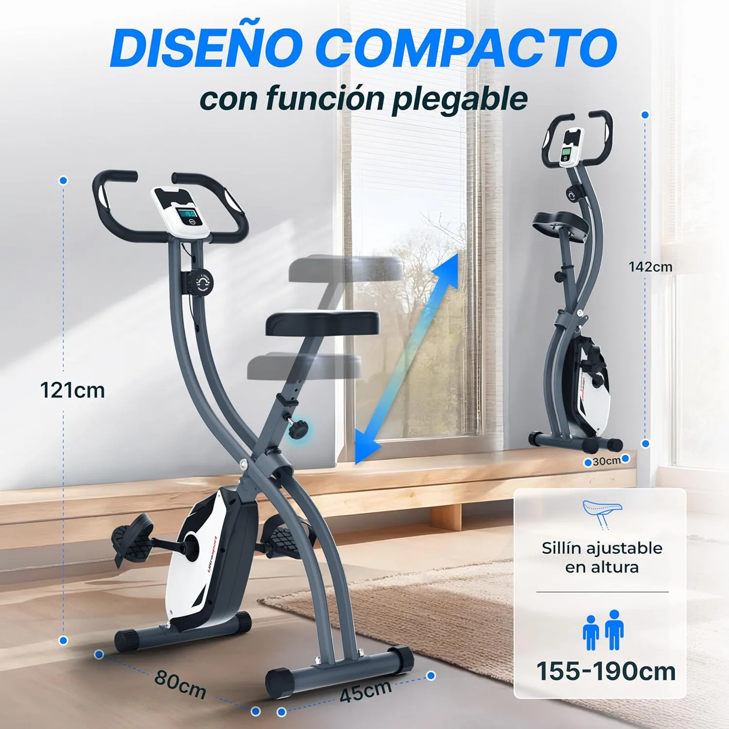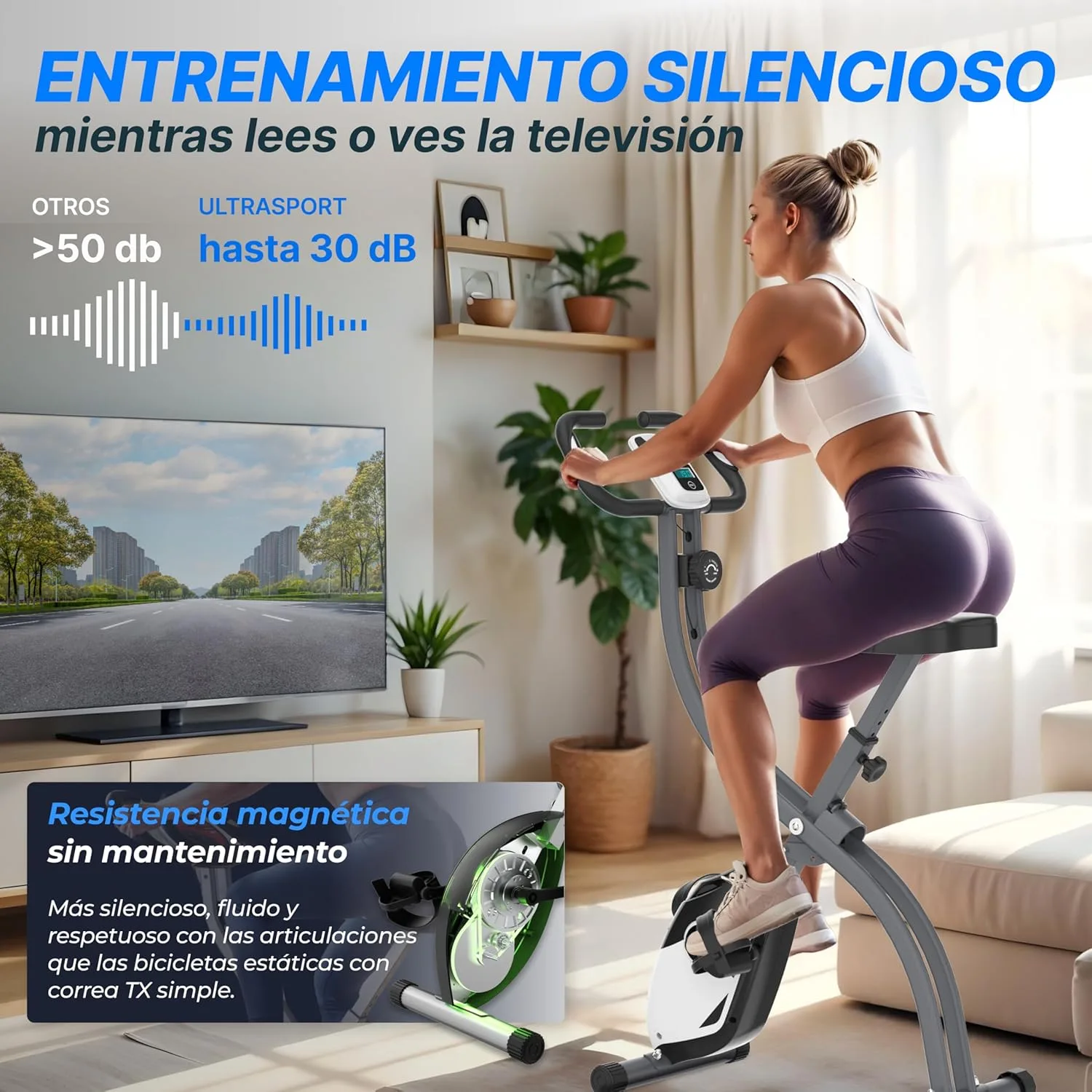 Bicicleta estática plegable, cuando no la usas la puedes plegar y ocupa poco espacio y en un instante la tienes en disposición de ser usada. Es silenciosa y para un ejercicio de mantenimiento cumple, creo que sobradamente.