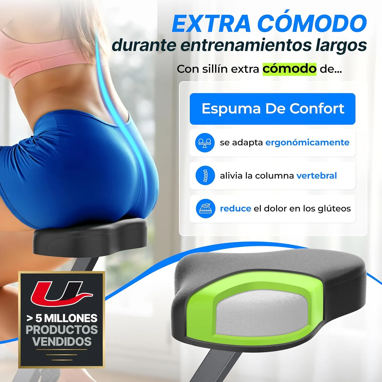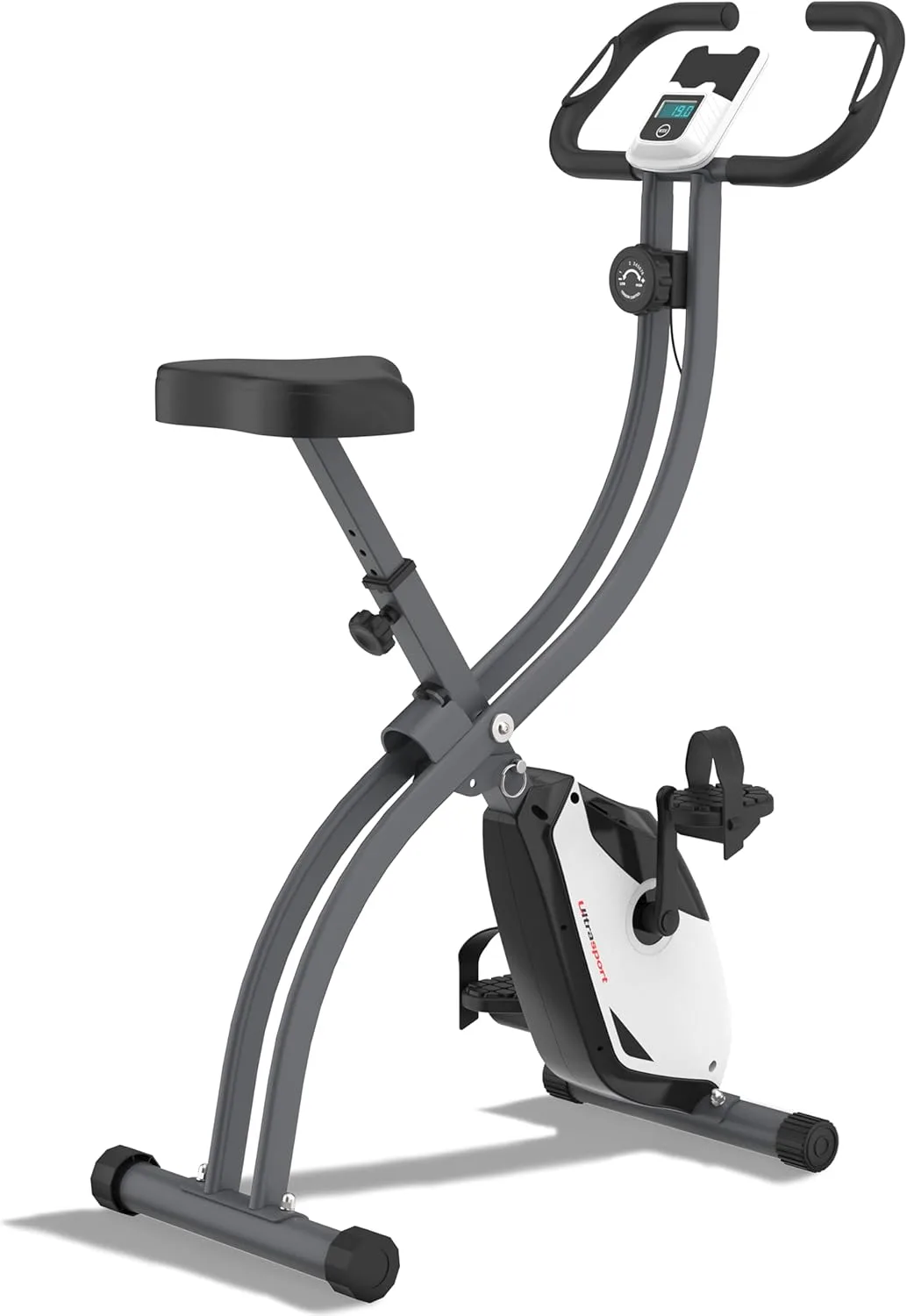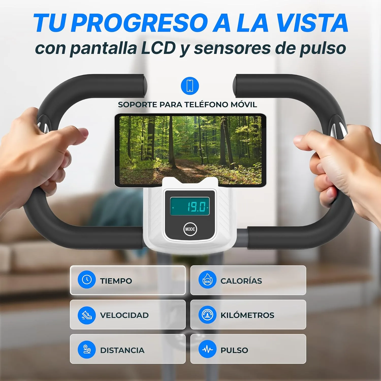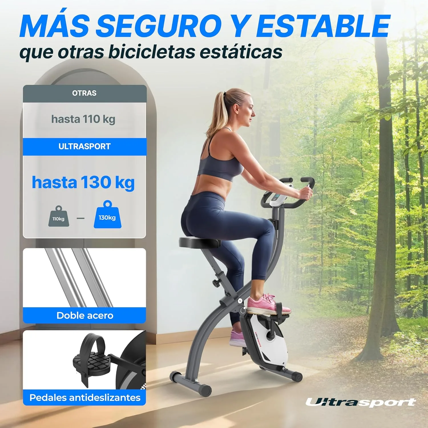 Bicicleta estática plegable, cuando no la usas la puedes plegar y ocupa poco espacio y en un instante la tienes en disposición de ser usada. Es silenciosa y para un ejercicio de mantenimiento cumple, creo que sobradamente.