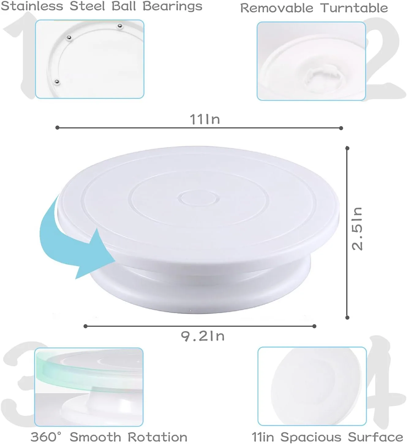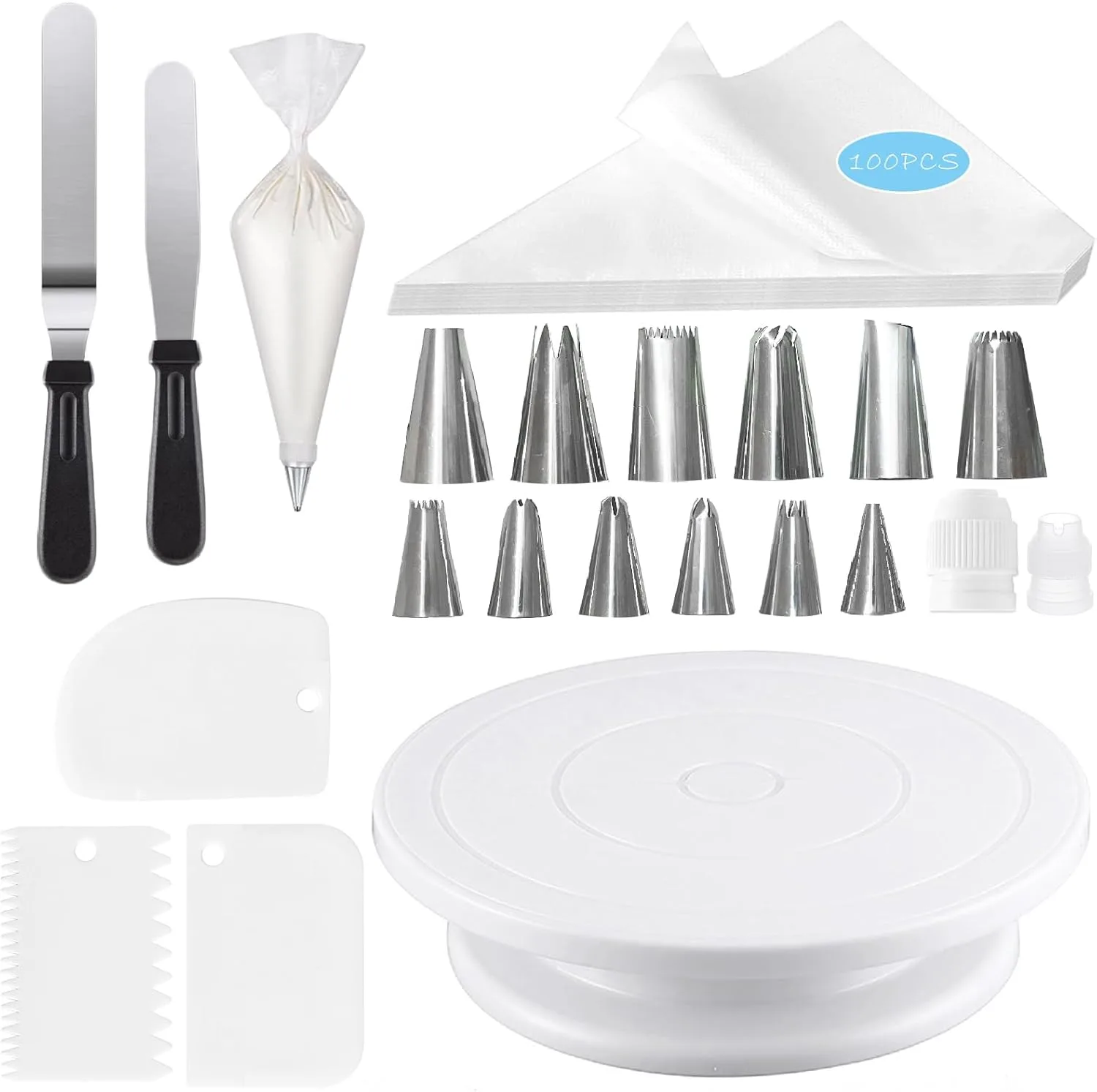 Bandeja giratoria para tartas, 120 piezas, juego de accesorios para tartas con soporte giratorio de 360°, 100 mangas pasteleras desechables con 12 boquillas, 3 espátulas para tartas, 2