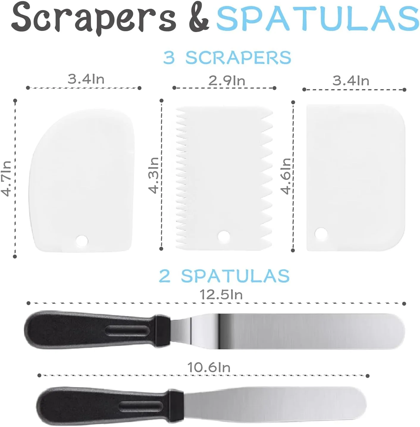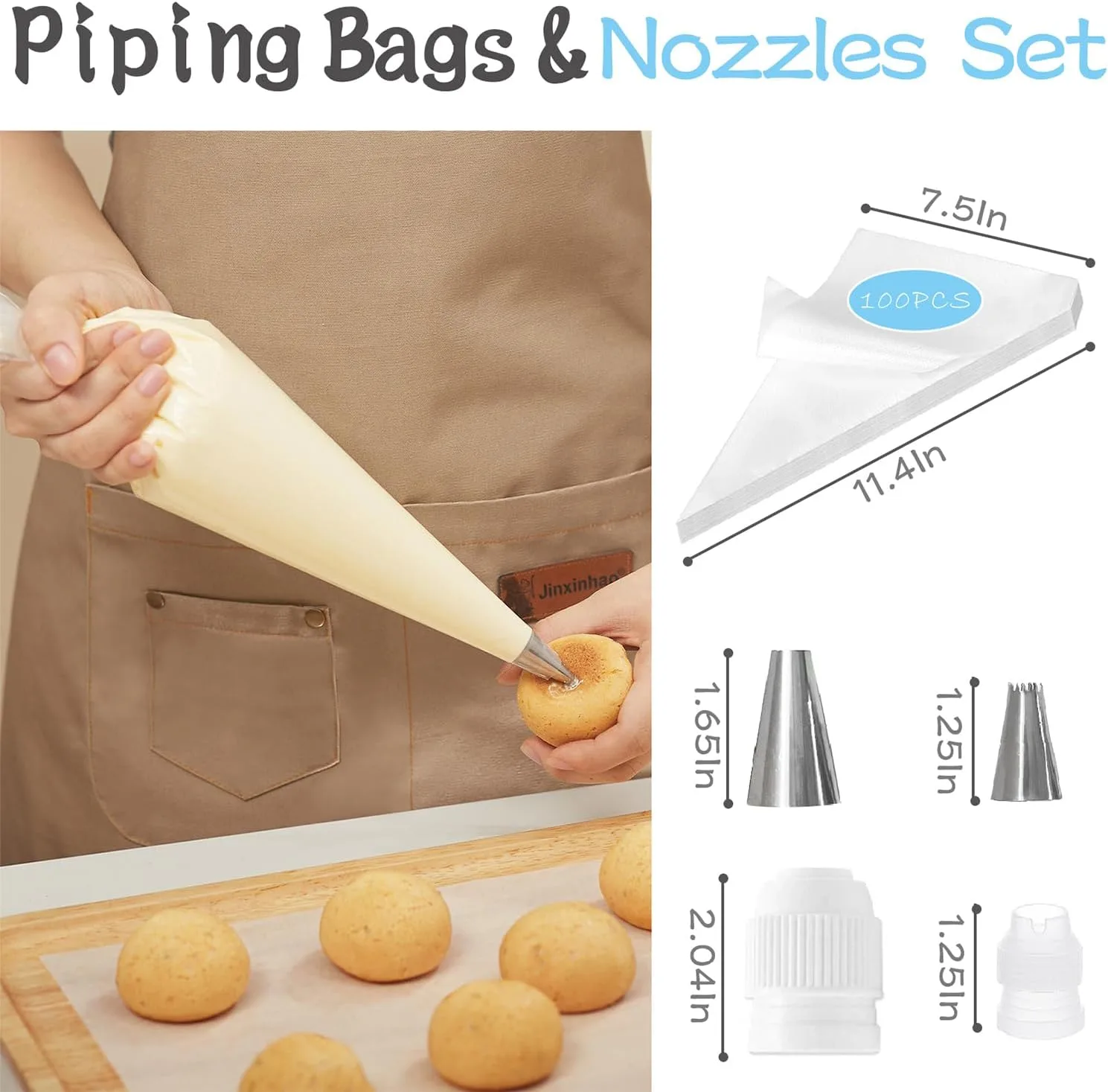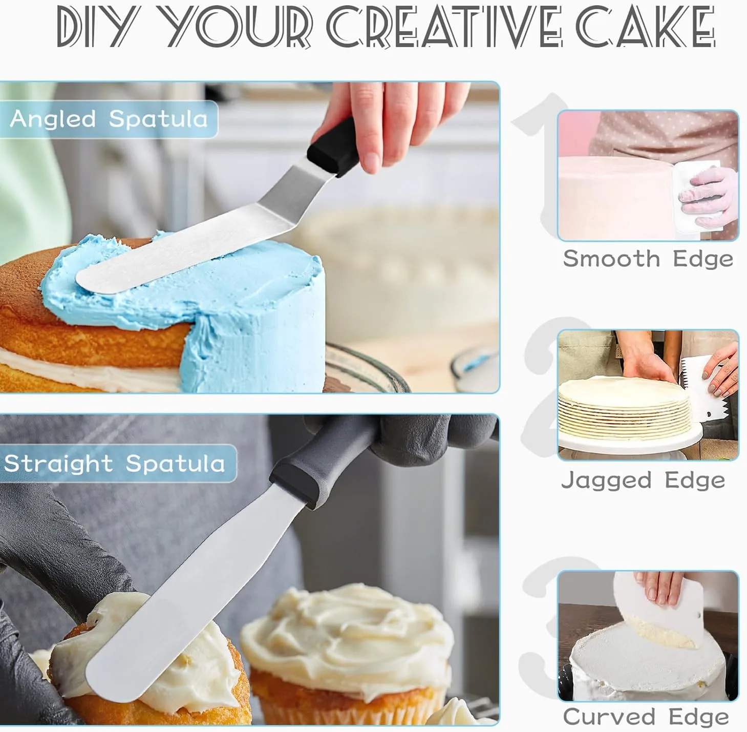 Juego completo de decoración de pasteles: nuestro juego de decoración de pasteles contiene todo lo que necesitas para decorar tartas. Cuenta con un soporte giratorio para tartas, 100 mangas pasteleras desechables con 12 boquillas, 3 espátulas para tartas, 2 espátulas para tartas y 2 acoplamientos. Disfruta de la comodidad de tener un conjunto completo de herramientas de decoración de pasteles en un solo paquete.