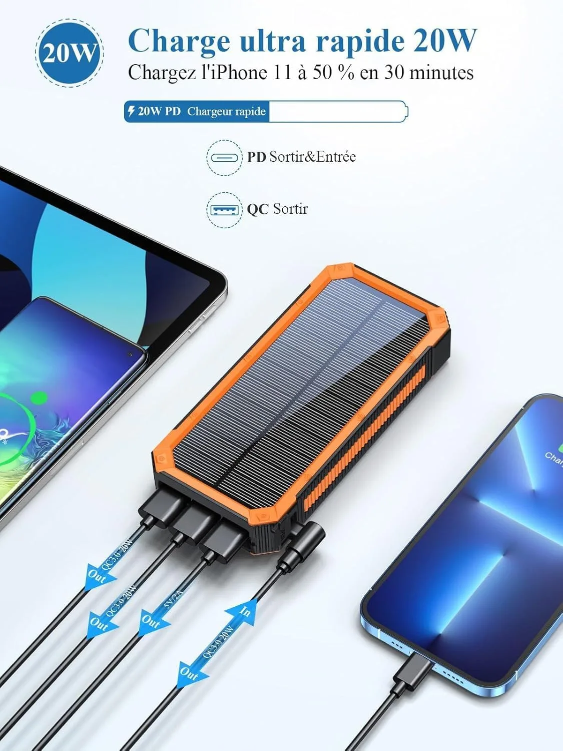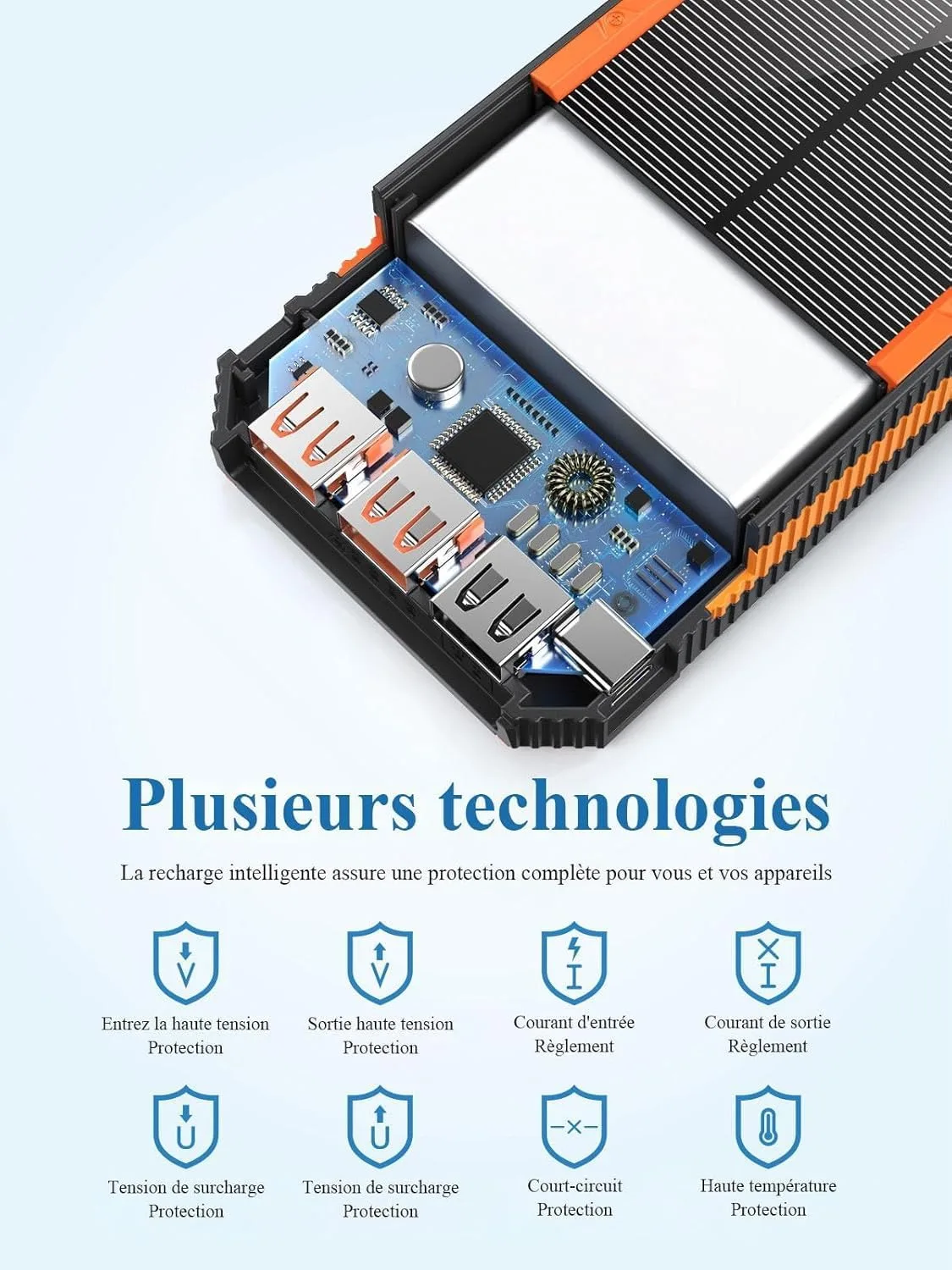 Alta capacidad: Los 20000 mAh, banco de energía solar tiene suficiente potencia, con una sola carga es la energía para días