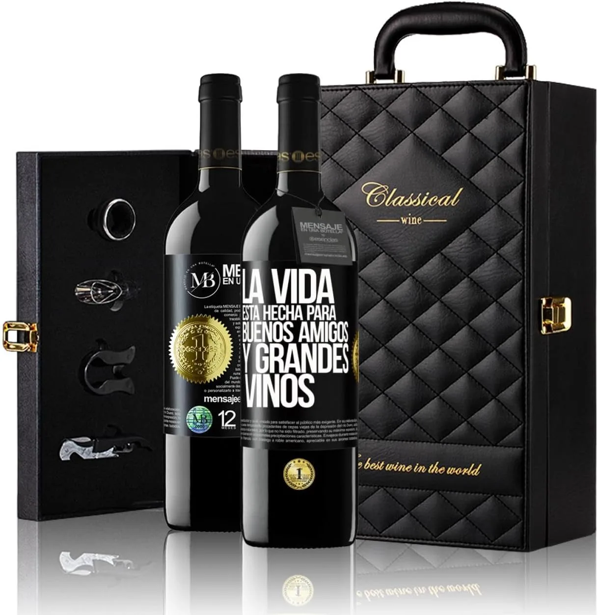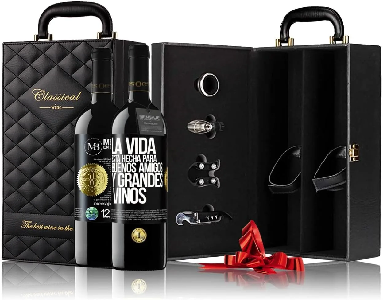 «La vida está hecha para buenos amigos y grandes vinos» Mensaje en una Botella. Estuche-Maletín de LUJO 2x Vino Tinto Premium Reserva 12 Meses y Set de 4 Accesorios. Etiqueta Negra PERSONALIZABLE