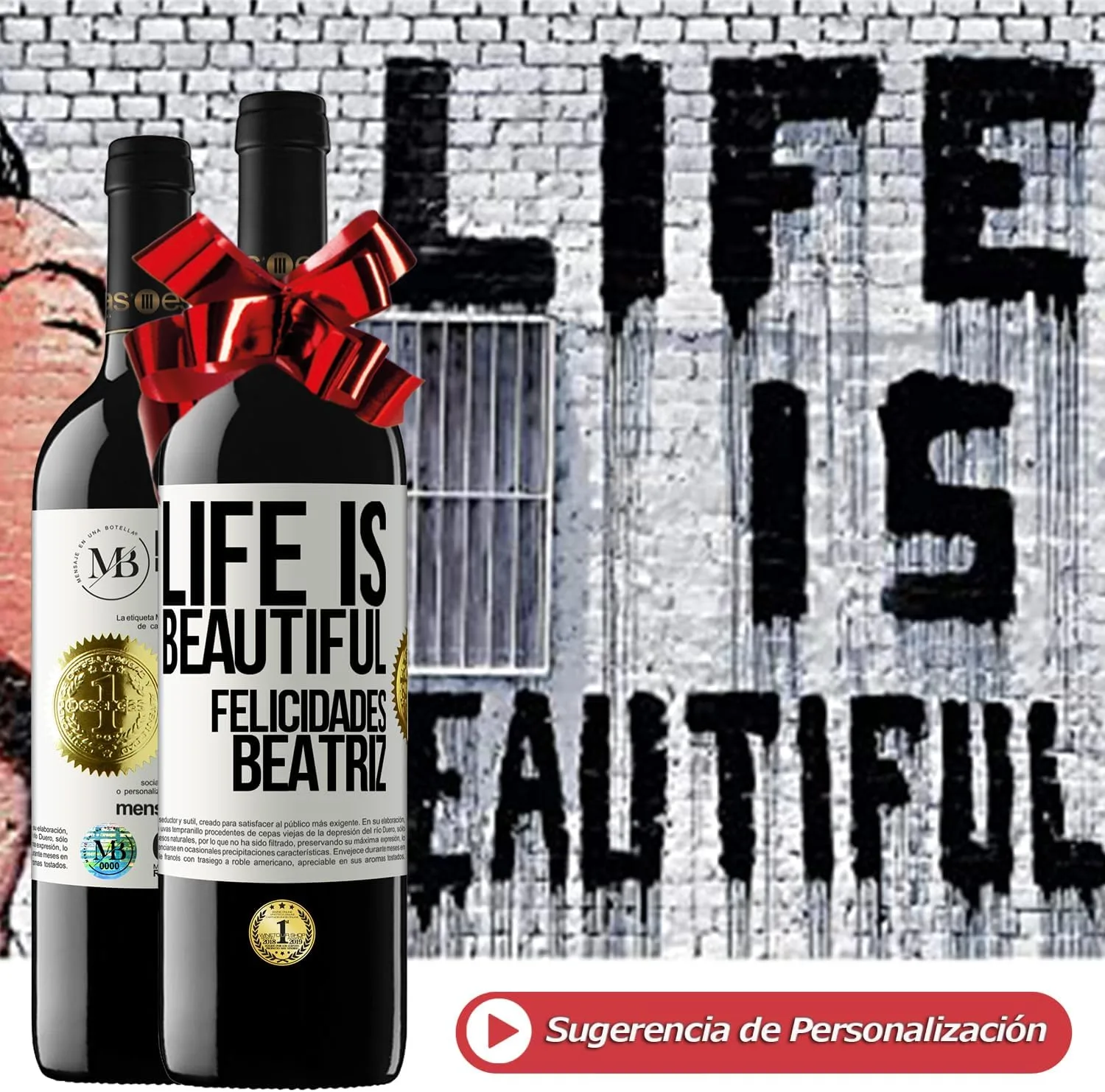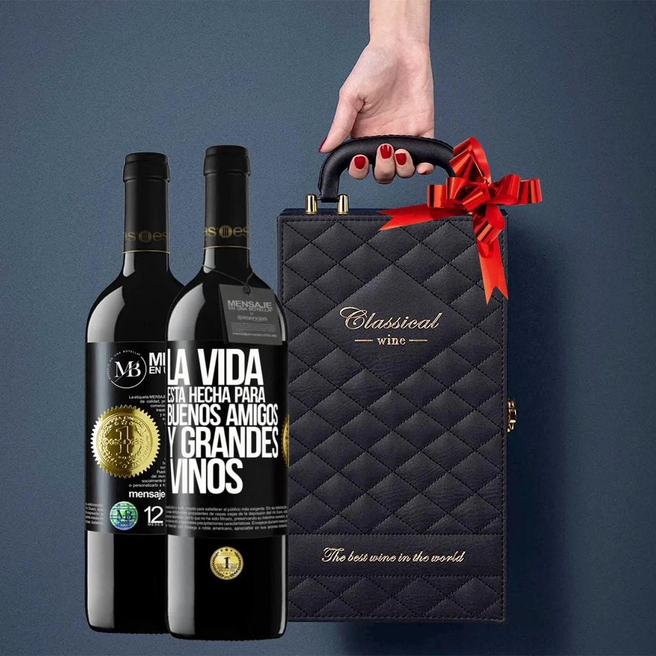 Se presenta con 2 Botellas de un Vanguardista Vino Premium MBE en una EDICION LIMITADA y PERSONALIZABLE que sin duda atraerá la atención en Aniversarios, Cumpleaños, Celebraciones, regalos de última hora, regalos de Navidad y Reyes, regalos de empresa, eventos o encuentros familiares.