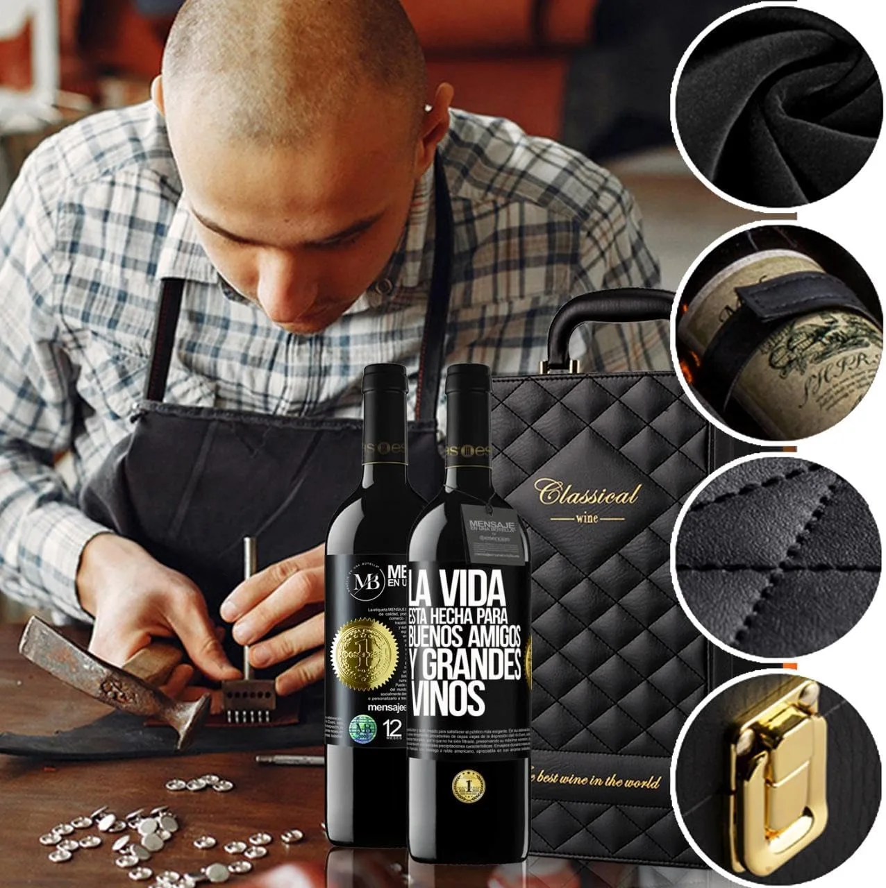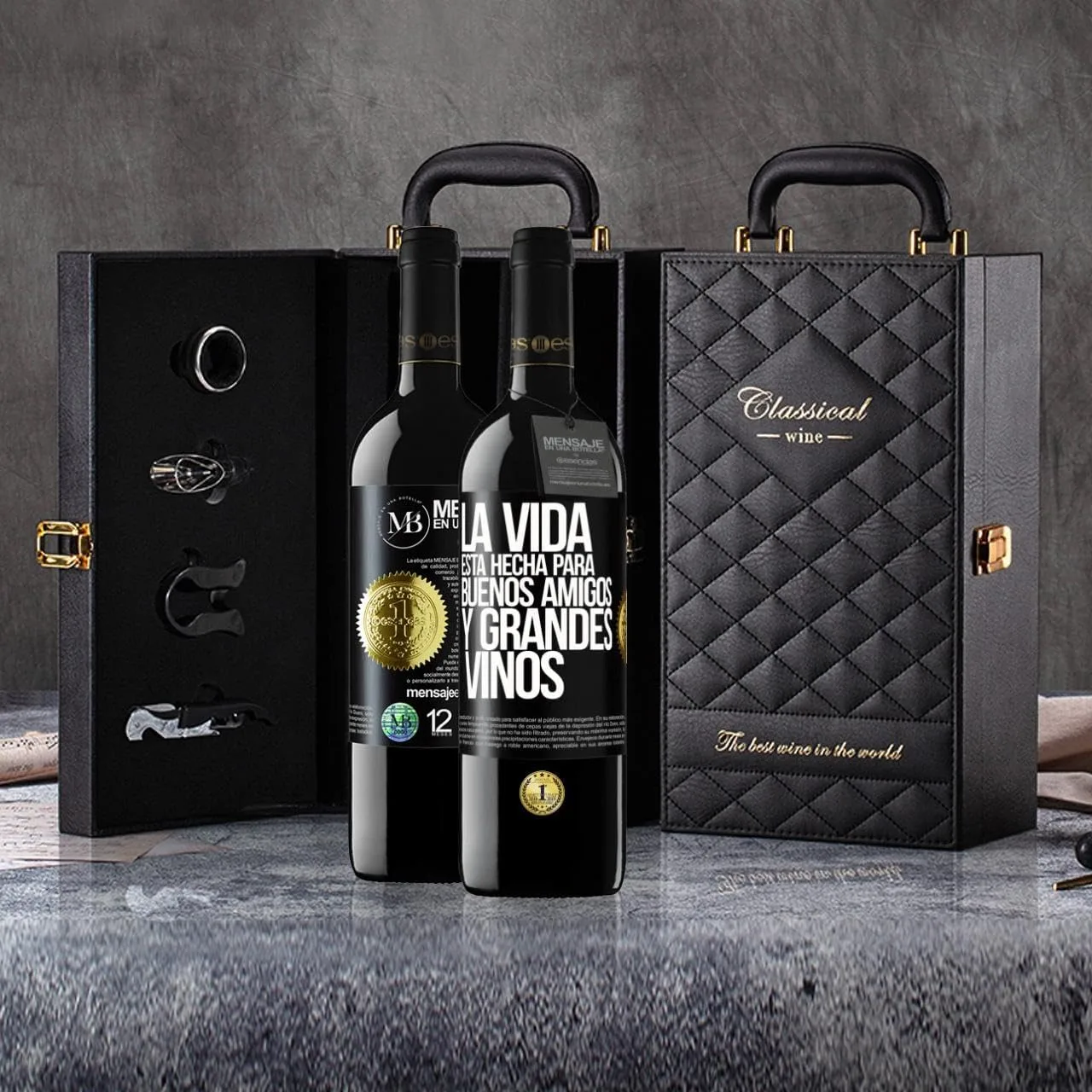 Lujoso y Exclusivo ESTUCHE-MALETÍN con Set de 4 Accesorios y 2 Botellas de Vino Premium que sin duda atraerá la atención de los más exigentes.
