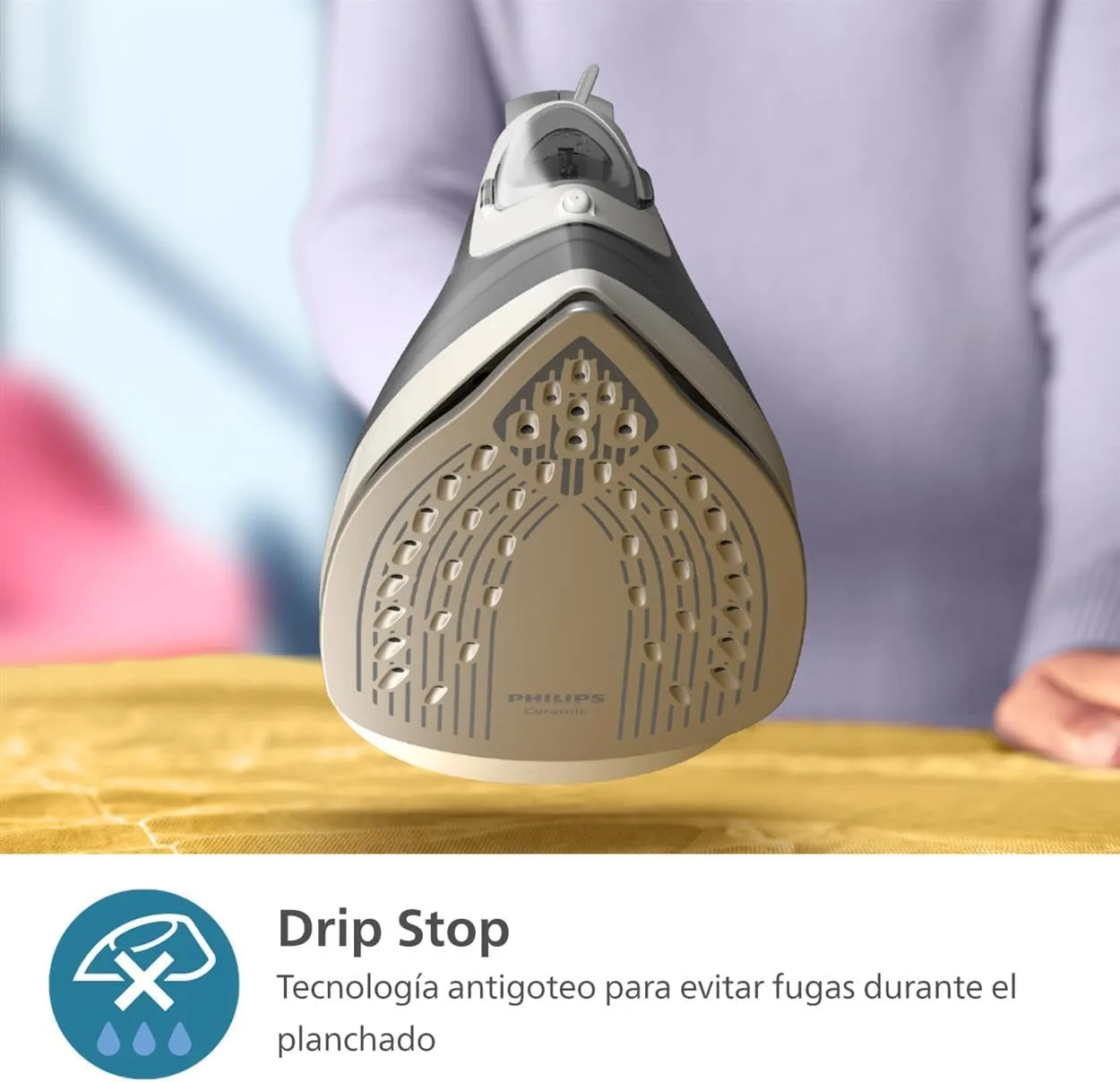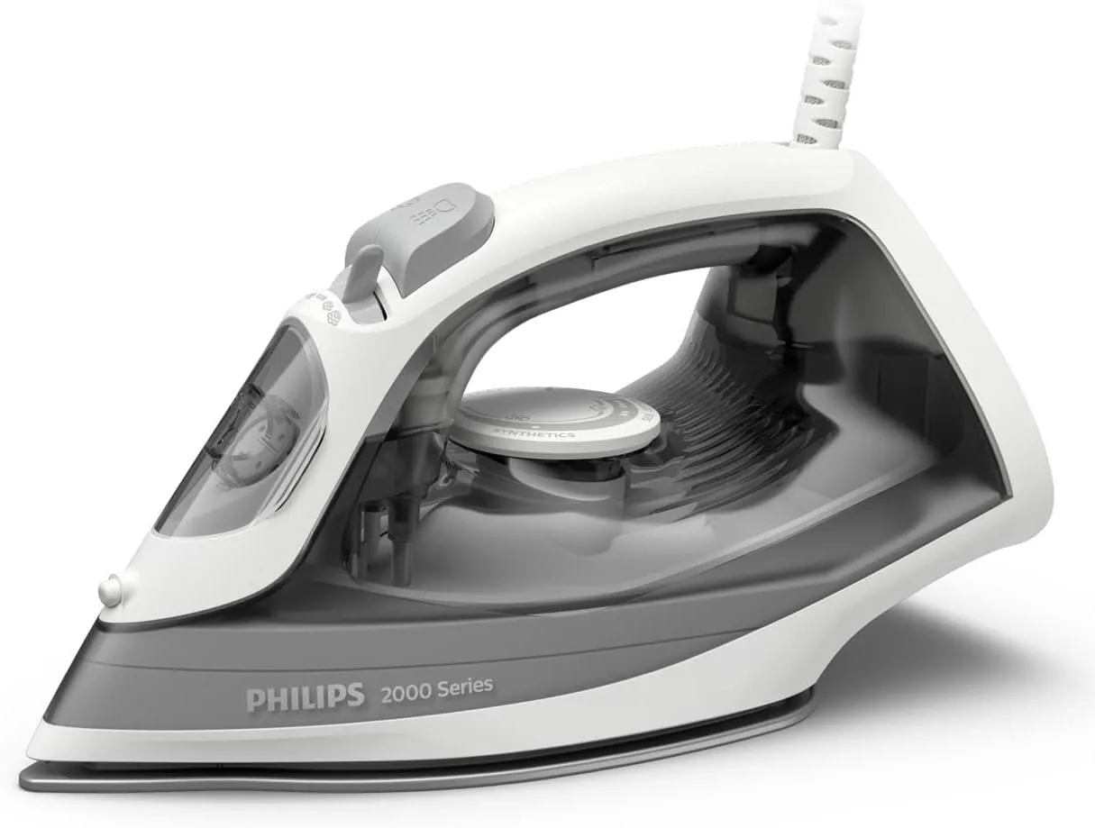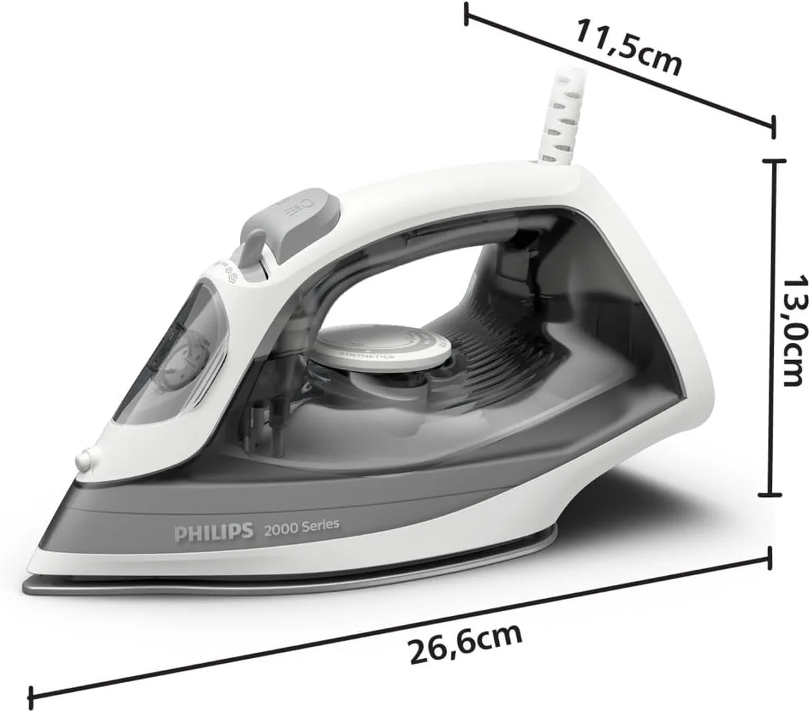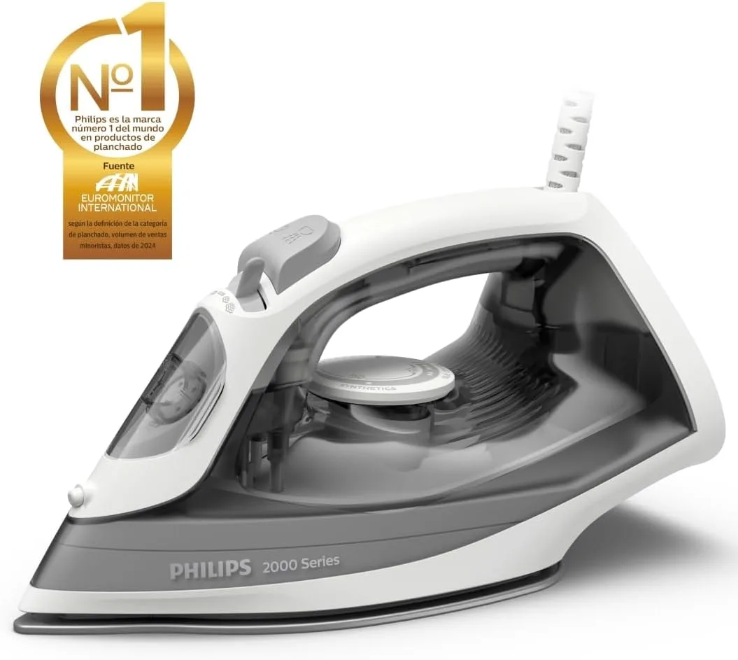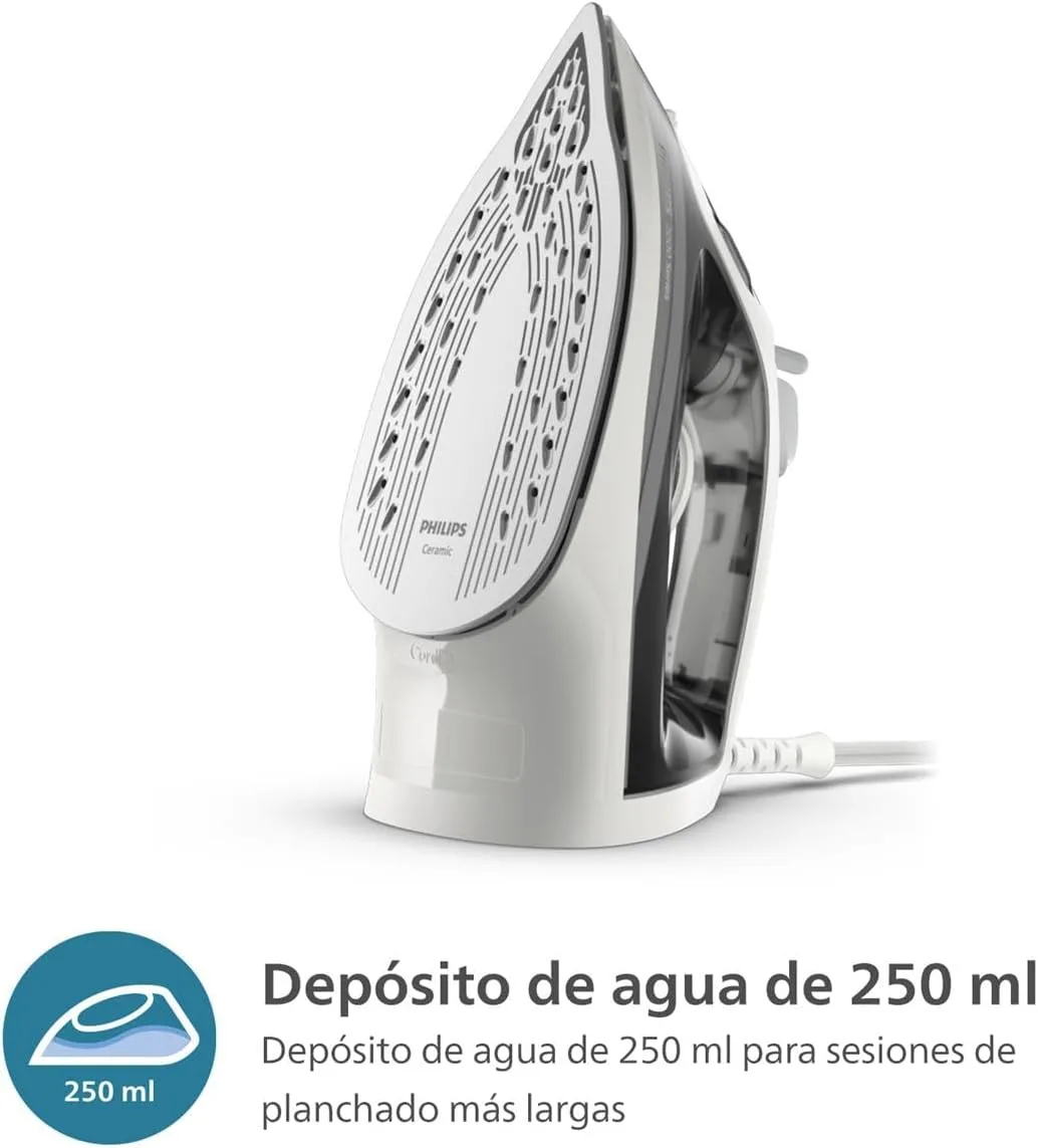 Resumen del producto: Philips Plancha de vapor Serie 2000 – Hasta 25 g/min de vapor continuo. 2000 W. Depósito de 250 ml. Eliminación rápida de arrugas. 4 ajustes de vapor. Suela de cerámica. Ligera. Gris (DST2020/80)
